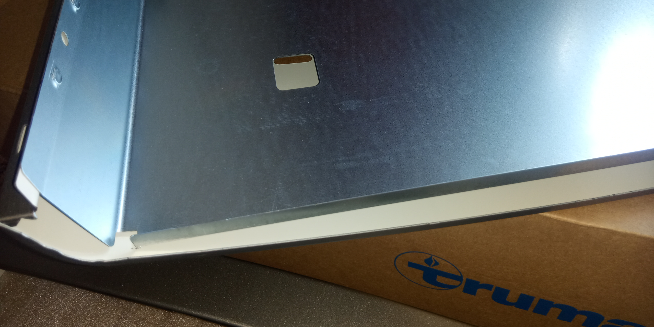 Górna część tylnej obudowy jest bardziej wysunięta nad piec aby (przypuszczam) chronić przed gorącem umieszczony powyżej plastikowy panel. W zależności w którą stronę będzie obrócony piec do usunięcia są zaślepki na pręt, rurę kominową i opcjonalnie Trumavent i Ultraheat.