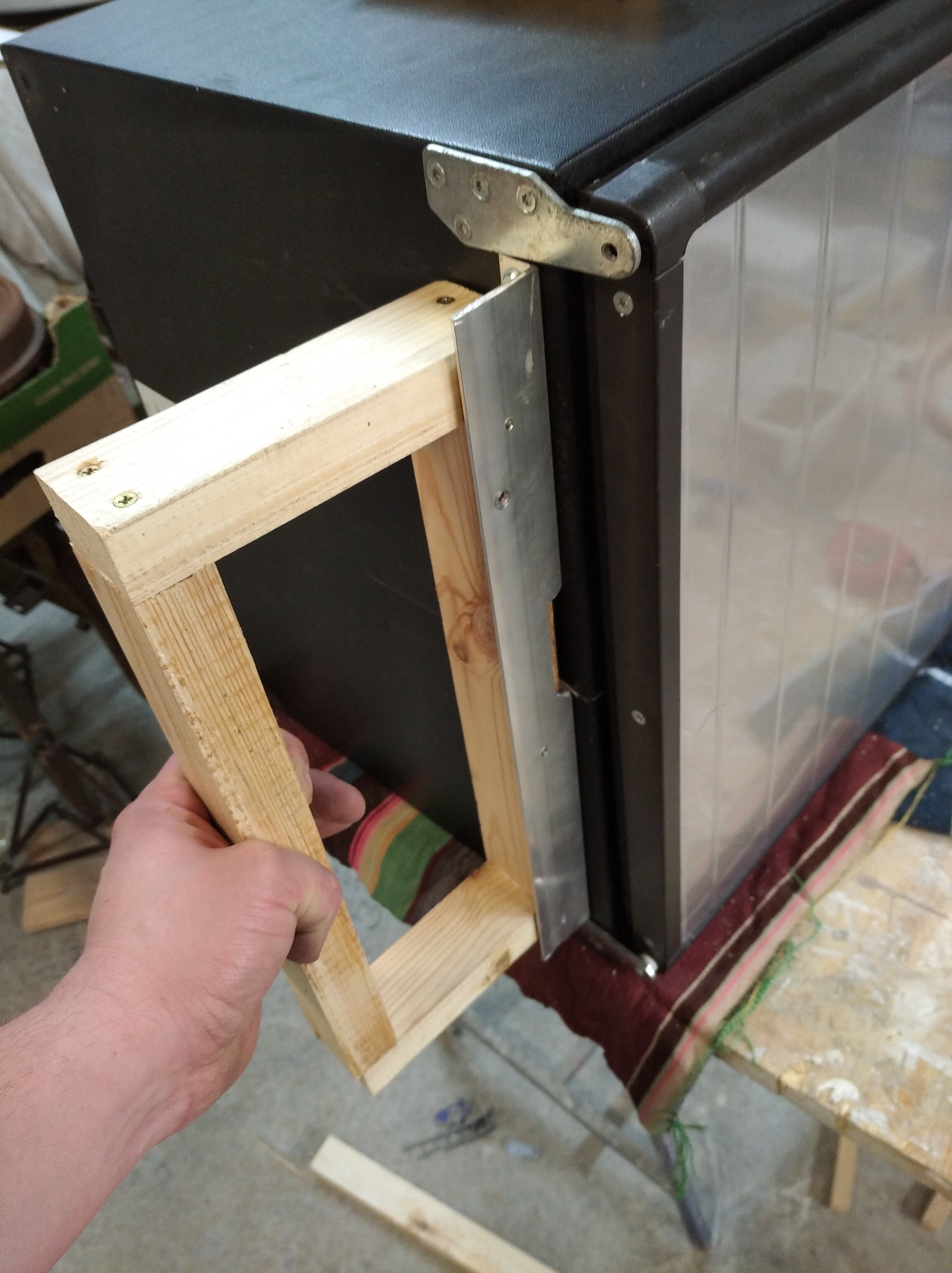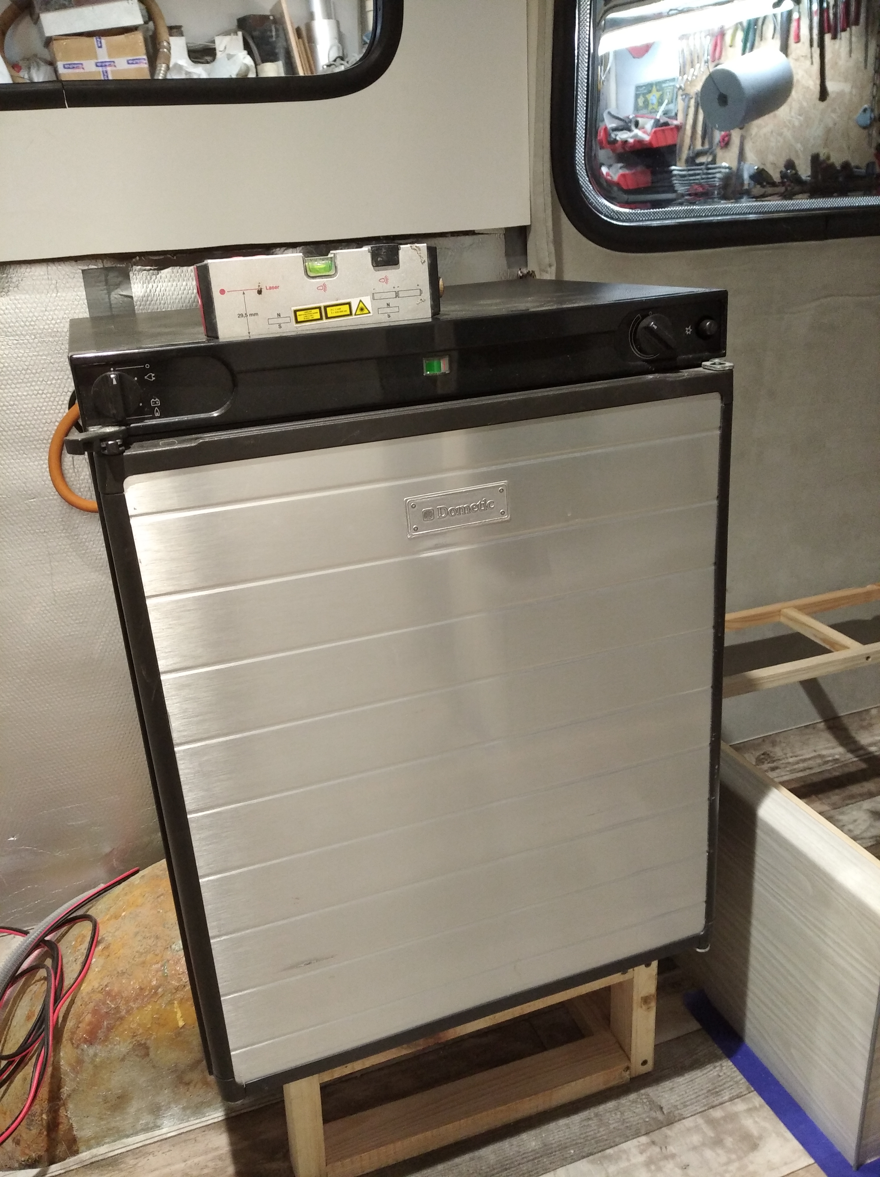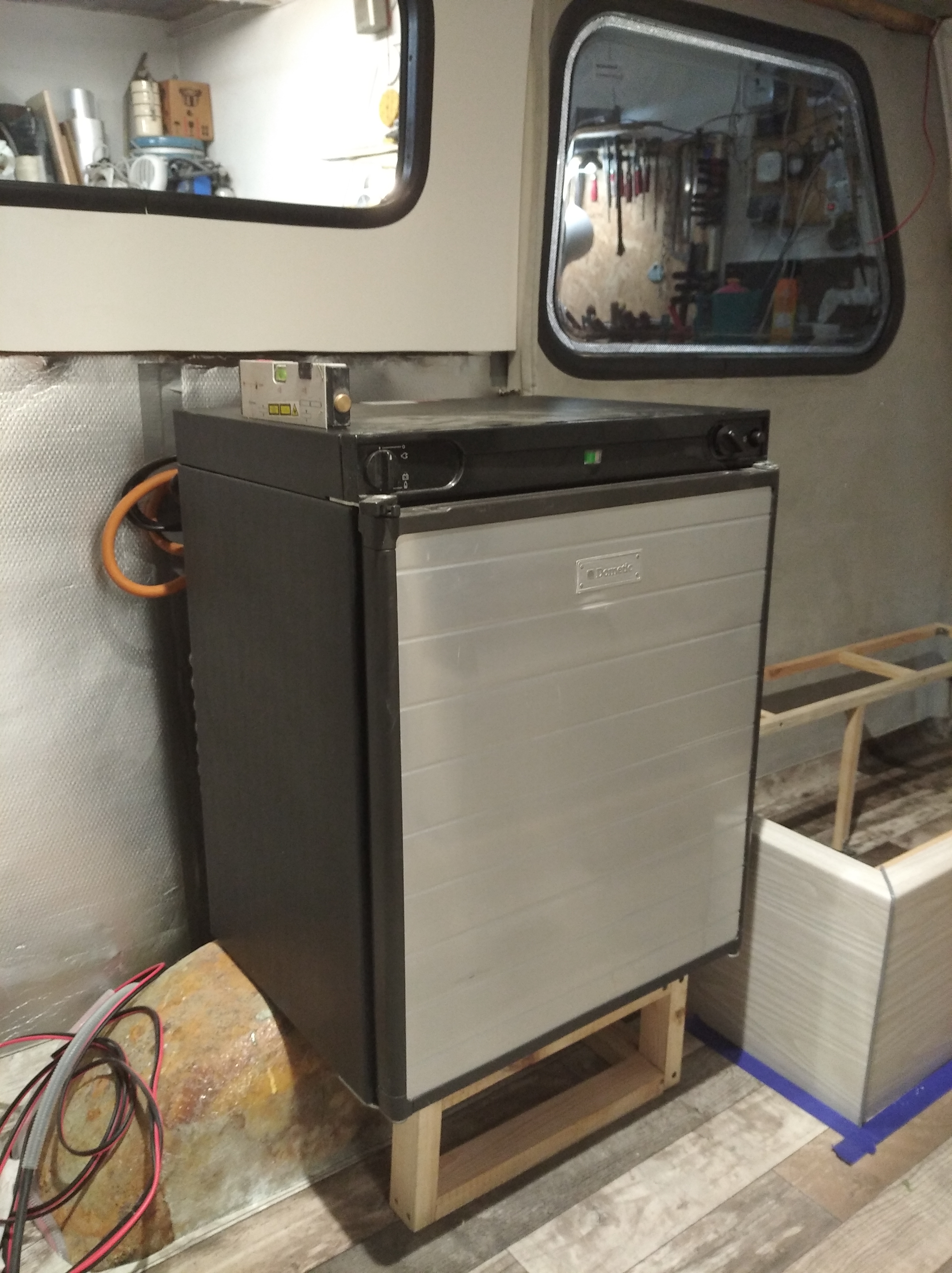 Zrobiłem podstawę dopasowaną wysokością do nadkola aby zamontować Dometica możliwie jak najniżej. Przy okazji stopki oryginalne wyleciały a w miejsce oryginalnych wkrętów zrobiłem mocowanie kątownika aluminiowego. Pomoże w ustabilizowaniu lodówki do stelaża.