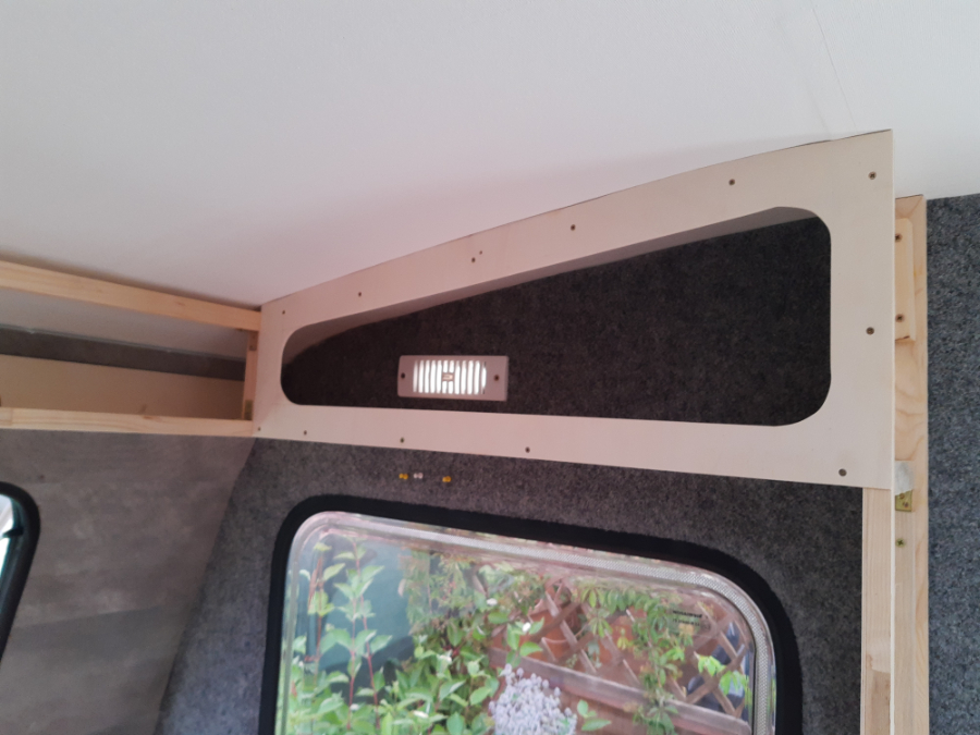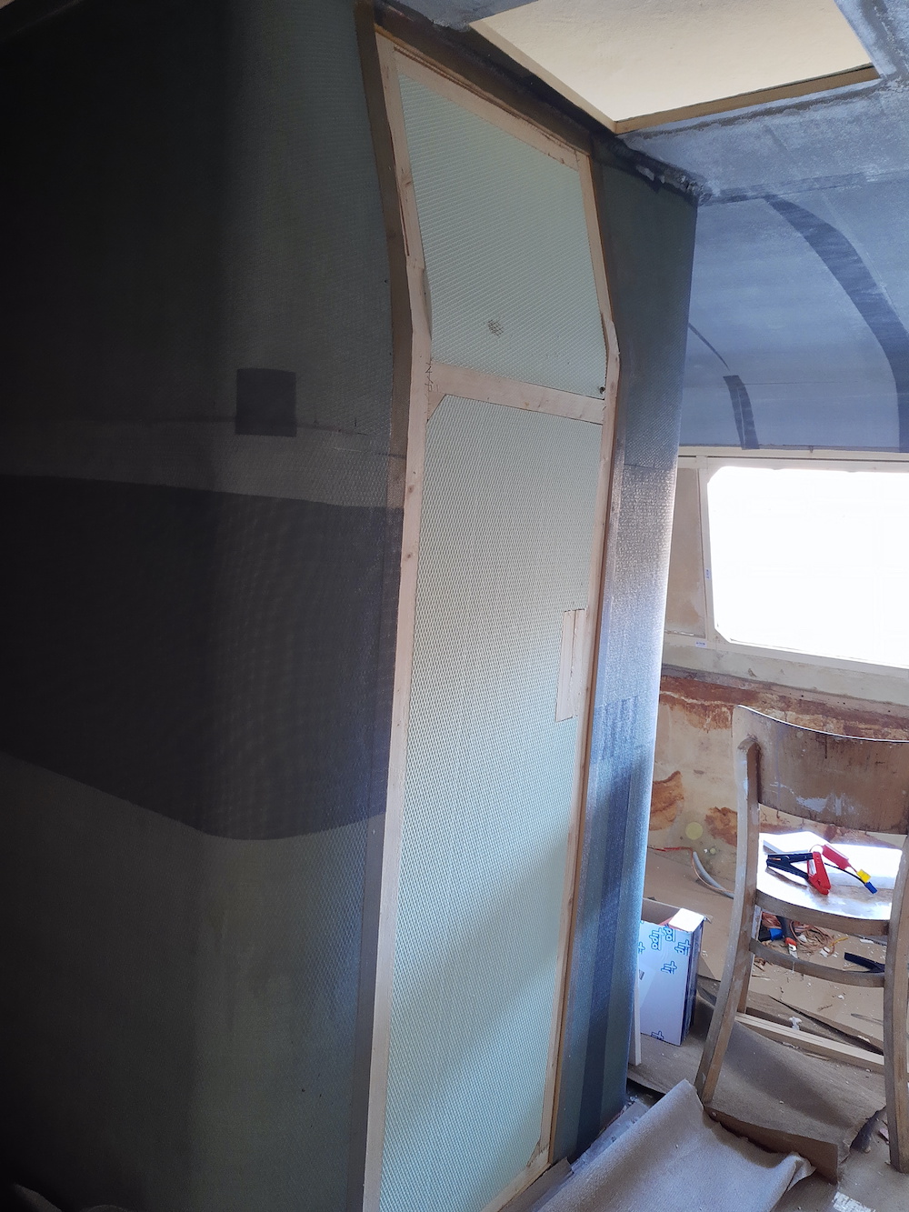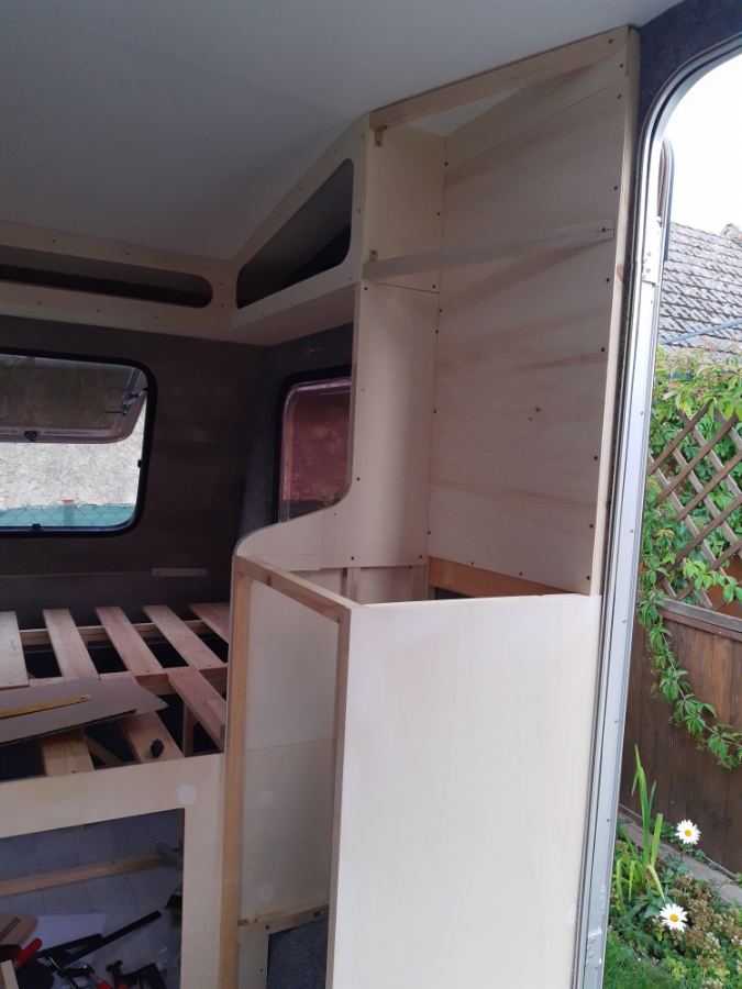 Po zamontowaniu ościeżnicy, co zajęło mi kilka godzin ze względu na krzywiznę laminatu, w końcu udało mi się zamontować drzwi. Niestety nie mam zdjęć ich konwersji, ale musiałem je wszystkie odkleić. Wymieniłem całe drewno w środku, naprawiłem i wzmocniłem pęknięty laminat, wypełniłem wnętrze styropianem, skleiłem klejem PUR i oczywiście pomalowałem. Wnętrze pokryłem wykładziną nośną, która znajdzie się również na ścianach bocznych.