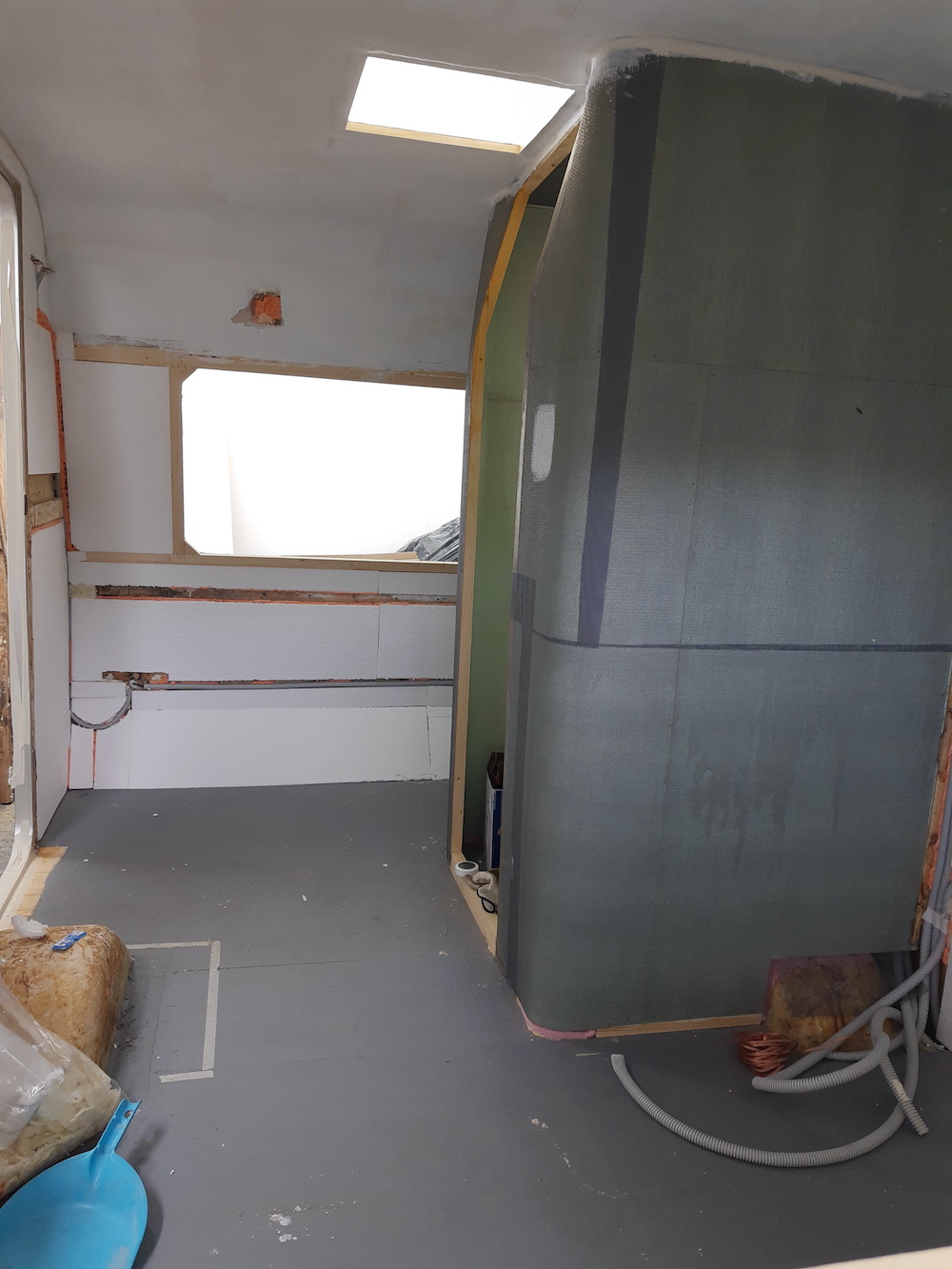 Czekając na wyschnięcie sufitu, stopniowo całą przyczepę wykładałem styropianem o grubości 1 cm. Jeszcze przed kompletną izolacją rozciągnąłem rury elektryka (w naszym kraju nazywa się to gęsią szyją) do wszystkich zaplanowanych przeze mnie miejsc + trochę na stanie.