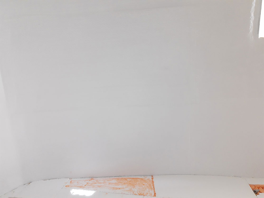 Zastosowany kolor to RL 9003 Signal white, który jest znacznie jaśniejszy niż oryginalny żelkot. Zdecydowałem się na montaż tylko jednej listwy, ponieważ nie chciałem robić kolejnych dziur w dachu. Połączenie dachu z bokiem wzmocnione jest trzema warstwami laminatu na zewnątrz i dwiema warstwami wewnątrz.