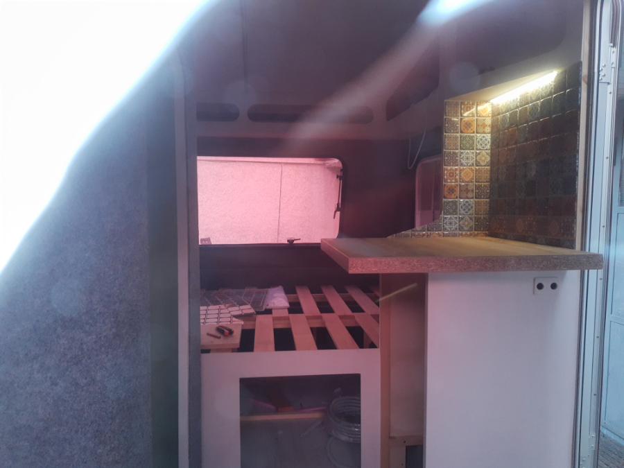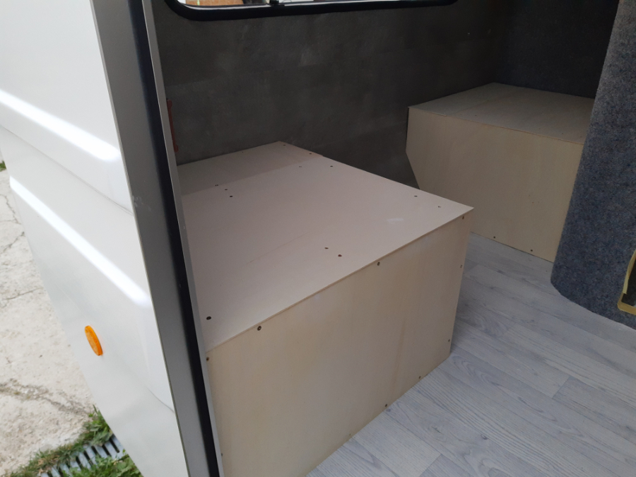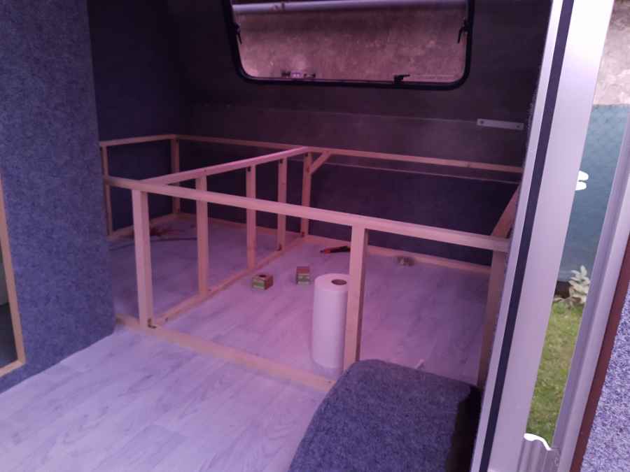Zmontowałem również podstawę dużego łóżka z listew 3x2 i 3x3. Celem było wykonanie łóżka o szerokości 140 cm, z jak największą przestrzenią do przechowywania i miejscem na szufladę z przodu. Ponieważ ogólnie w kamperze jest mało miejsca do przechowywania, chciałem maksymalnie wykorzystać obszar spania.