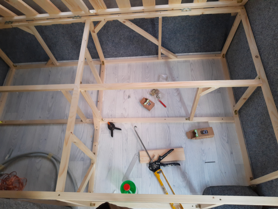 Po ułożeniu podłogi zabrałem się za montaż mebli. Z boku łóżeczka zmontowałem dwa pudełka z listewek 3x2cm, które okleiłem 3mm sklejką topolową. Całość skręcona śrubami i dodatkowo sklejona klejem PVA lub klejem PUR D4.