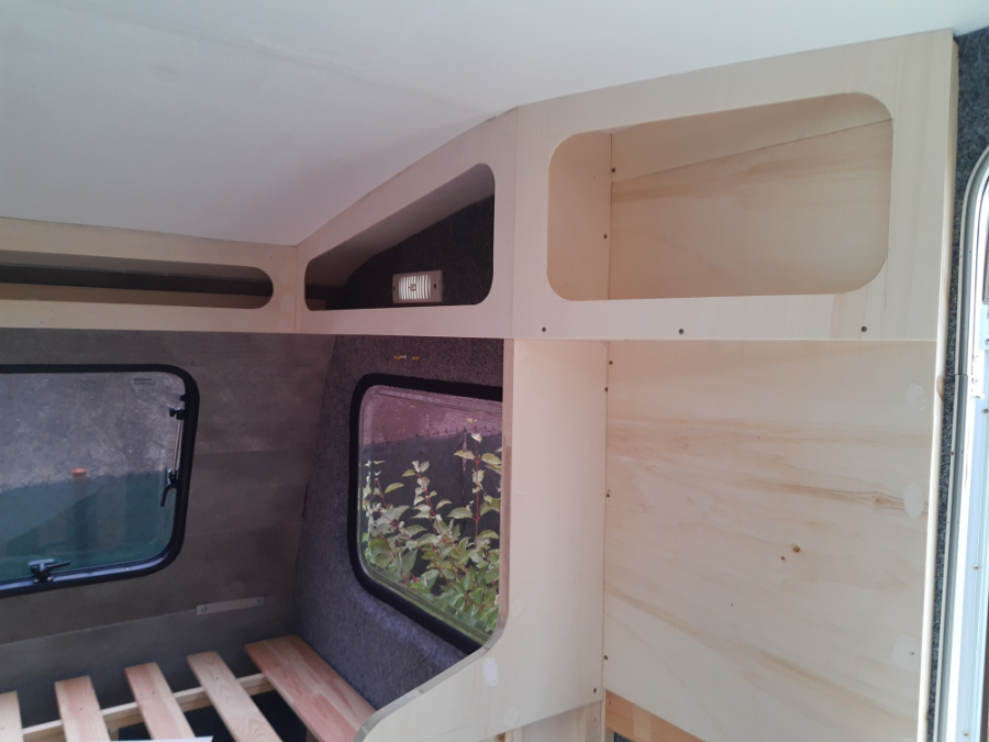 Kontynuujemy z półkami. Podobnie jak w przypadku konstrukcji łóżek wybrałem listewki 3x2 i sklejkę 3mm. Półki są otwarte i planuję je zamknąć tylko „zasłoną” ze skóry lub innego odpowiedniego materiału. Półki mocowane są w swoich pierwotnych miejscach, do nowo laminowanych listew.