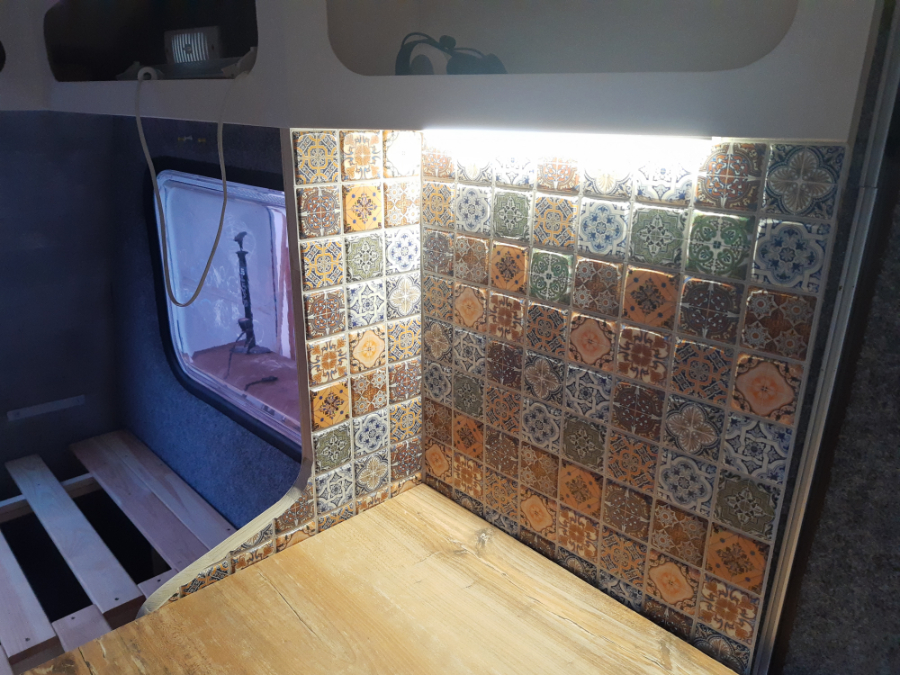 Po stwardnieniu żywicy epoksydowej mogłem przystąpić do układania płytek. Podobnie jak w kuchni zastosowałem boazerię z tworzywa sztucznego, która jest lżejsza od piórka, stosunkowo mocna i wodoodporna. płytki są klejone na mamutowy klej. Ważne jest, aby klej przyklejać wzdłuż pęknięć, ponieważ w przeciwnym razie będzie to widoczne z drugiej strony - zwłaszcza jeśli płytka jest biała.