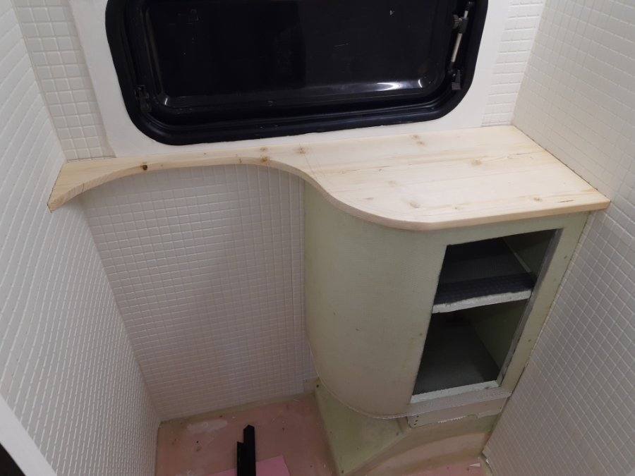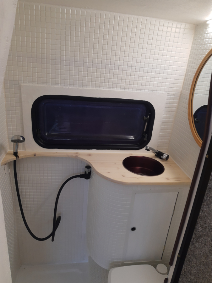 A na tych zdjęciach łazienka jest już w końcowym etapie, ale bez dekoracji. Rezultatem jest pełna łazienka z toaletą thetford, prysznicem, umywalką i szafką z dwiema półkami. Nawet przy moim wzroście 196 cm nie mam problemu z wzięciem wygodnego prysznica i to jest super w tak małej przyczepie.