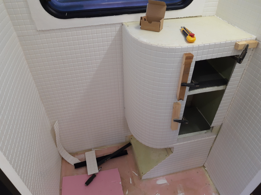 Po przyklejeniu boazerii i utwardzeniu kleju zabrałem się za składanie szafki. Do jej budowy ponownie użyłem styroduru profilowanego z płytkimi nacięciami od wewnątrz. Plan zakładał wykonanie wodoodpornej obudowy, która byłaby bardzo lekka i. jednocześnie nie będzie miała ostrych krawędzi.