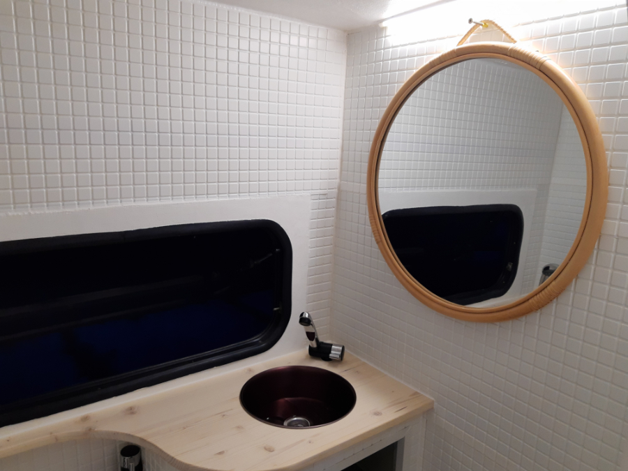Po wykończeniu wszystkich drewnianych elementów we wnętrzu zabrałem się za ostatnią część - łazienkę. Przed tym krokiem cieszyłem się największym szacunkiem, miałem wiele pomysłów i na koniec mogę powiedzieć, że nie wyszło źle.