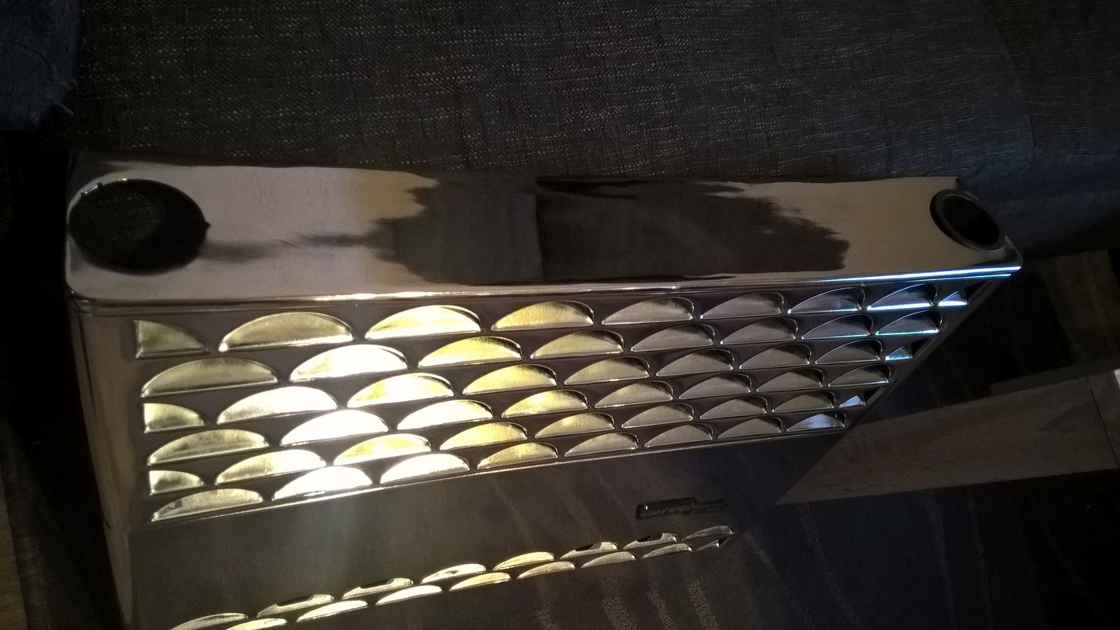 Podłączyłem więc zlew tzn. rurki dolotowo/wylotowe. Wylotowa trochę mi się zaginała pod odpływem, ale kawałek węża harmonijkowego załatwił sprawę i zrobił ładny wylot pod kątem 90 stopni. A najfajniejszą nagrodą było odebranie przedniej obudowy trumy od... "malowania" niklem ;-) Z racji, że nie mam dostępu do lakierni proszkowej, a mam znajomego galwanizera, postanowiłem "przetrzeć" nowy szlak i zaryzykowałem chromowanie. Wyszło bardzo ładnie, świeci się, jak nie powiem co.
