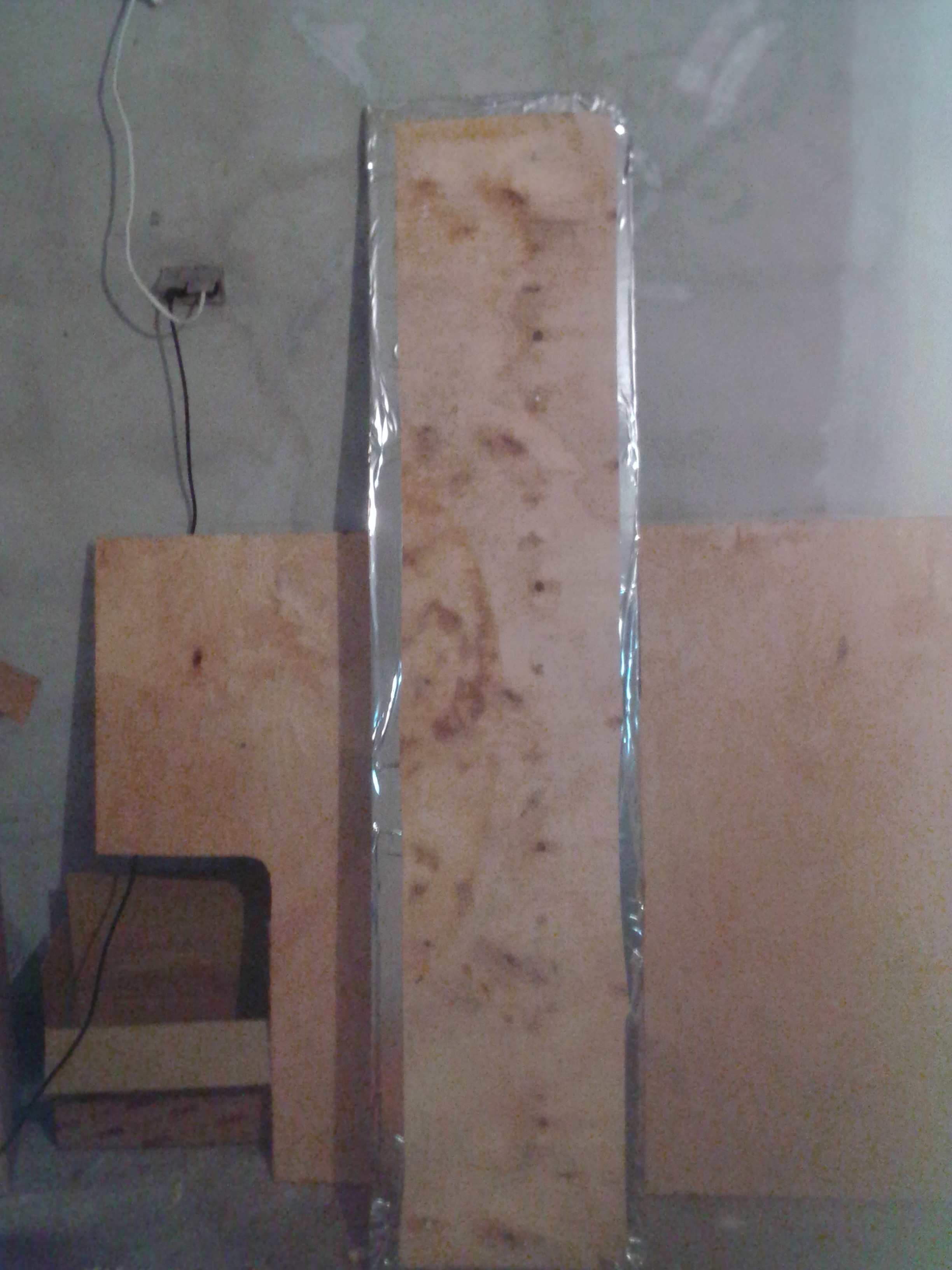 Sama sklejka podłogowa od strony spania polakierowana, i oklejona folią NRC od spodu. Zastanawiałem się czy dać folię pod linoleum czy pod płytę, dałem pod płytę - nie wiem na ile sama sklejka osłabi działanie folii, zobaczymy.