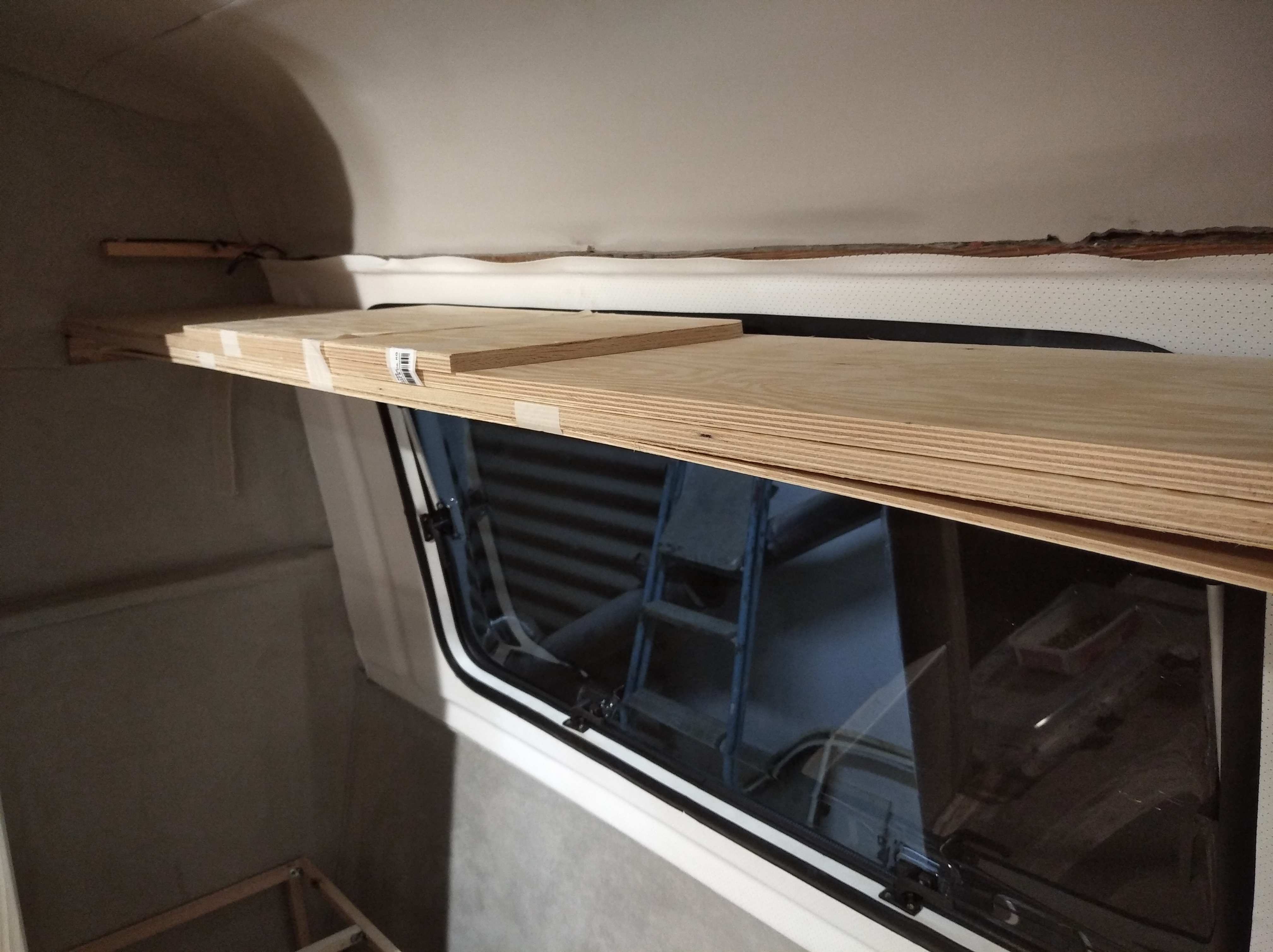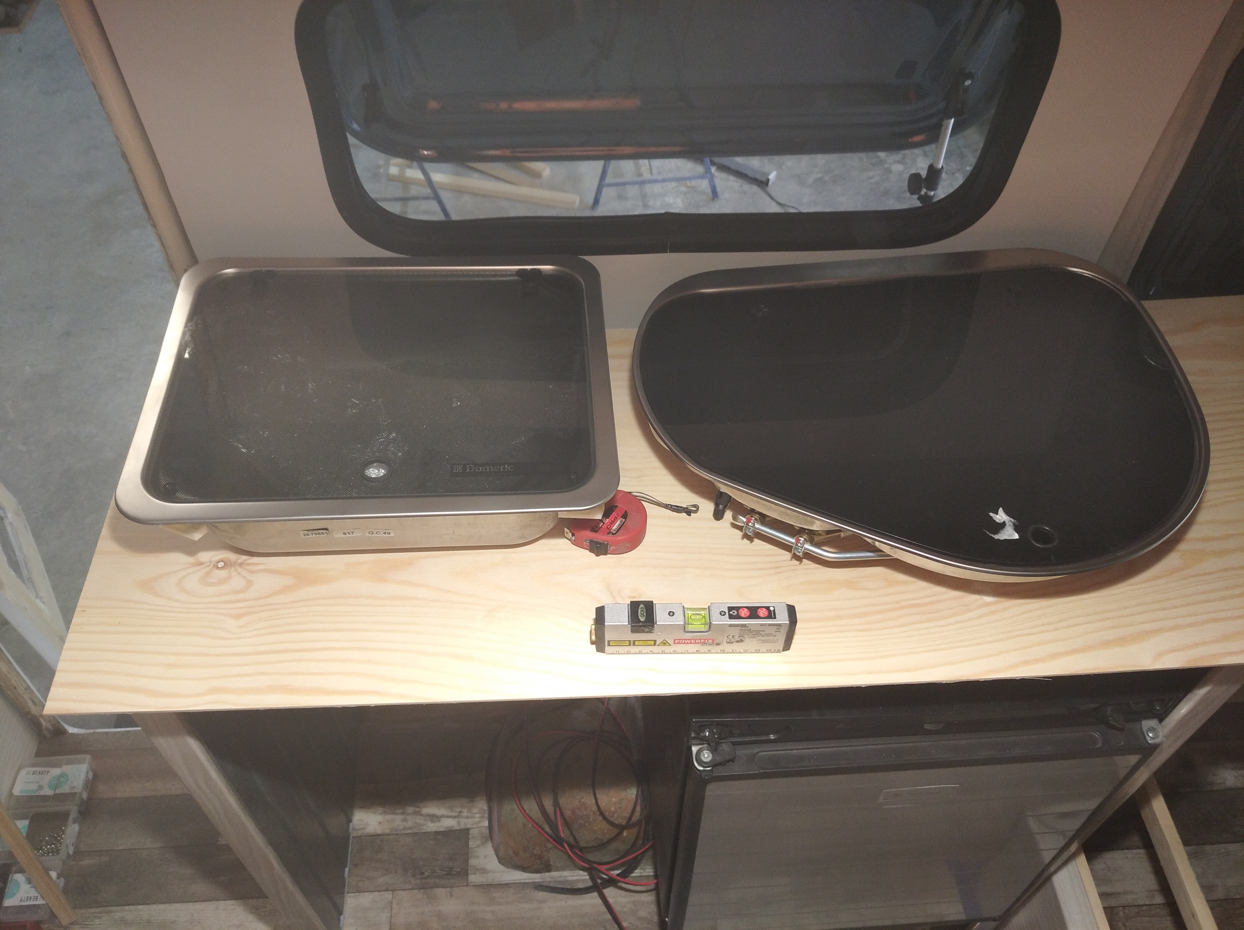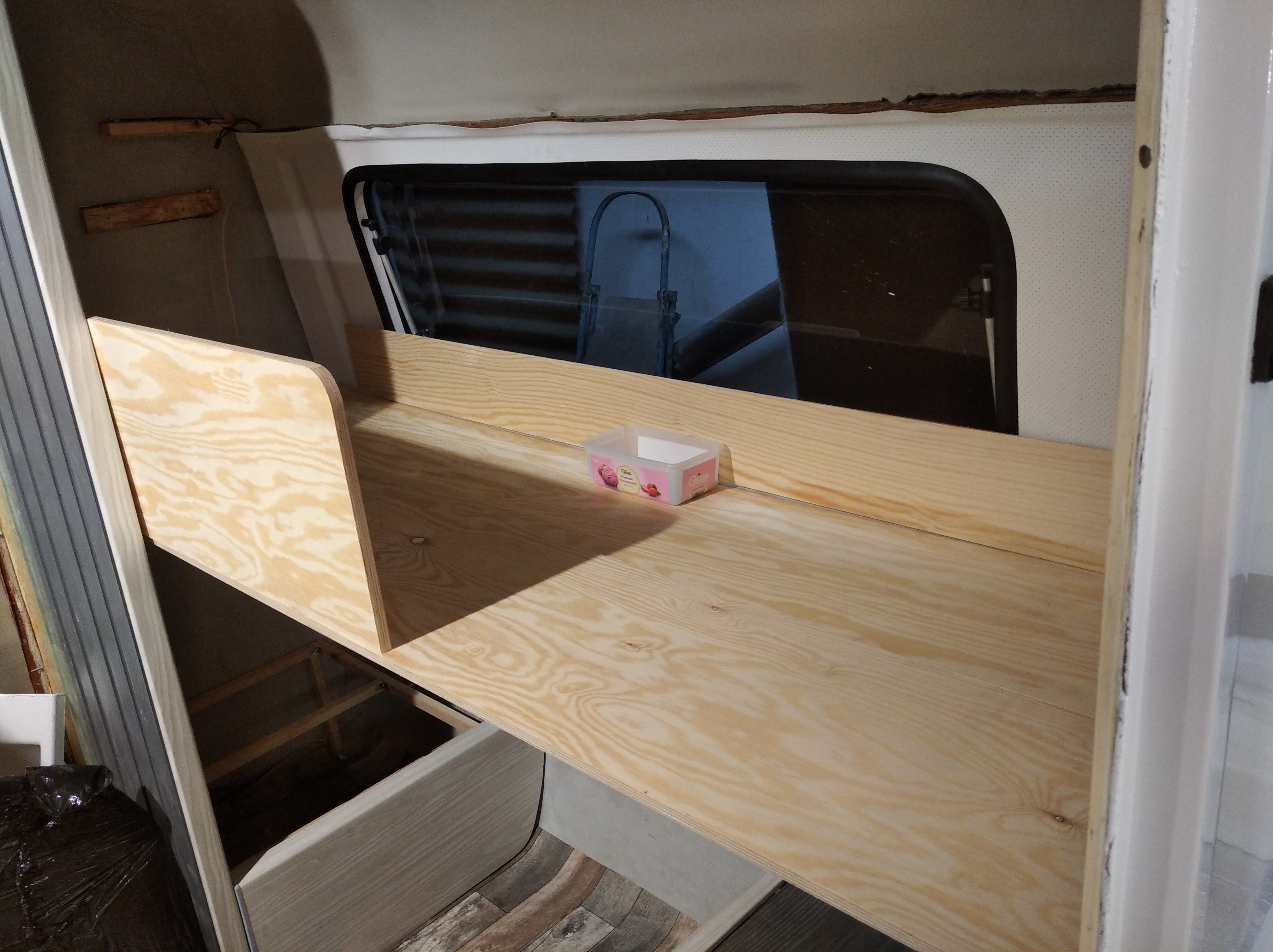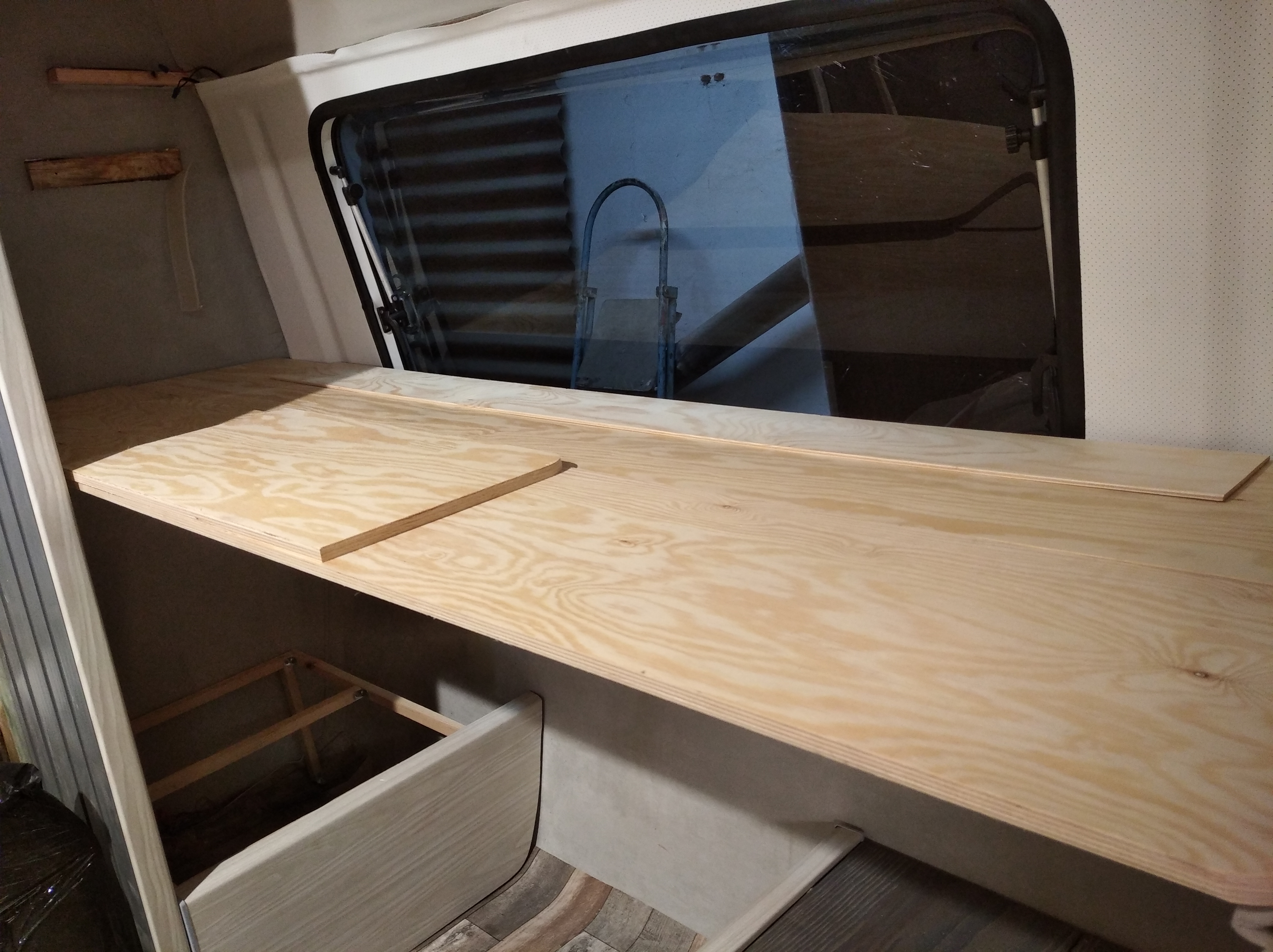 Blatu roboczego za dużo tu nie będzie, dlatego sprzęty są wszystkie z szybami. Zawsze można z nich korzystać. Rozważam też zrobienie na jednym boku rozkładanego kawałka blatu ale to zobaczymy czy będzie taka potrzeba. Prewencyjnie po obu bokach od wewnątrz bocznych parapetów wlaminuję kawałki sklejki żeby można było się "dokleić" z stopką blatu w dowolnym miejscu. Opcjonalnie pod ręką będzie mały stolik na przodzie przyczepy.