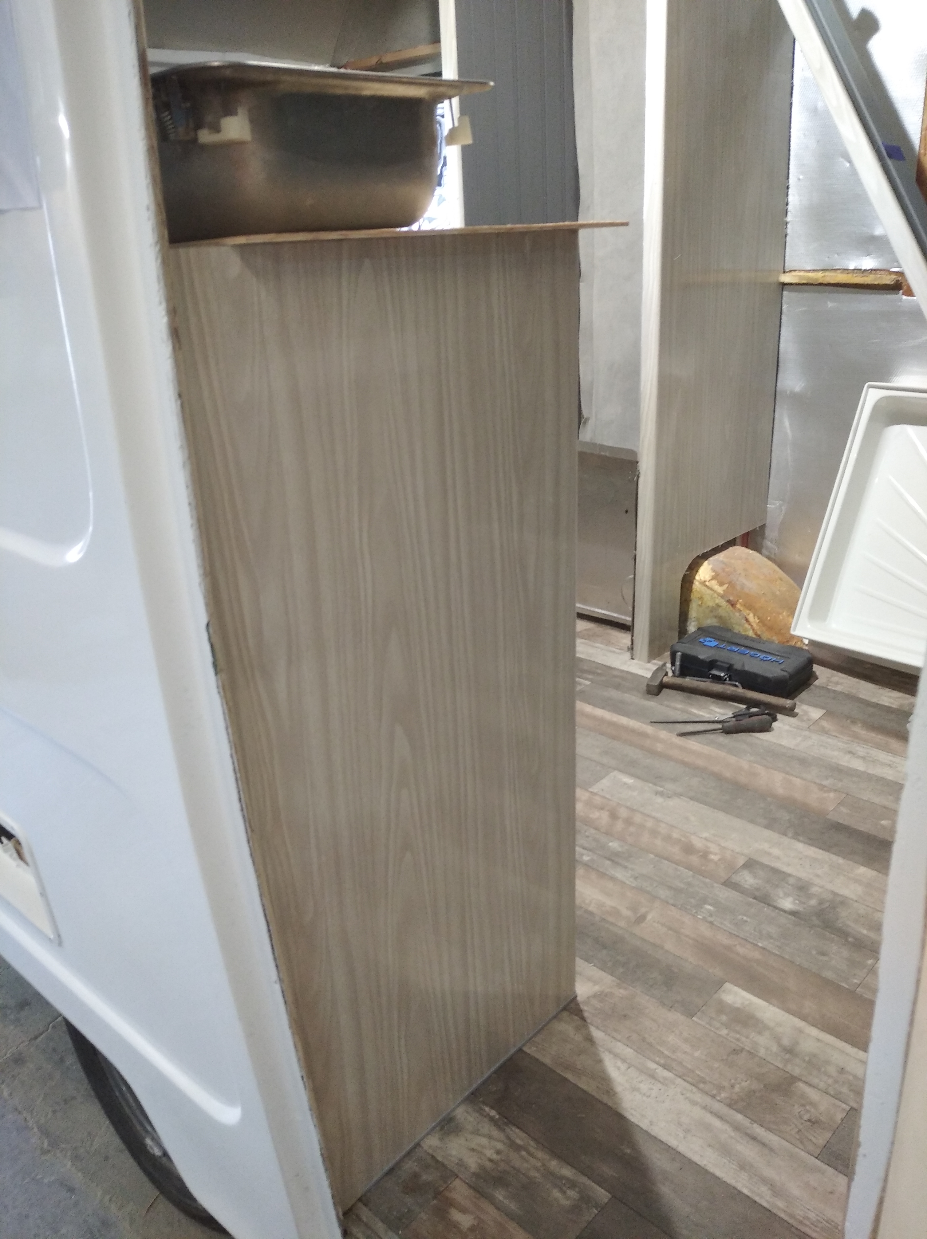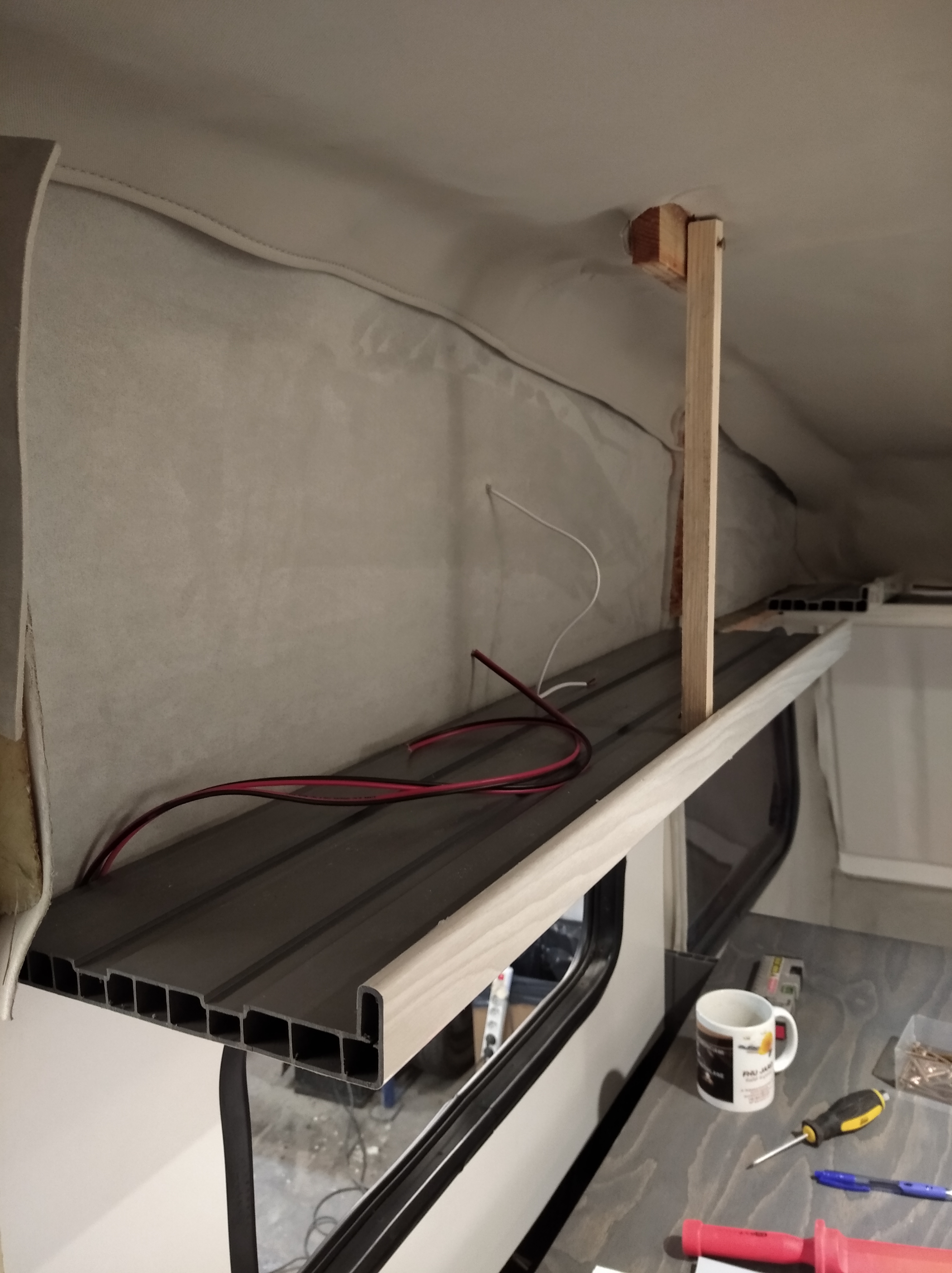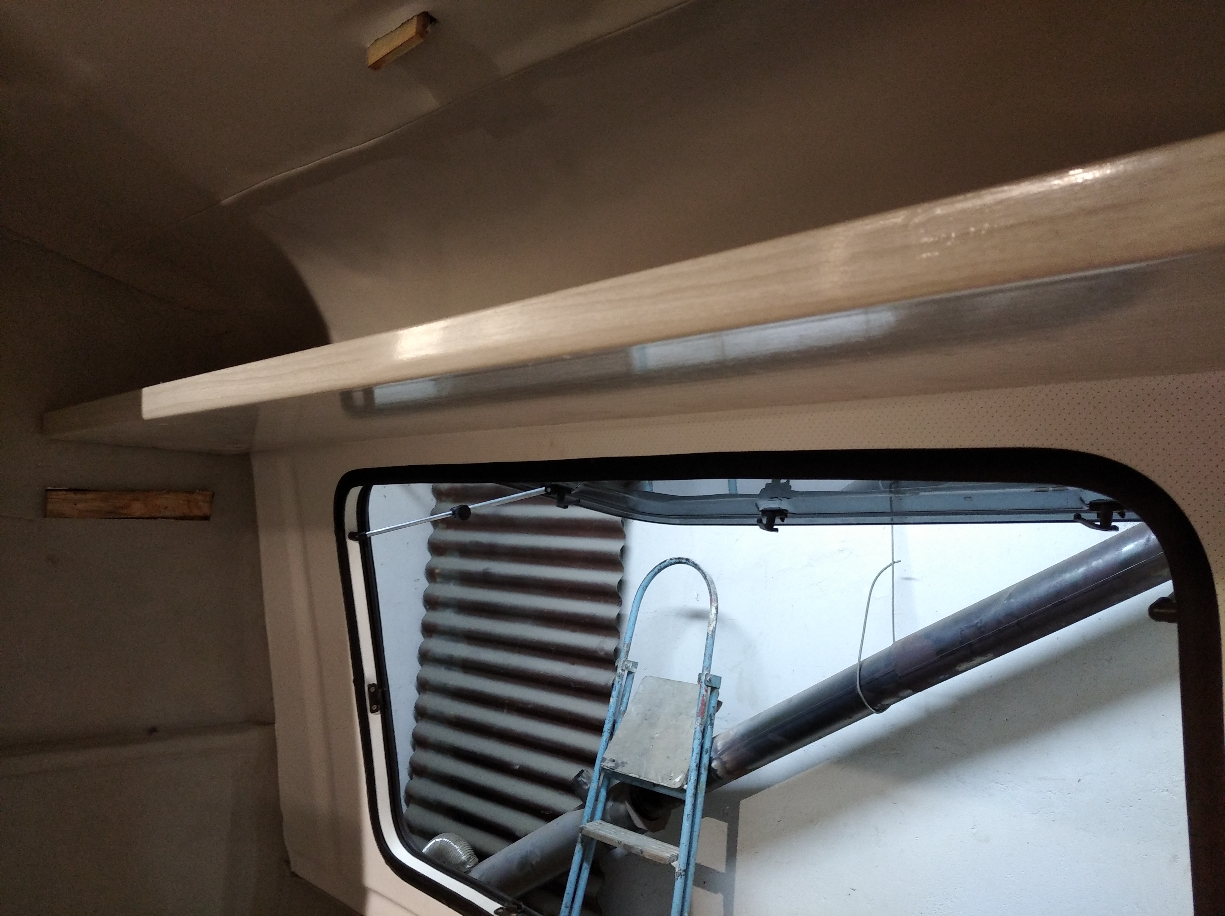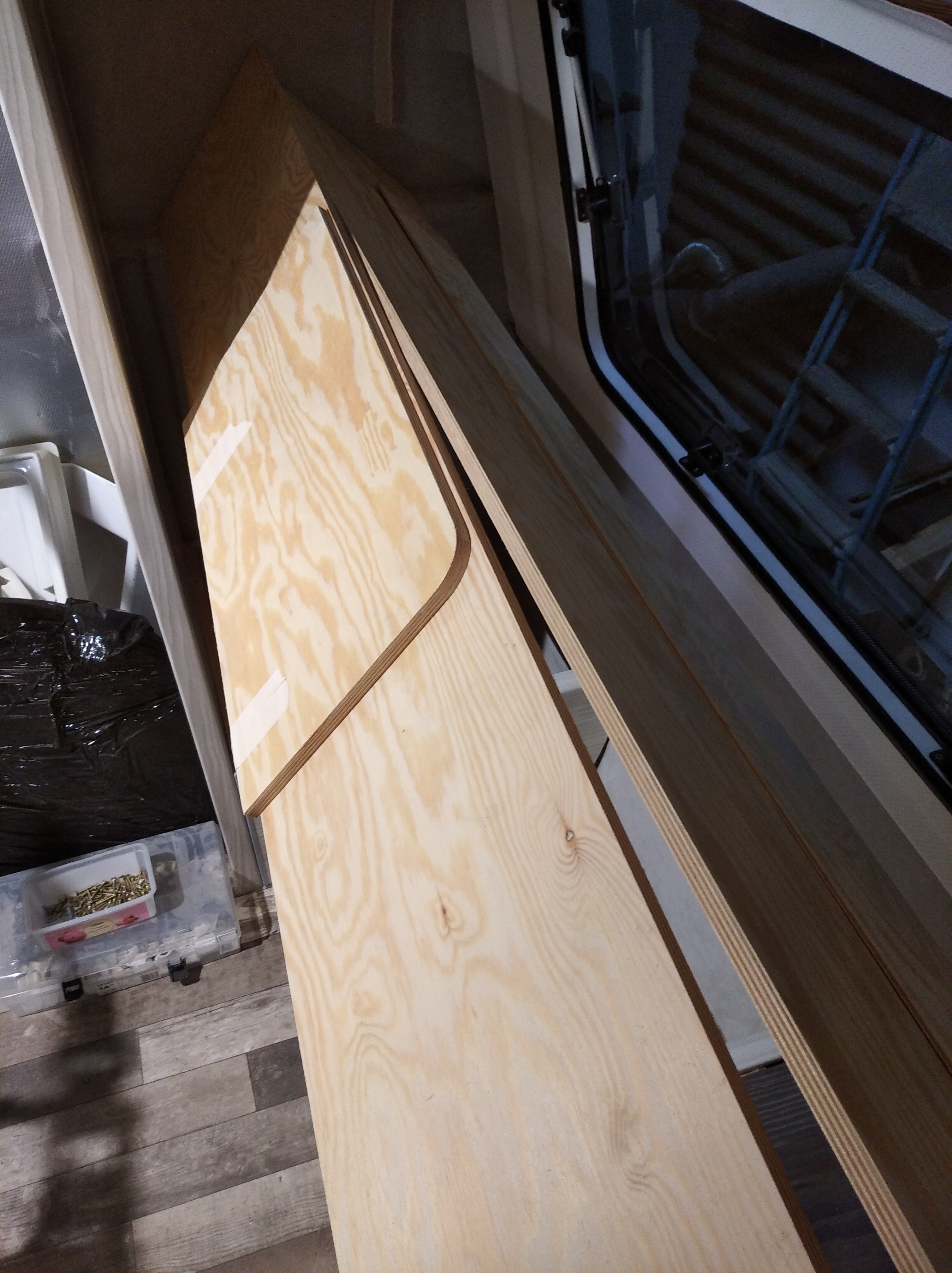 Blatu roboczego za dużo tu nie będzie, dlatego sprzęty są wszystkie z szybami. Zawsze można z nich korzystać. Rozważam też zrobienie na jednym boku rozkładanego kawałka blatu ale to zobaczymy czy będzie taka potrzeba. Prewencyjnie po obu bokach od wewnątrz bocznych parapetów wlaminuję kawałki sklejki żeby można było się "dokleić" z stopką blatu w dowolnym miejscu. Opcjonalnie pod ręką będzie mały stolik na przodzie przyczepy.