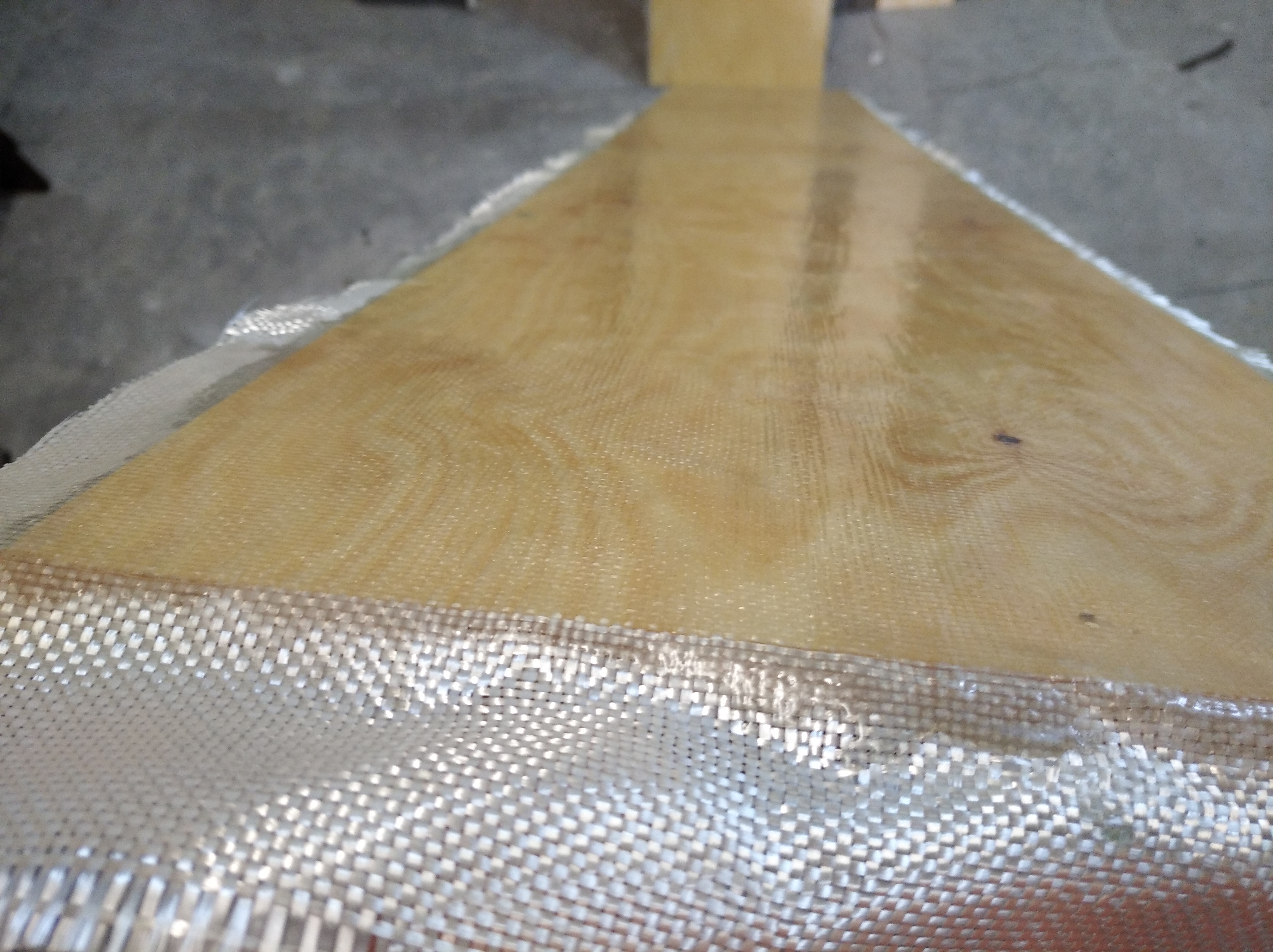 Zalaminowałem obustronnie płyty ze sklejki na górne łóżko. Żywica poliestrowa i mata rowingowa 450g/m2.
