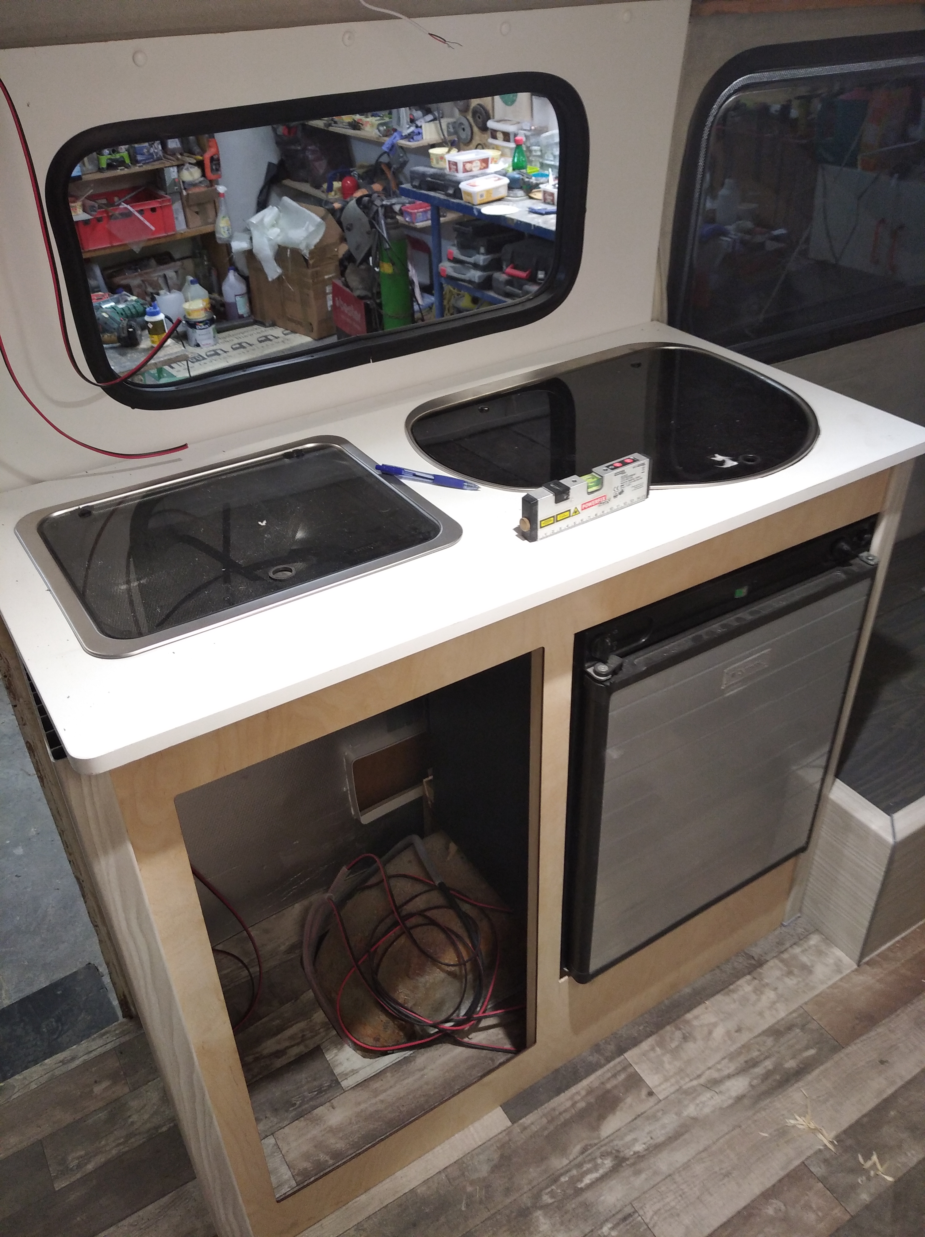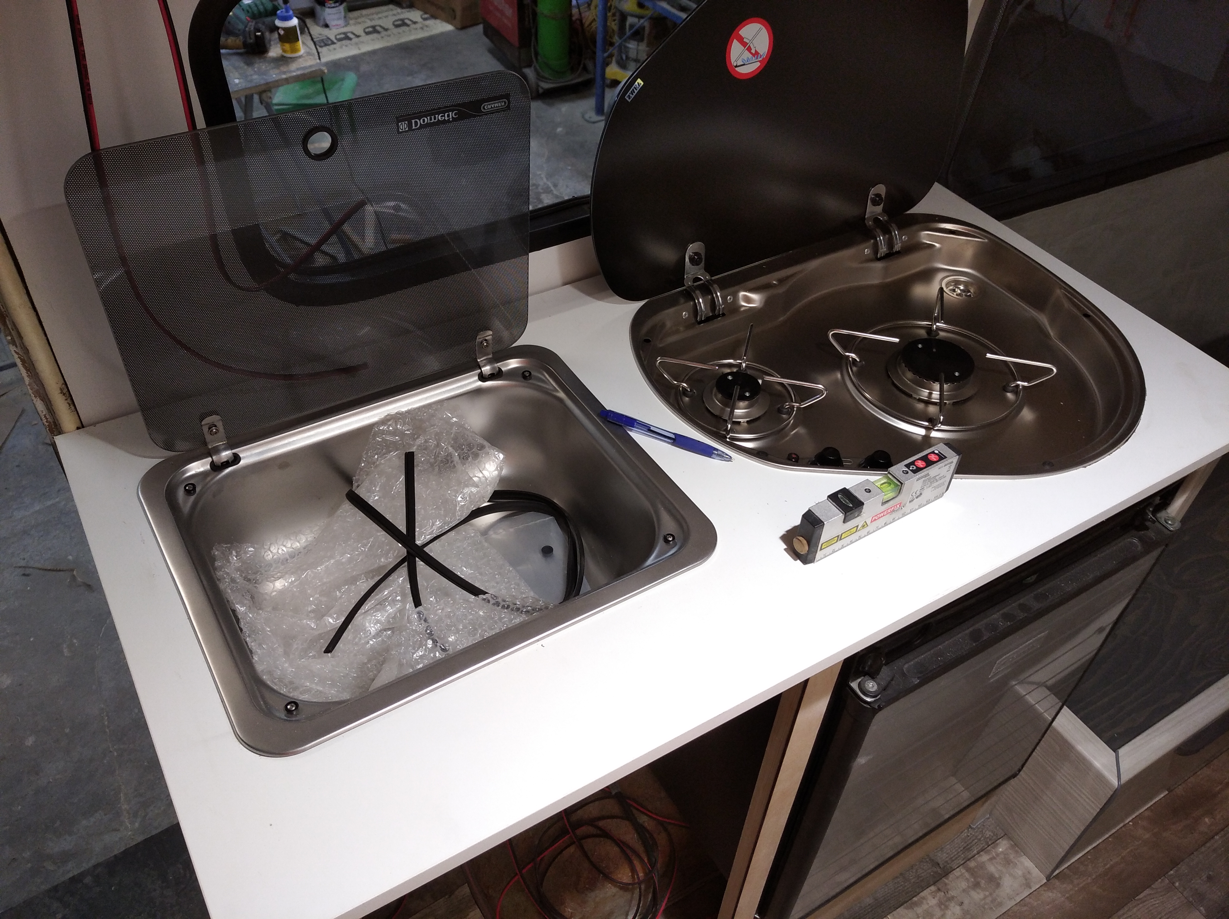 Wyciąłem też w dostarczonym blacie kuchennym otwory i osadziłem wstępnie zlew i kuchenkę.