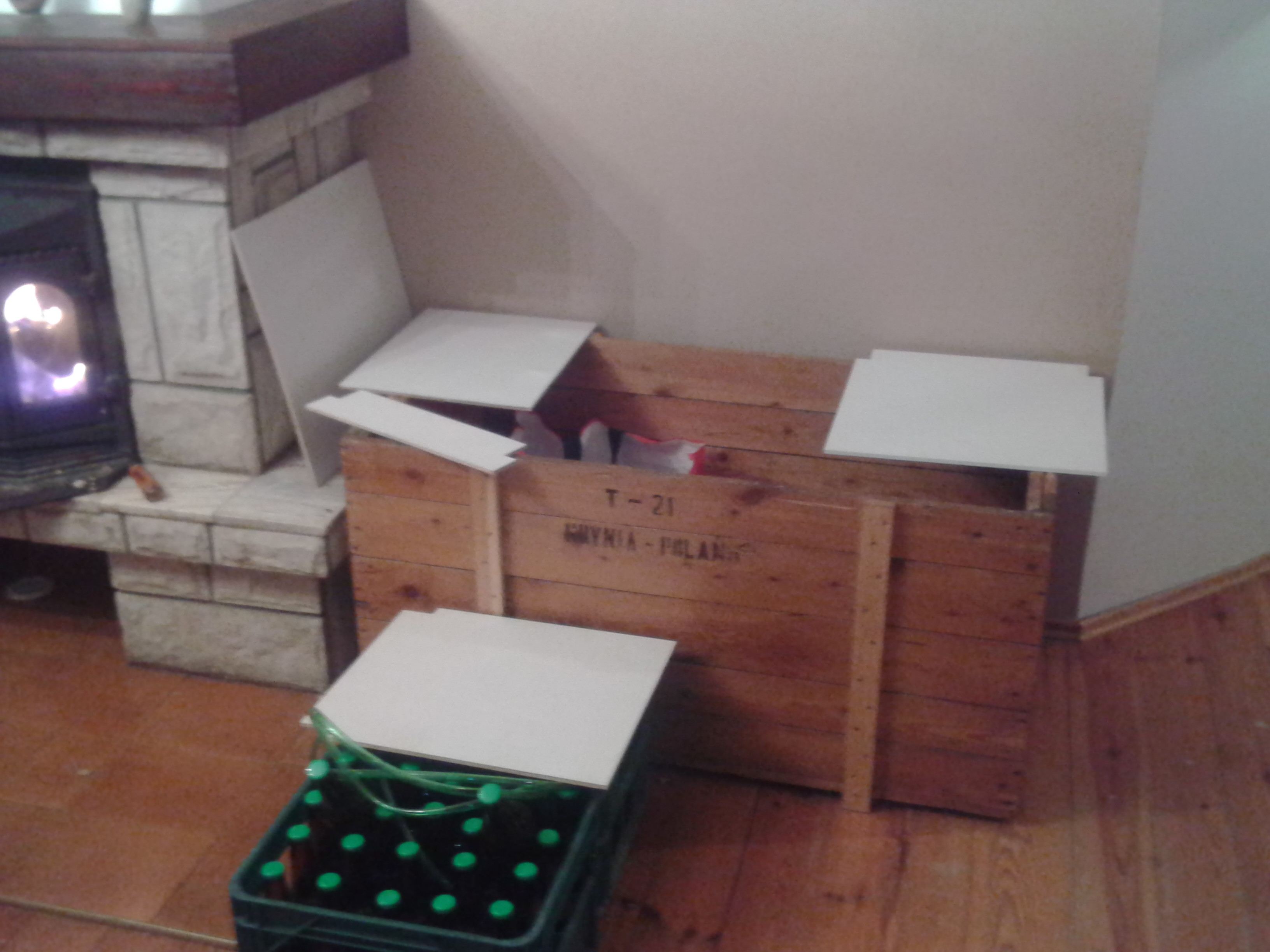 No, ja zamiast szykować się do zimy i nosić przywiezione drewno które moknie na podwórku, dorabiam i maluję na biało nowe półki do szafy. Stare półki idą won, bo jak doszedł grzejnik to dolna półka oryginalna nijak nie pasuje, a górną wymieniam na grubszą sklejkę (6,5mm), bo ta co wcześniej wstawiłem jest zbyt wiotka po cięciu szafy. Dodatkowo między górną półkę a sufit szafy wstawiam jeszcze jeden poziom, tak aby były 2 niskie górne półki i dolna z wyższą przestrzenią na bardziej gabarytowe ciuchy.
