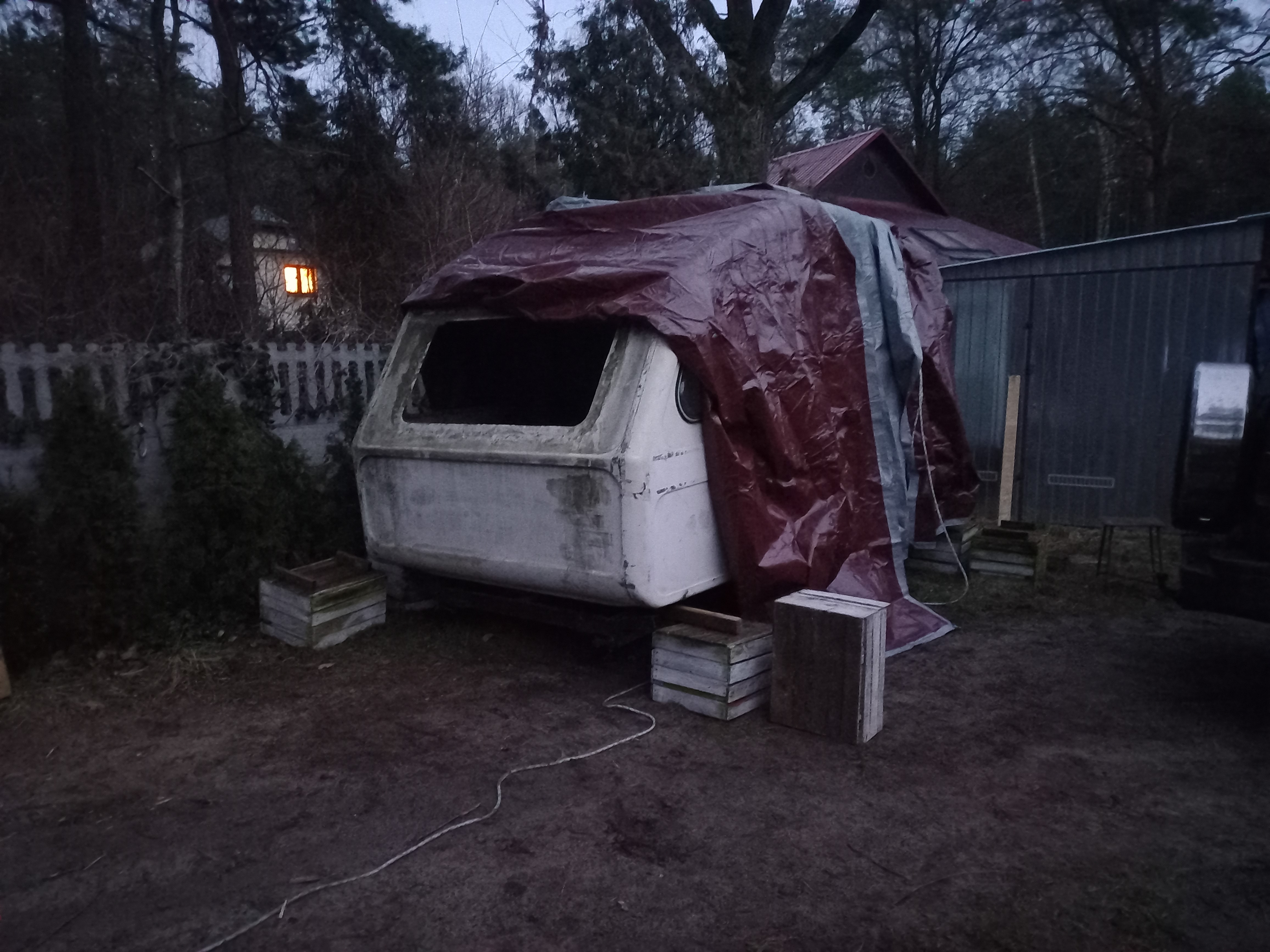 Przy okazji miałem możliwość podźwigać nieco budę. Aby wyjąć ramę podnosiłem ręcznie po kolei każdy narożnik podstawiając skrzynki.