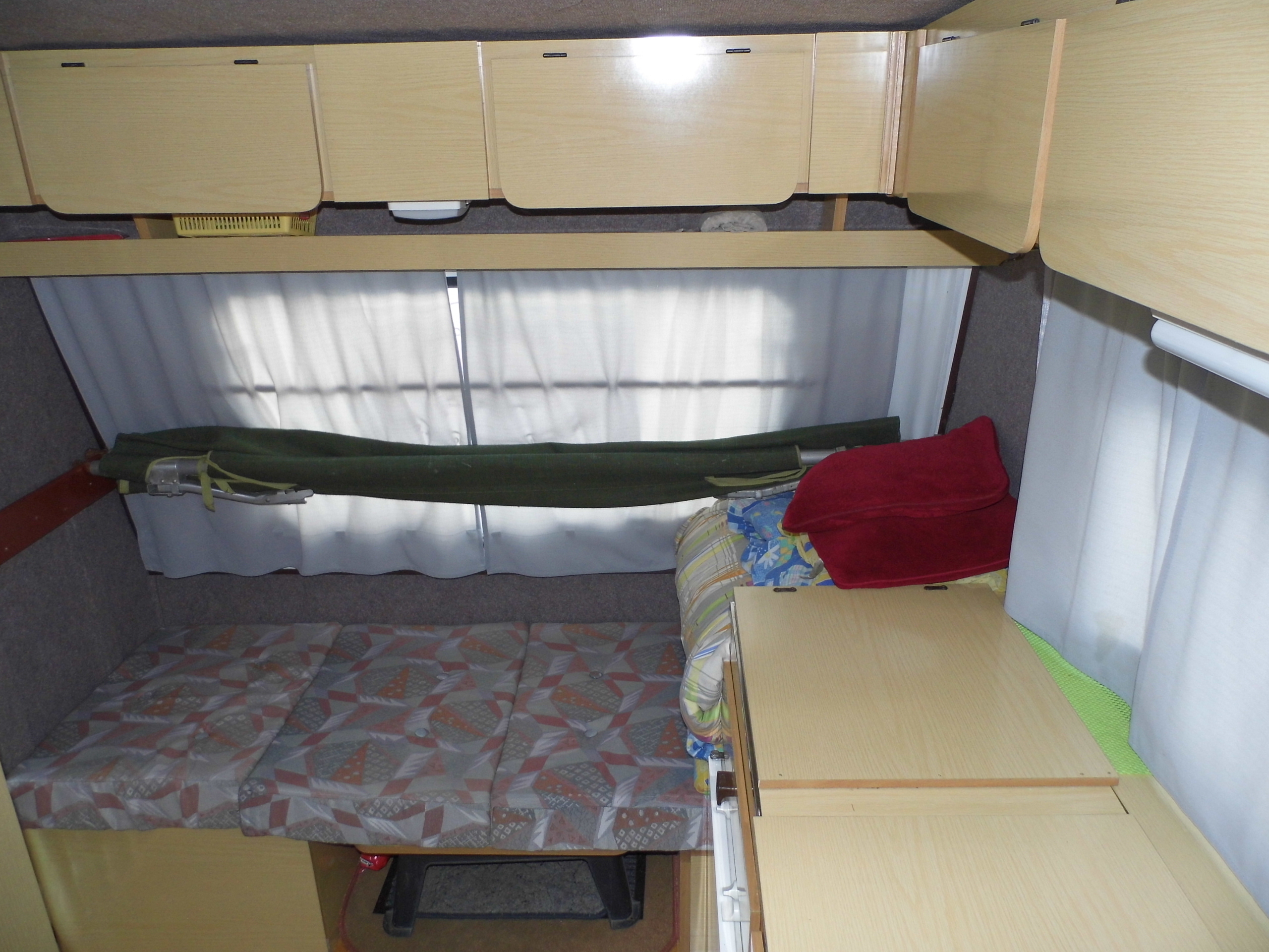 Zgodnie z wcześniejszymi planami, w miejscu tradycyjnego hamaka zostały zainstalowane nosze wojskowe które mają dużo większą wytrzymałość (testowałem osobiście :lol: ) ale jednocześnie posiadają rozpórki rur nośnych co powoduje że materiał na noszach jest cały czas napięty. Zamiast oryginalnych uchwytów (niedostępne) zastosowałem deski w których są zrobione gniazda na rączki noszy. Nosze mogą być rozłożone (do spania) ale na dzień można je złożyć tzn zsunąć pod okno i wówczas możemy korzystać ze stolika "kawowego" po złożeniu łóżka dolnego lub jadąc w trzy osoby całkowicie usunąć z przyczepy. W chwili obecnej 10 dni testów i wszystko jest w porządku.