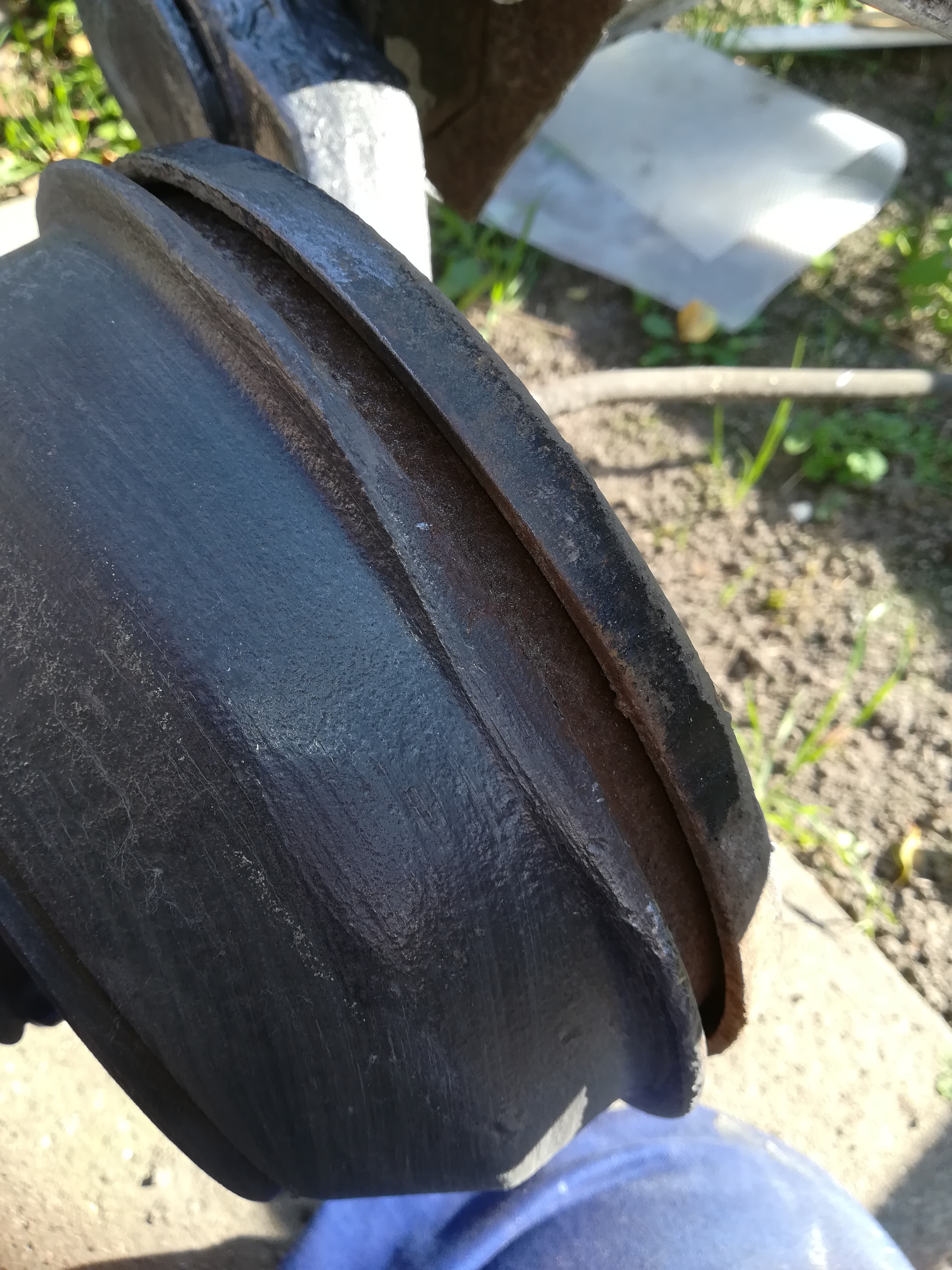 W międzyczasie jak schła szpachla i żywica postanowiłem ogarnąć bębny. Zostało mi trochę hammeraida więc chciałem pomalować. Lewy bęben okazał się zgniłym jajem. Nie wiem, ale chyba zdrowo musiał szorować po autostradzie.