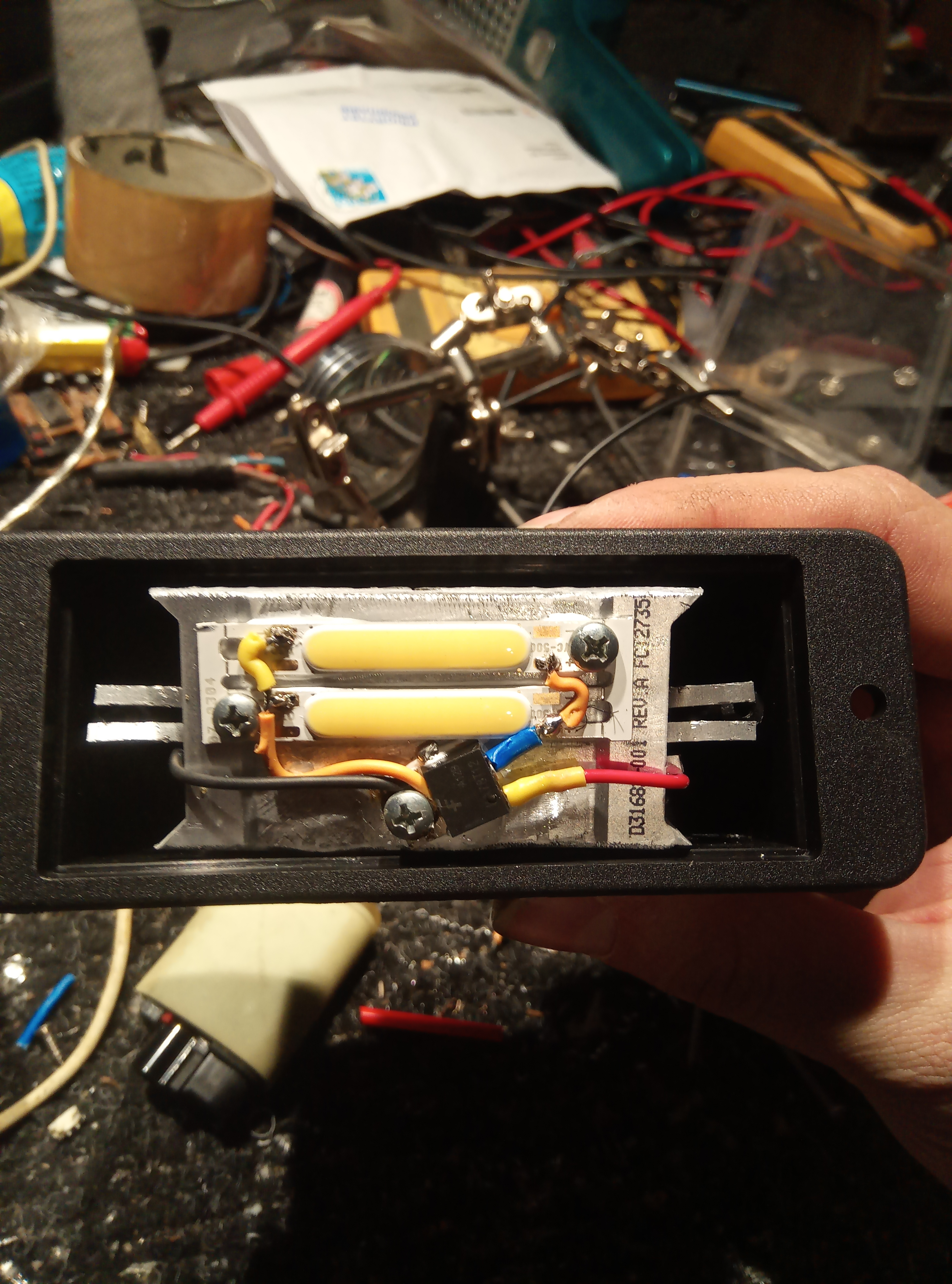 Tak się prezentują ,,bebechy,, 2x4,5w dioda cob, i stabilizator/regulator (?) napięcia. Syn mówił, ale zapomniałem :D