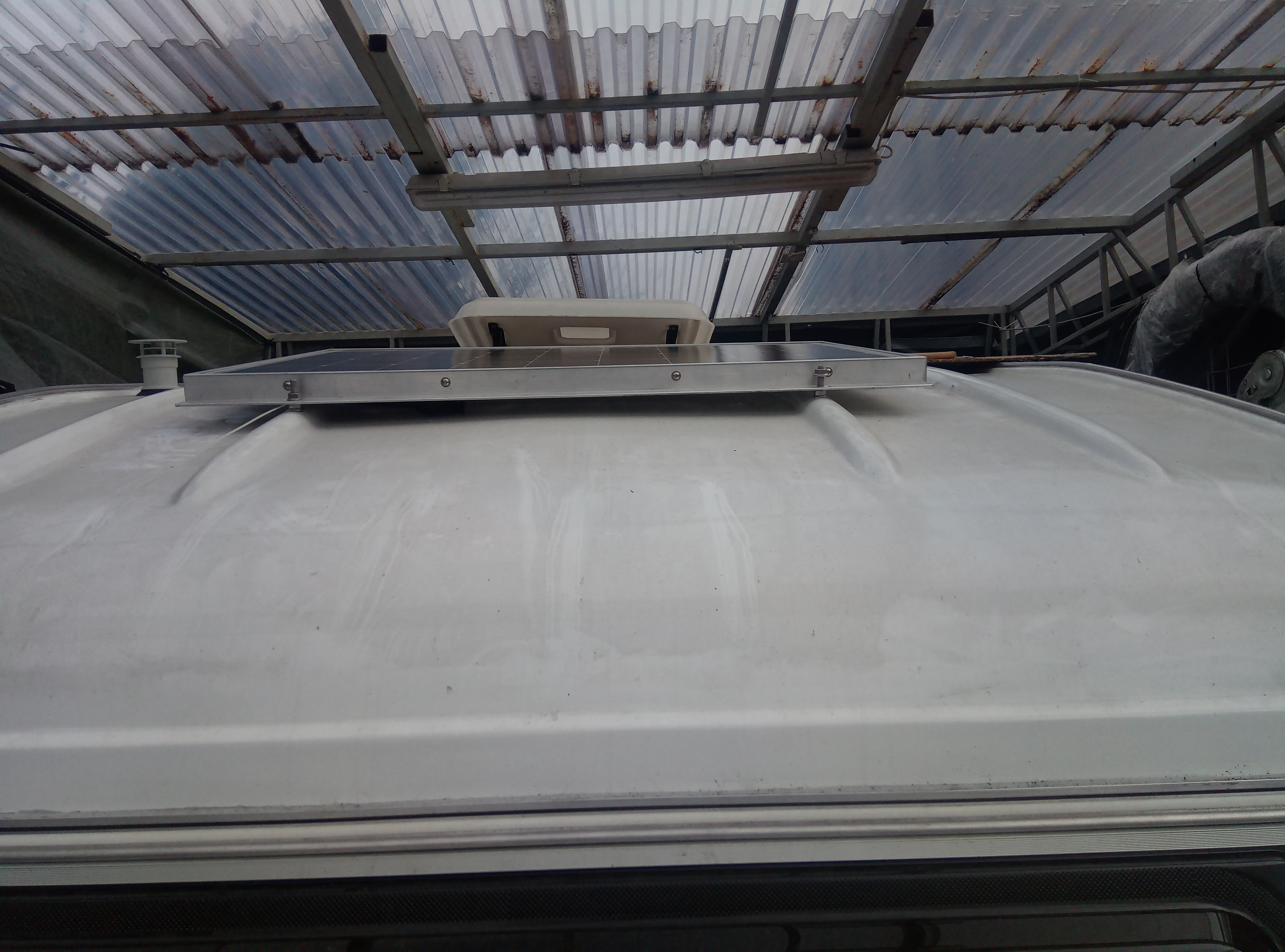 Poza tym walka z solarem, a raczej zapadniętym dachem. Wstępne przymiarki pokazały, że ładnie nie będzie niestety. Dach na tyle twardy, że się nie poddał. Podczas przykręcania panel się skręcał. Trzeba będzie dawać dystansy z jednego rogu.