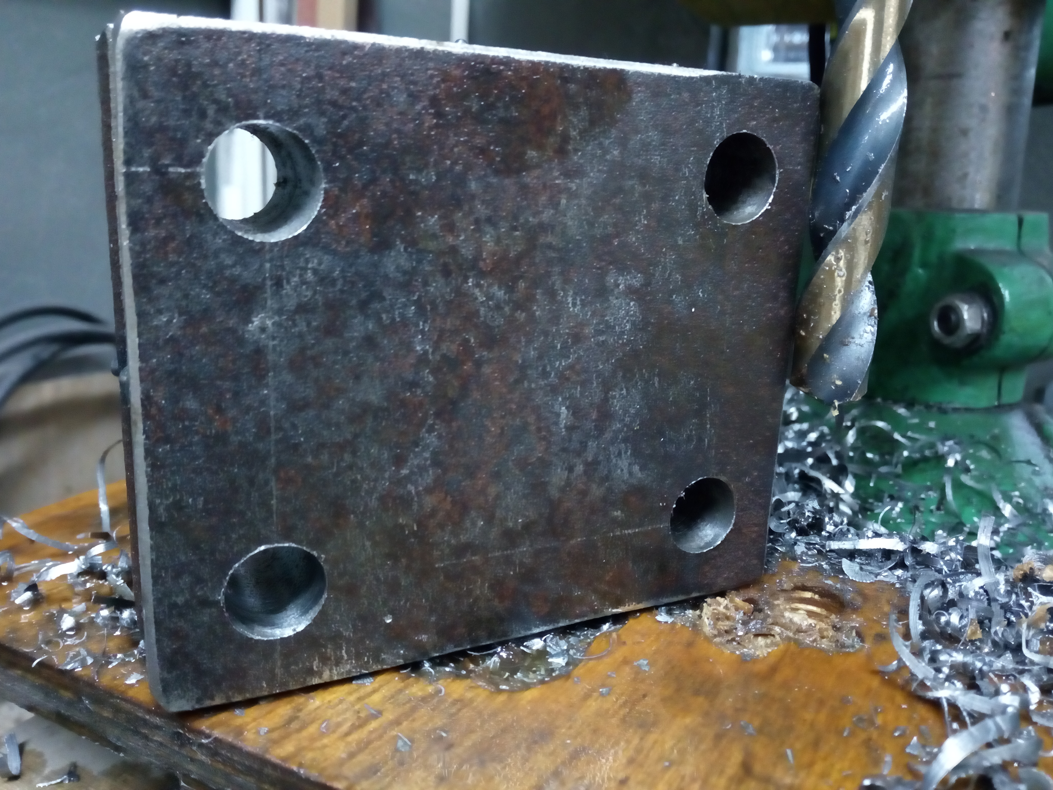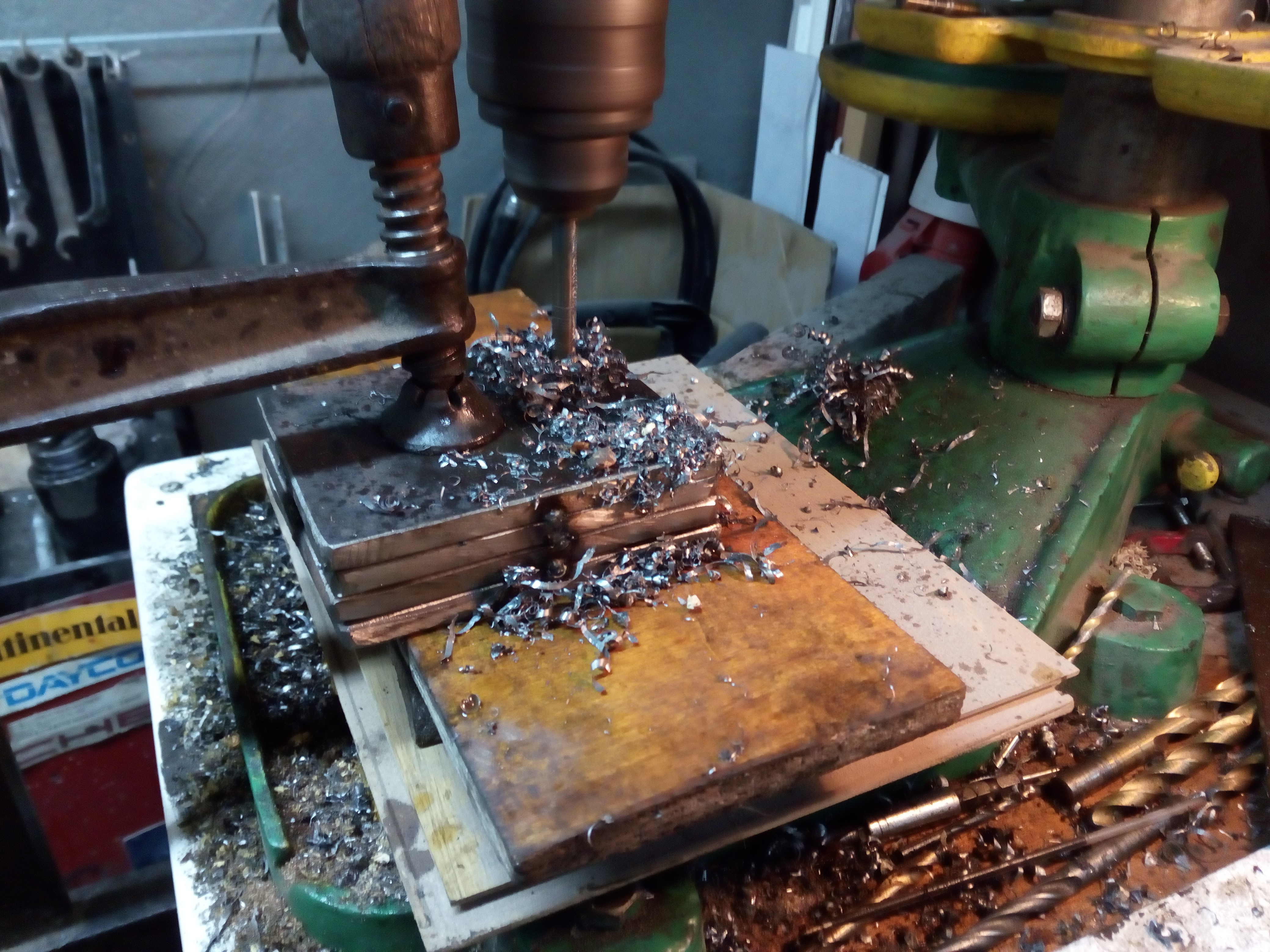 Tę wiertarkę wyciągnąłem ze złomu, praktycznie wszystko stało dęba. To jest jakiś bardzo stary Flott niemiecki po jakiś dziwnych przeróbkach + moich przeróbkach ale faktycznie daje radę. Jedyne co denerwuje to brak imadła krzyżowego i stary uchwyt wiertarski, który nie wiem za Chiny jak ściągnąć.