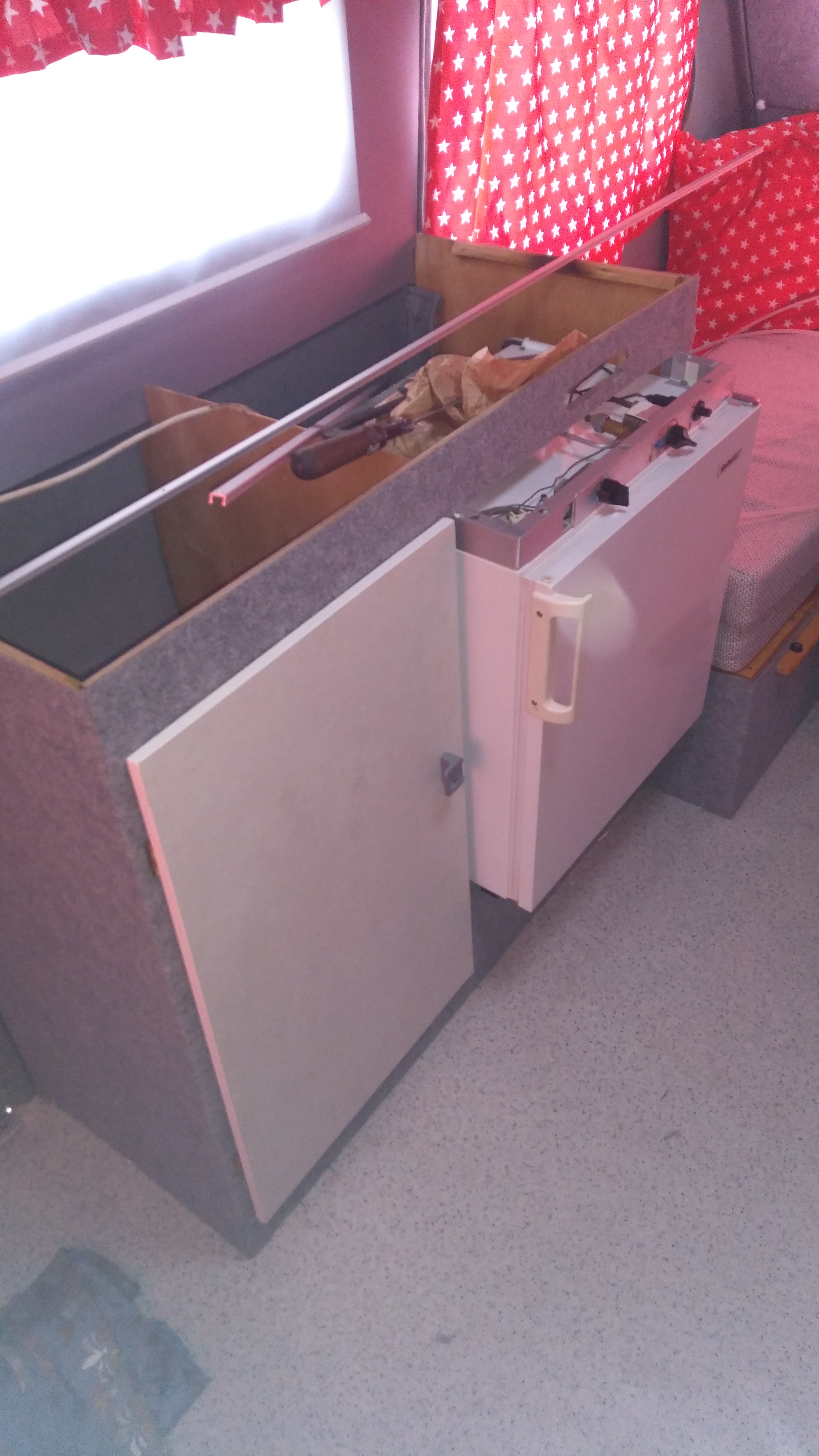 , specjalny bezpiecznik 50A na akumulatorze jako ostateczne zabezpieczenie zwarciowe do tego gniazdo 220v do podłączenia prostownika. Zamontowałem prawie wszystkie fronty razem z zamkami, zostało mi przytnąć drzwi od szafy o kilka centymetrów i z frontami będzie koniec. Lodówka hmm miałem piękna lodówkę, ale tylko na 220v a potrzebuje na gaz, udało mi się nabyć taką lodówkę ale w gorszym stanie przełożyłem urządzenie i teraz mam piękna lodówkę na 229v i gaz.