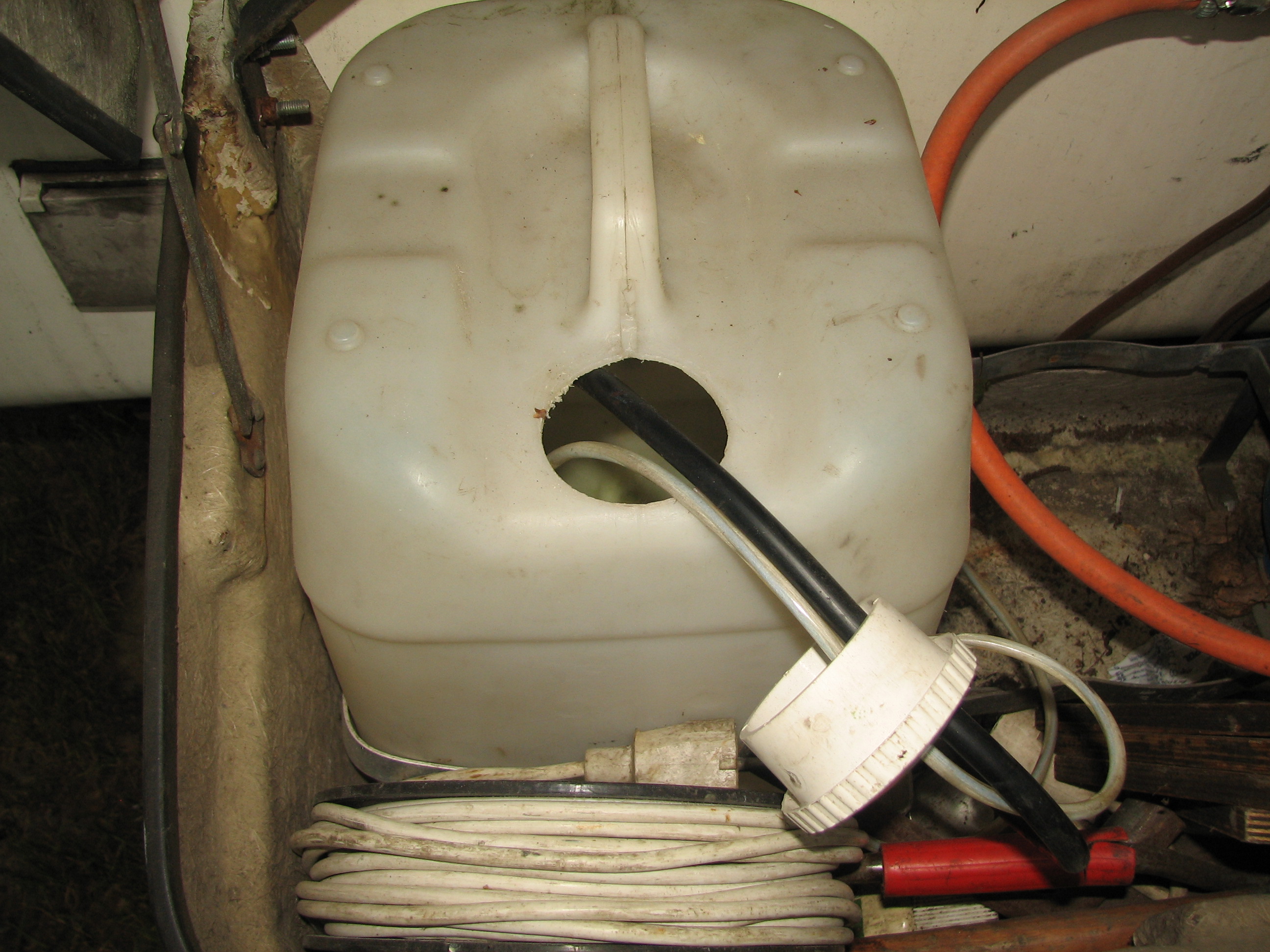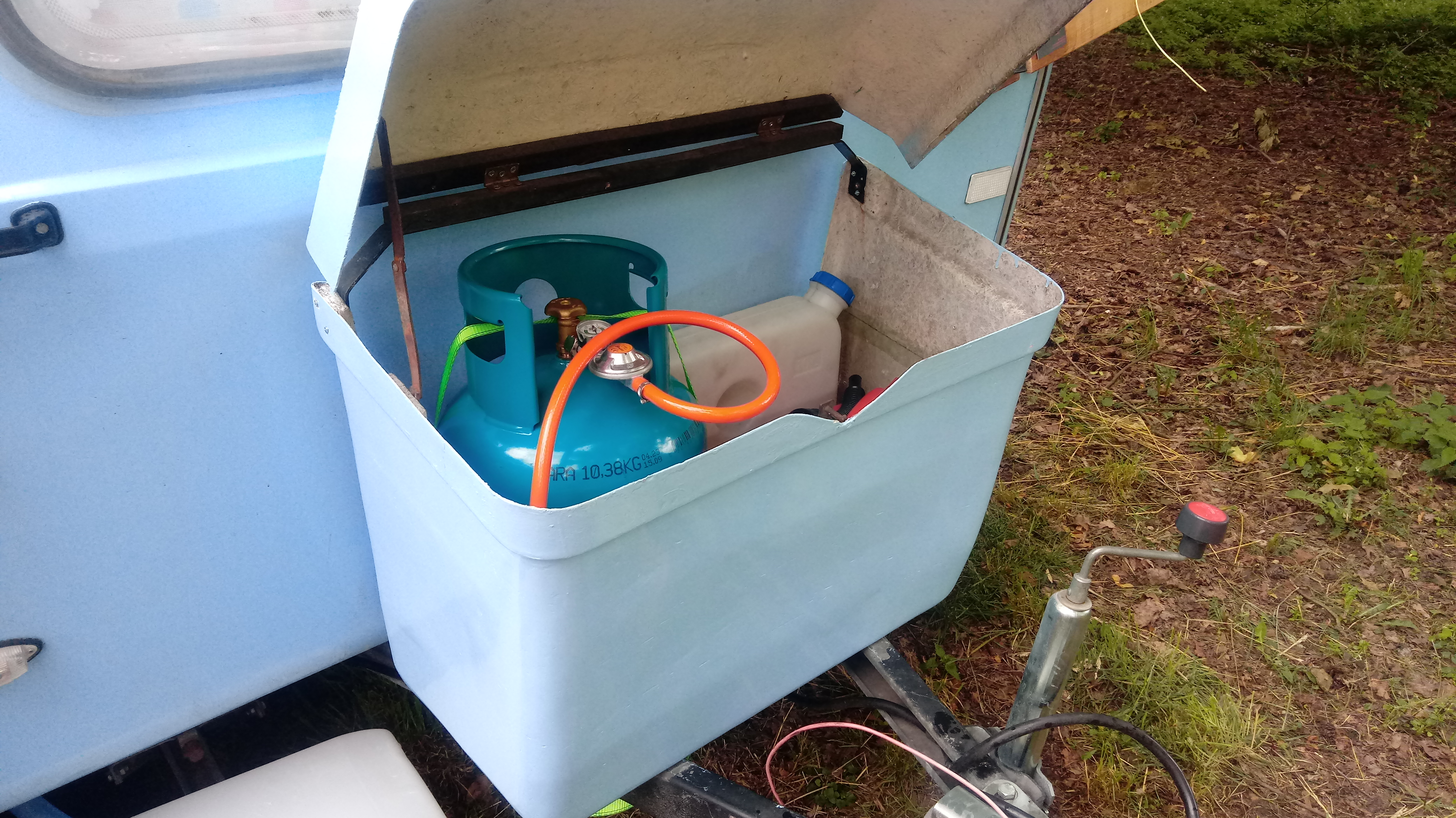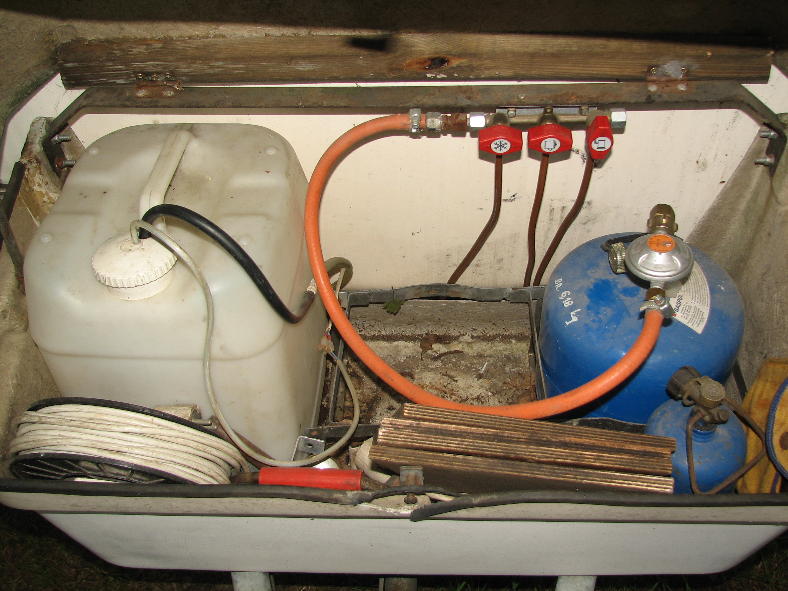 Byłem na działce i zgodnie z obietnicą załączam zdjęcia mojego kufra. Jest to standardowy kufer z N126e. Nie wygląda może najpiękniej, ale ze względu na plany remontowe przyczepa nie przeszła procedur pozimowego czyszczenia. Tak wygląda cały kufer. Niestety, chwilowo nie ma w nim drugiej butli. Jak widać, mieści się w nim jeszcze szpula z 20 m przewodu zasilającego 230 V, podkładki pod podpory, korba do podpór i butla 0.5 kg do lampy gazowej. Do płaskownika mocującego zawiasy pokrywy została przykręcona listwa zaworów gazowych do szybkozłączki do zewnętrznej lodówki lub gazowego grila, kuchenki i ogrzewania. Również, podobnie jak Kolega, miałem problem z wkrętami mocującymi płaskownik do dolnej części kufra. Zamiast nich zastosowałem zamkowe śruby M6. Duży łeb z powodzeniem zasłonił ubytki powstałe przy wierceniu otworów. Tutaj widać, jak został przerobiony uchwyt do butli. Przykręcona jest do niego obejma z płaskownika aluminiowego trzymająca baniak z wodą. W praktyce okazała się ona zbędna i dlatego jeden jej koniec nie jest przykręcony. Zbiornik stoi stabilnie i nie ma zamiaru się przemieszczać, zwłaszcza, że jest zaklinowany szpulą z kablem. Ten żółty pokrowiec z prawej, to narzędzie uniwersalne- składana saperka, siekierka i piła do drewna. Jest to sprzęt zabytkowy, bo zakupiony w latach siedemdziesiątych ubiegłego stulecia, ale nadal nadaje się w pełni do użytku. A tak, z kolei, wygląda powiększony otwór w baniaku. Baniak, jak pisałem w poprzednim poście ma pojemność 20 l.