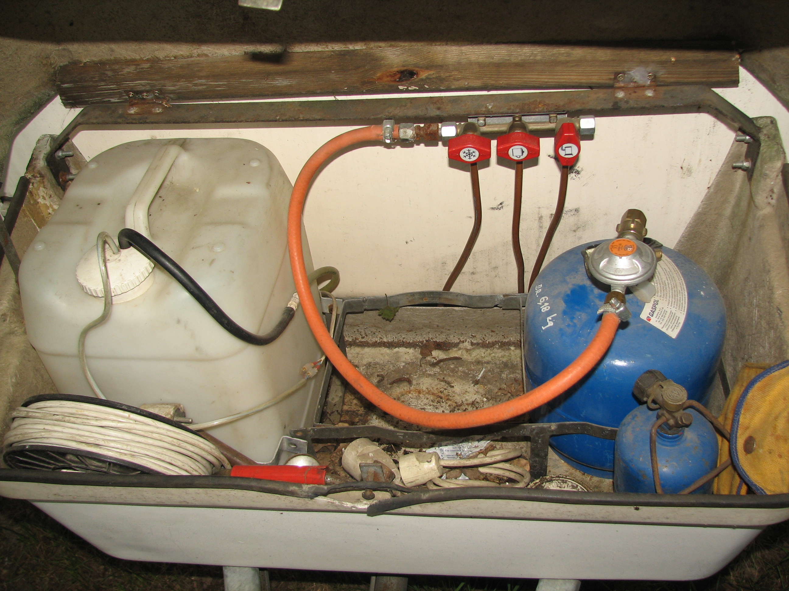 Raczej nie mam fotki ze swojej zapiekanki, ale jeszcze chyba TomekMal ma taki układ. W kufrze jest z brzegu baniak 20L zamiast jednej butli. Pozostałe 2 butle stoją w oryginalnej ramce.