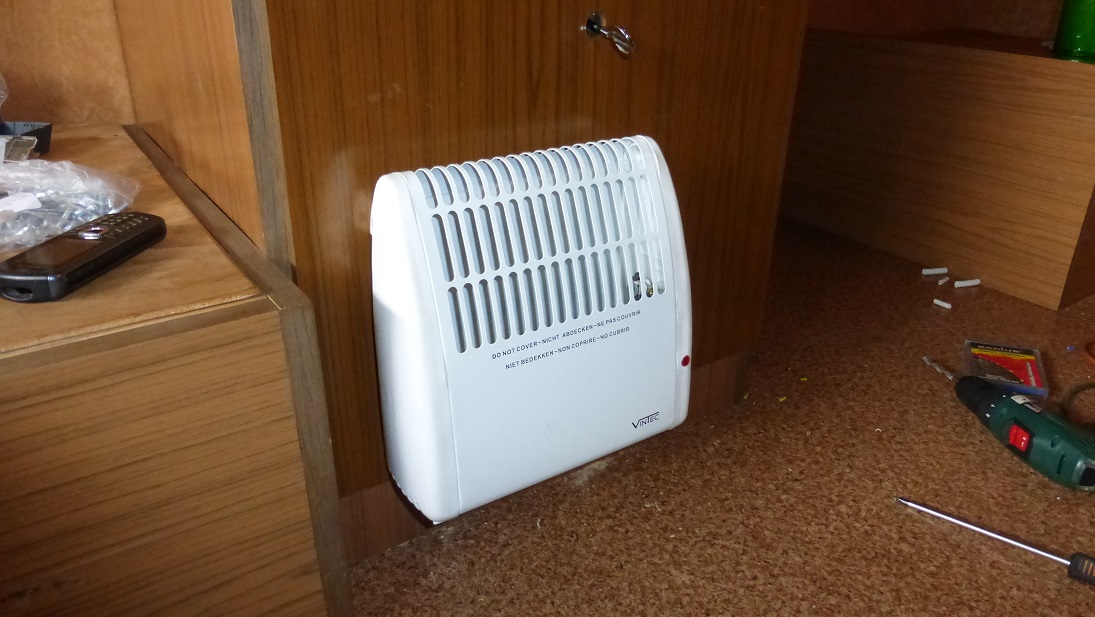 Na szafie zamontowałem kaloryferek elektryczny 500W. Sprawdził się świetnie, w nocy na wyjeździe zmierzyłem i termometr elektroniczny pokazał +5,5*C na zewnątrz, natomiast w przyczepie wskazał +24,8*C. Kaloryfer podłączony jest do przewidzianego dla niego gniazda na dnie szafy.