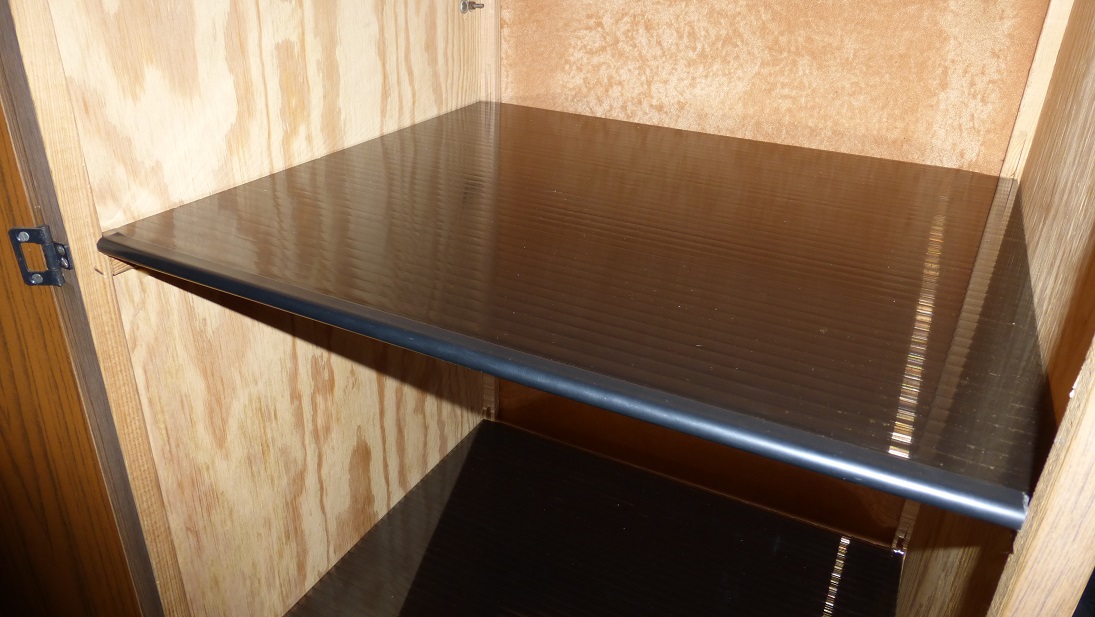 Zrobiłem też półki do szafy z poliwęglanu komorowego w ciemnym kolorze. Krawędzie wykończyłem plastikowym profilem "klamrowym" z Obi. Ciężko było go założyć ale wygląda dobrze i dodatkowo usztywnia półkę.