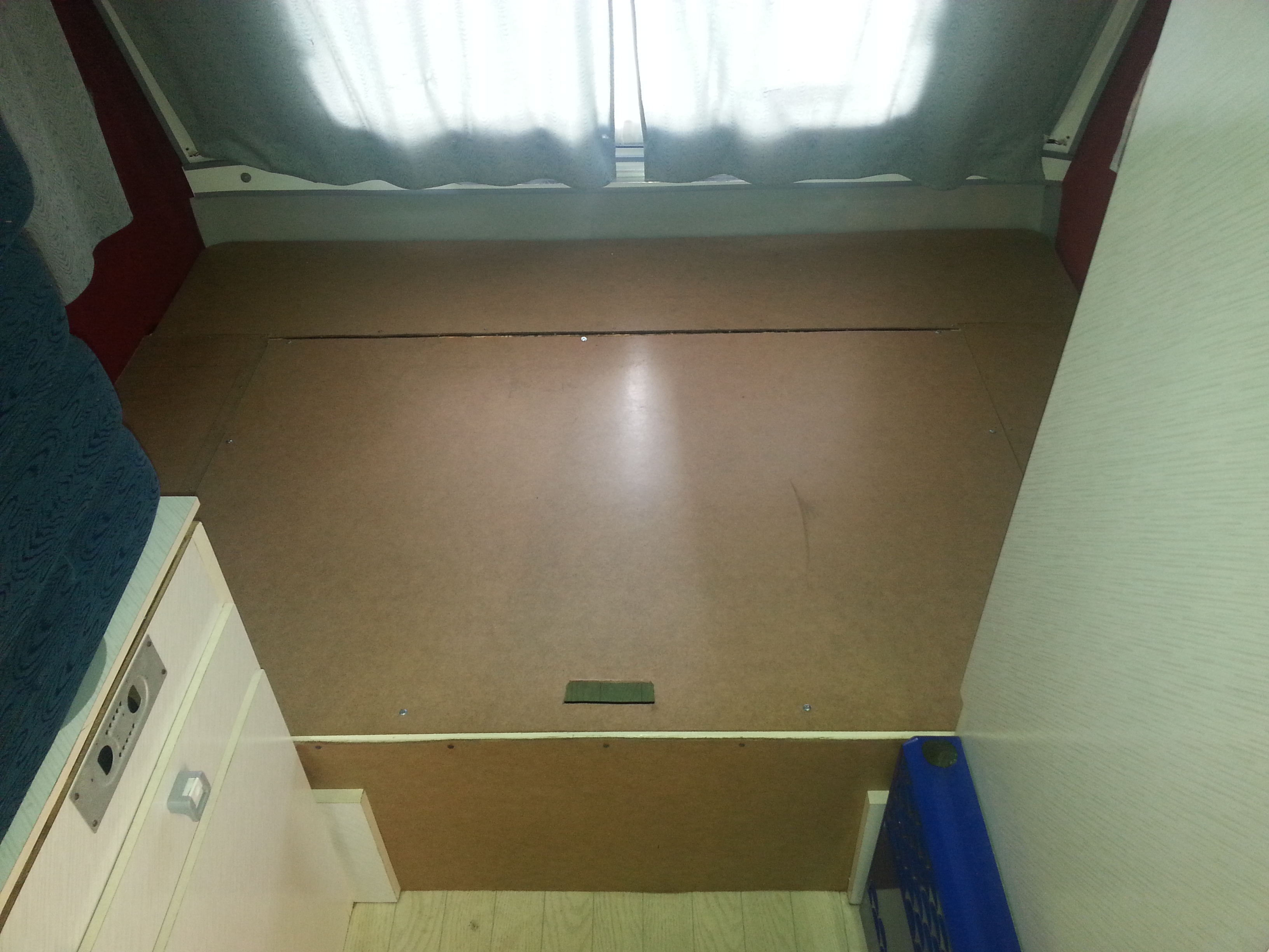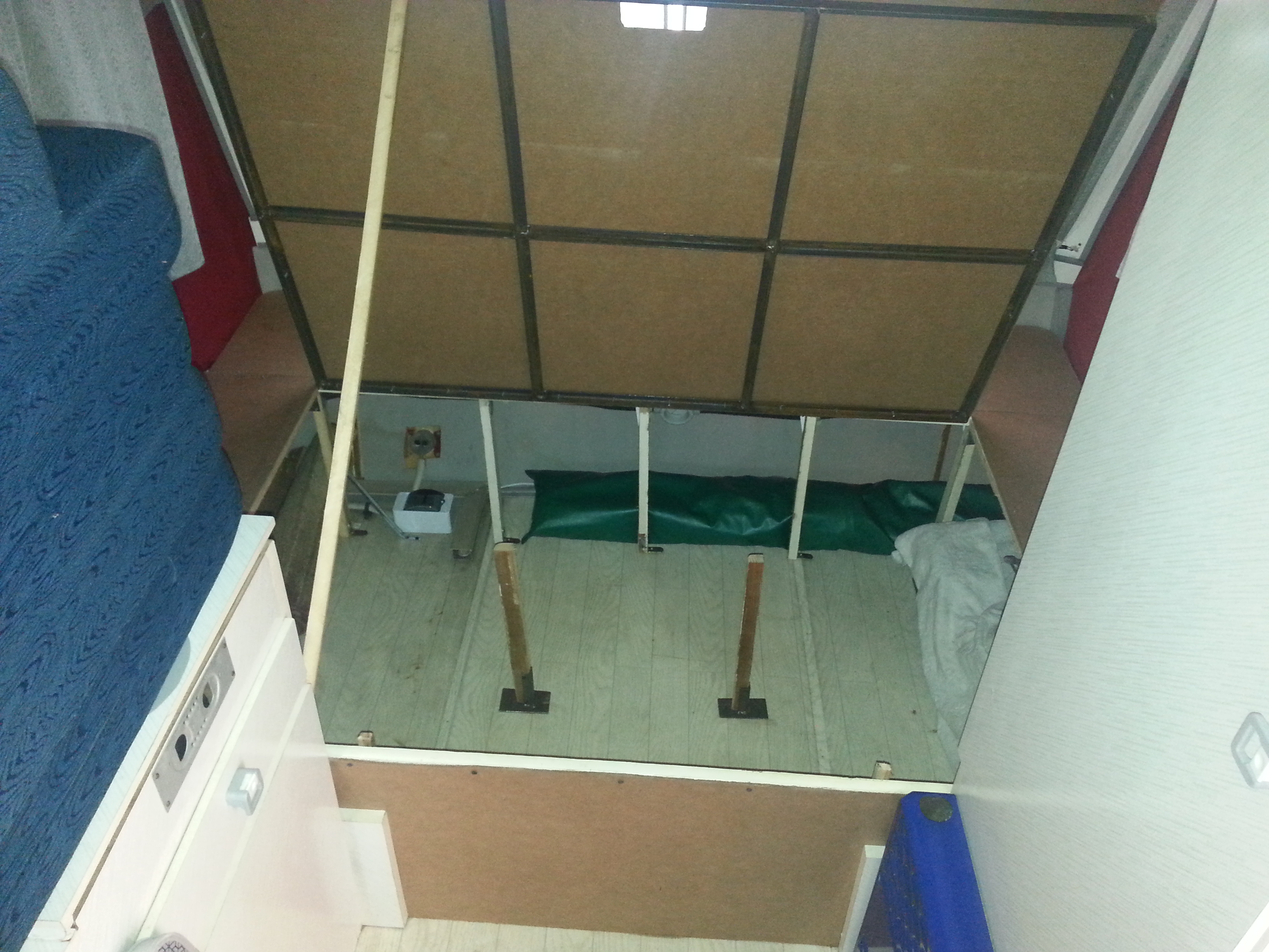 Pisałem wcześniej że zlikwiduję duże bakisty i tak też uczyniłem. Wysokość łóżka teraz to 45cm, o 15 wyżej niż normalnie. Zrobiłem to w ten sposób że w każdej chwili mogę zamontować z powrotem oryginalne meble.Cała konstrukcja jest drewniana oprócz klapy która jest z kątowników. Podczas remontu który mnie czeka w przyszłości wiem że klapę zrobię węższą i zamontuję sprężyny gazowe.Jest to na razie wersja próbna ale zdała egzamin na majówce,wchodzi tam naprawdę sporo bagażu i klamotów. Wykonałem też kotwy do pasa sztormowego z karabinkami aby nic się nie odpięło,grubość pręta to 1.5 cm.