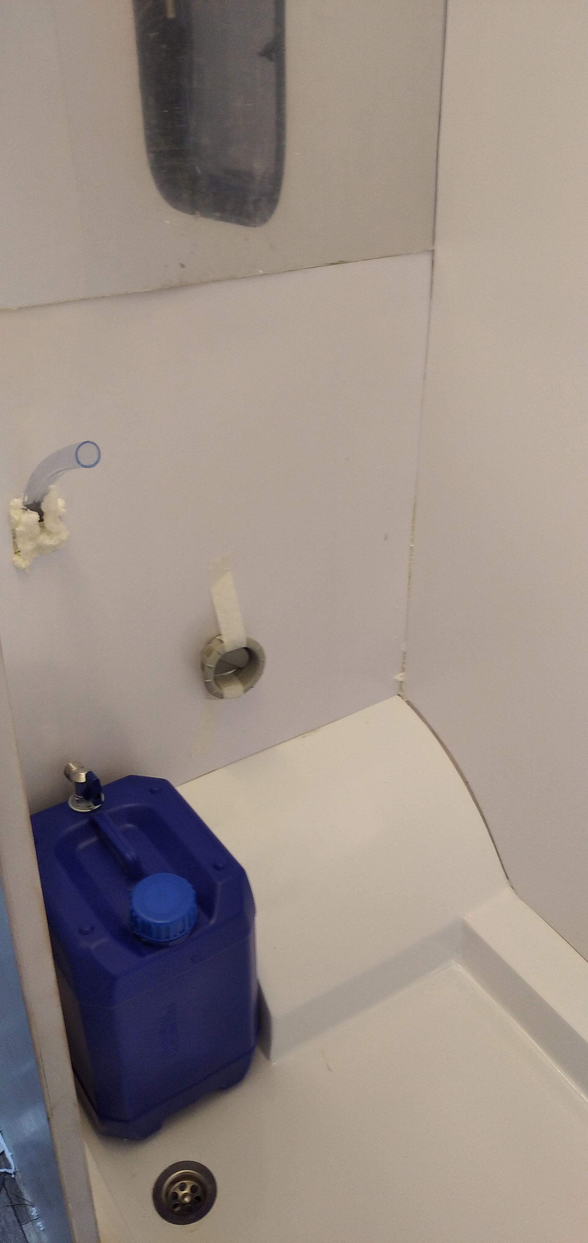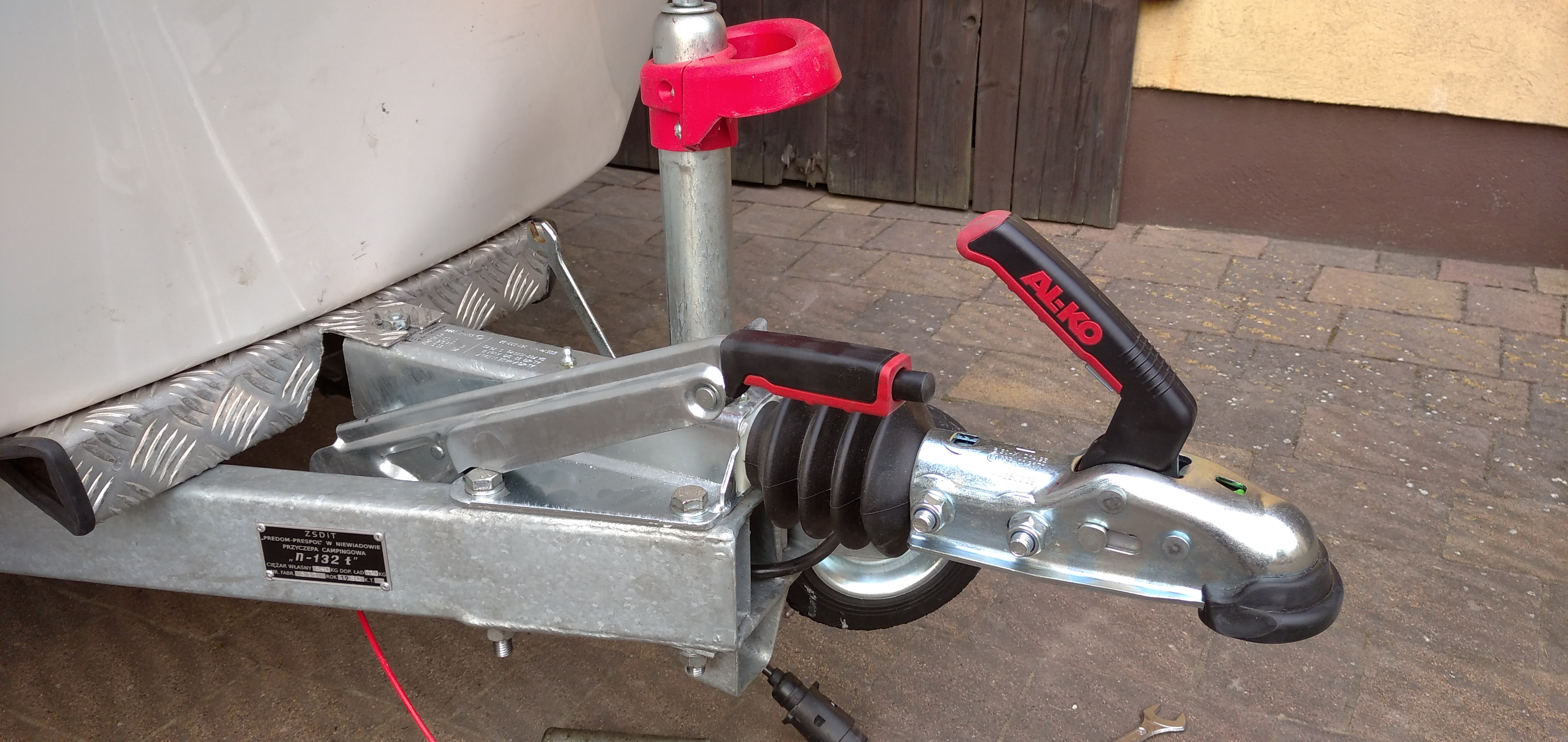 Ja tu widzę tylko jeden minimalny problem. Odpływ na środku brodzika. Generalnie w większości przyczep jakie widziałem z oryginalnym brodzikiem odpływ jest w rogu, bo odpowiednie ustawiając przyczepę powodujemy że woda spływa idealnie w ten róg. Jeśli ustawisz przyczepę minimalnie dyszlem w dół to cały brodzik wody będzie stał, a jak dyszlem do góry to woda będzie stała pod tą bańką z wodą.