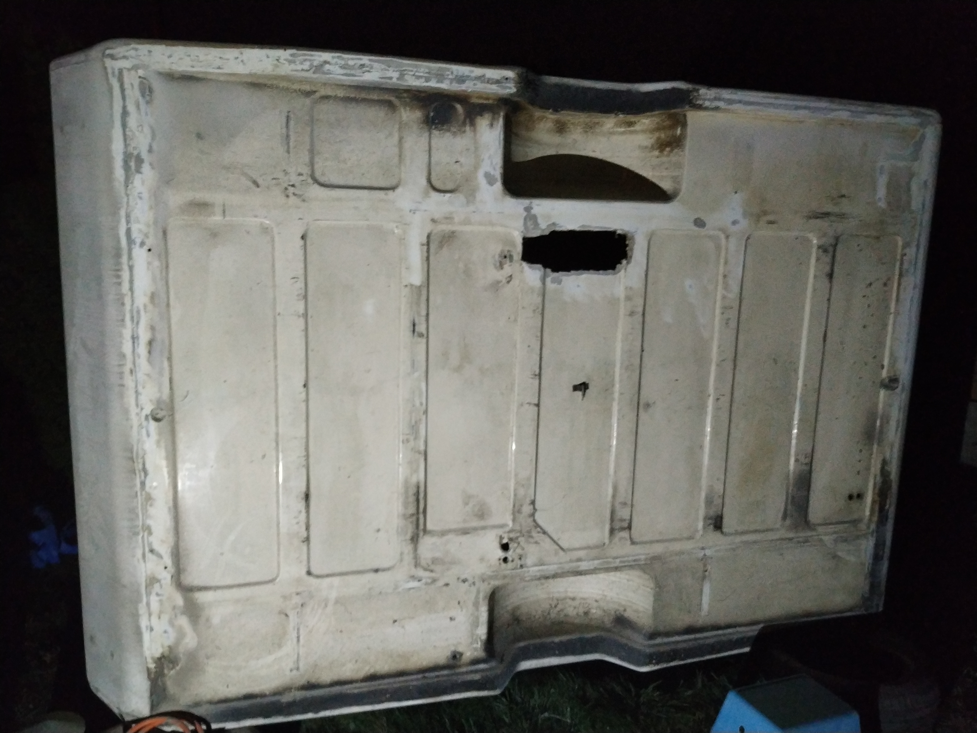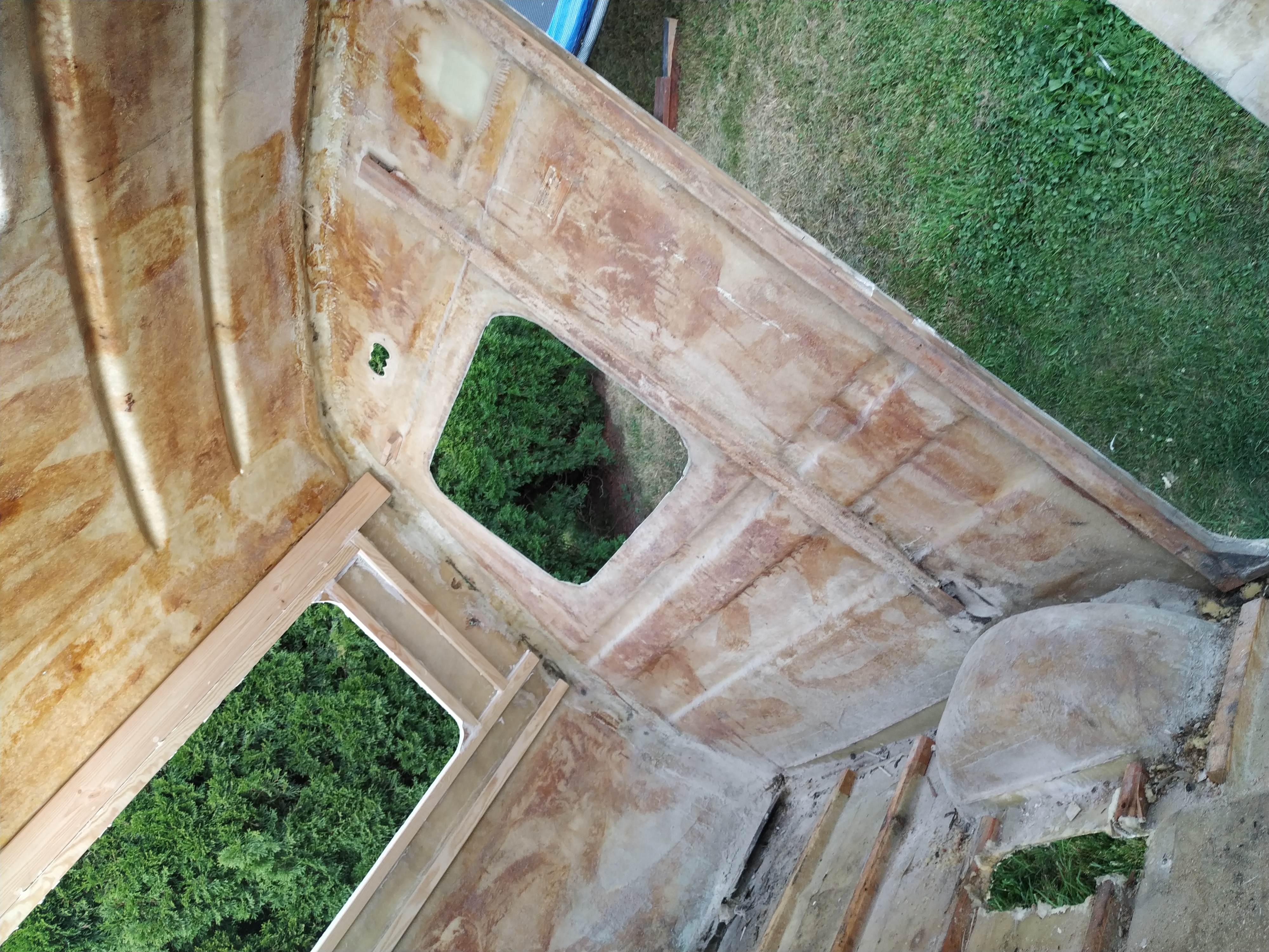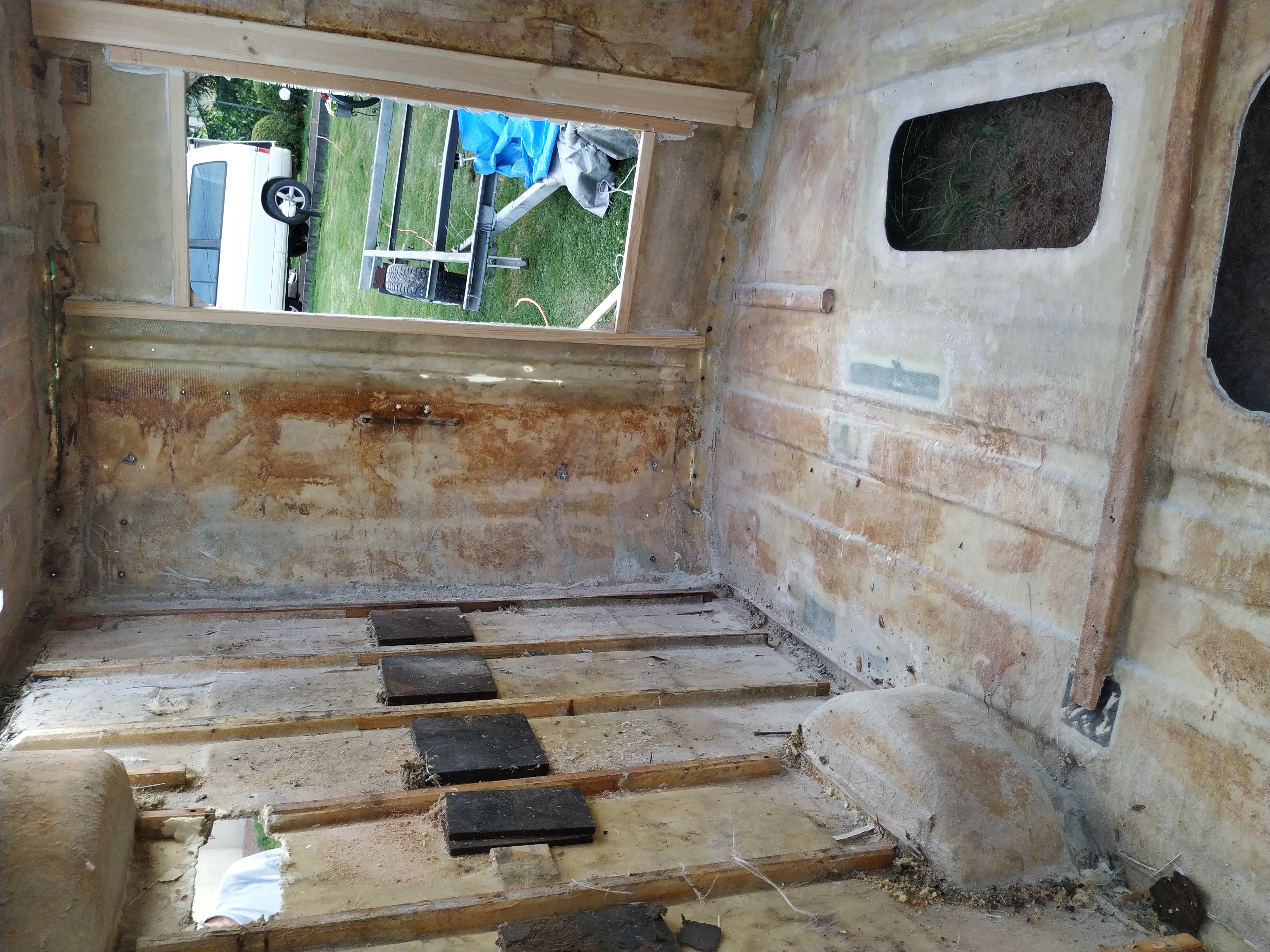 Dziś odcięta podłoga i wyjęta podłoga, zrzucona skorupka z ramy i przewrócona na boczek. Dół zacząłem czyścić z mazi czyli z czegoś co przypomina zabezpieczenie antykorozyjne i potem dla odmiany szlifowanie. Zostaję sam z remontem na dwa tygodnie - Teściowie zabierają mi dzieci nad morze