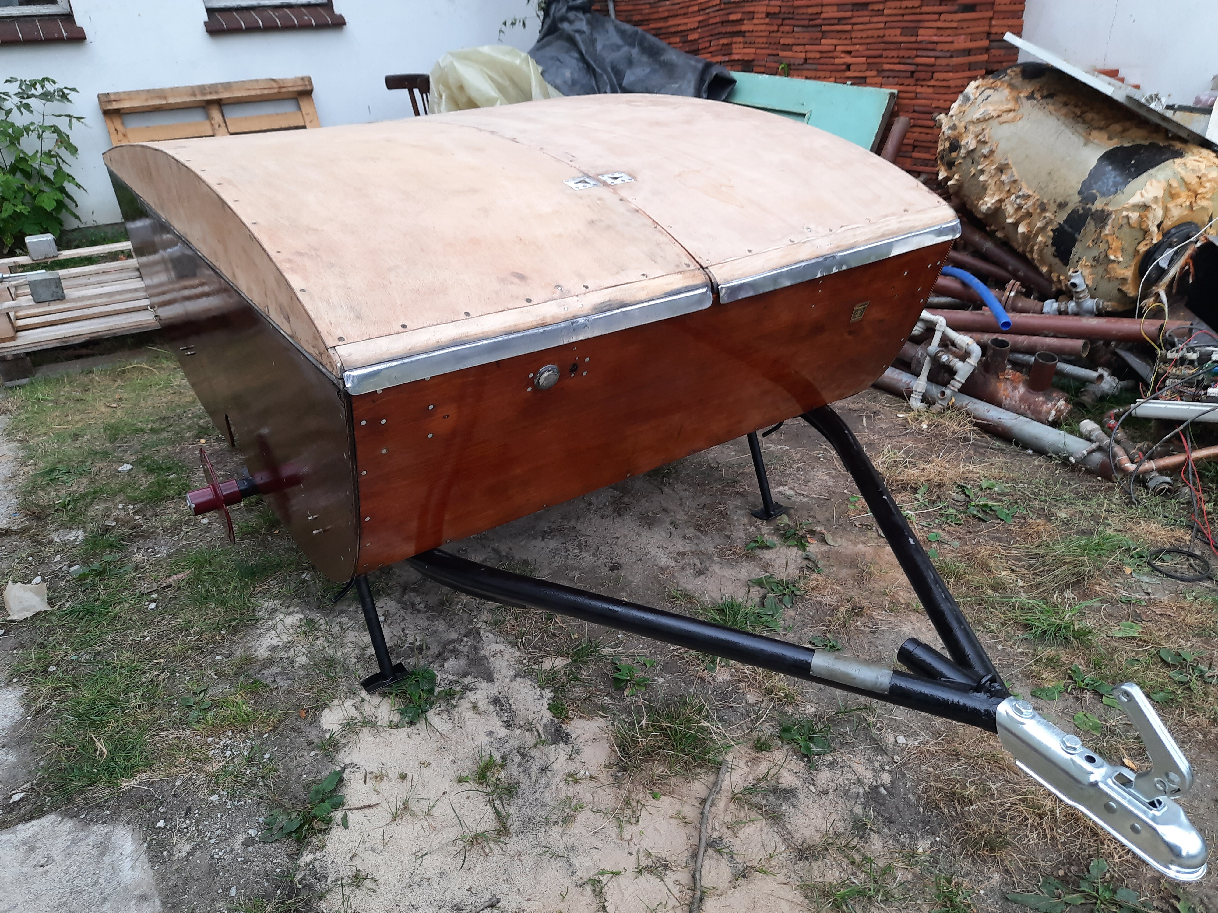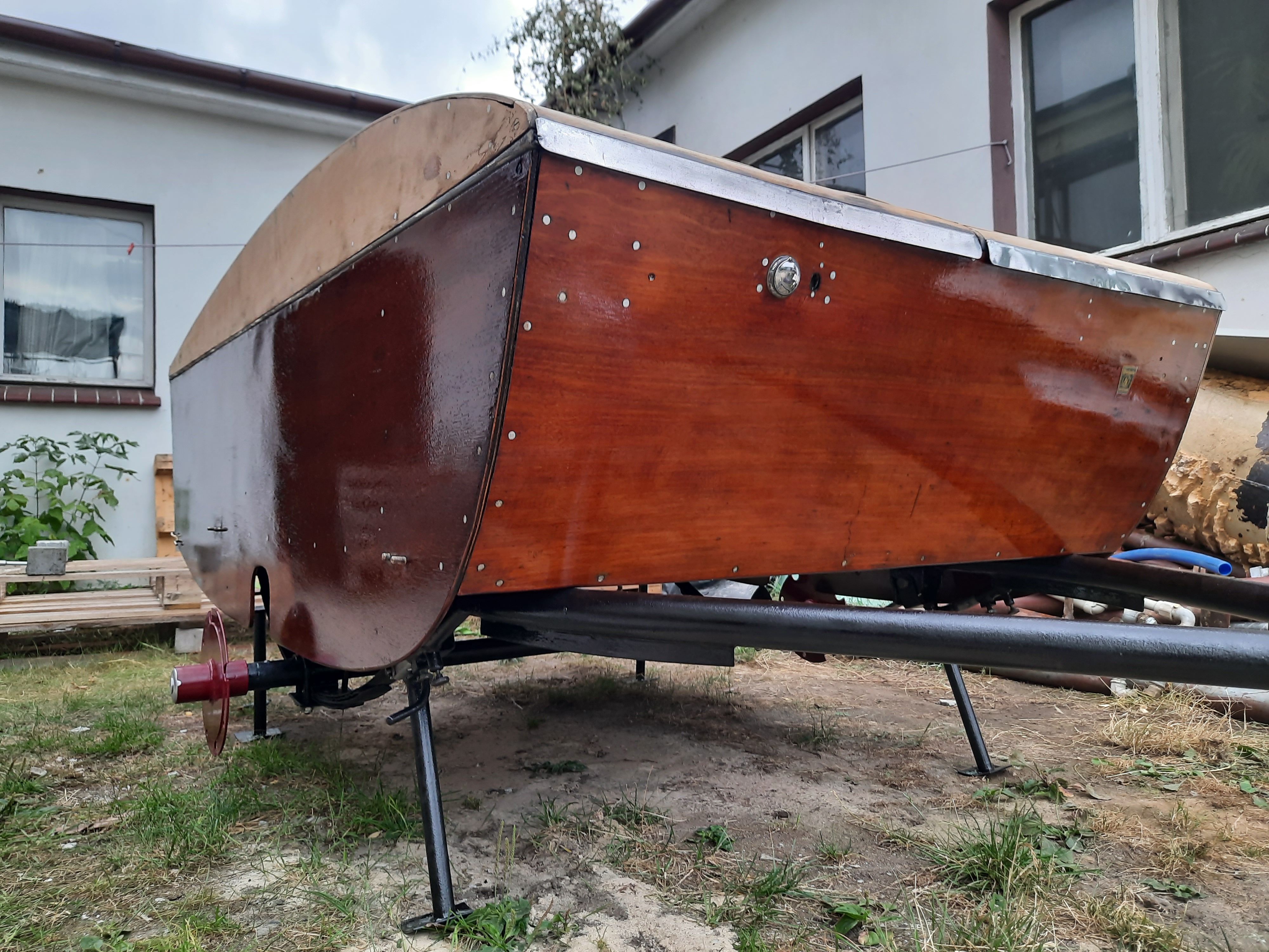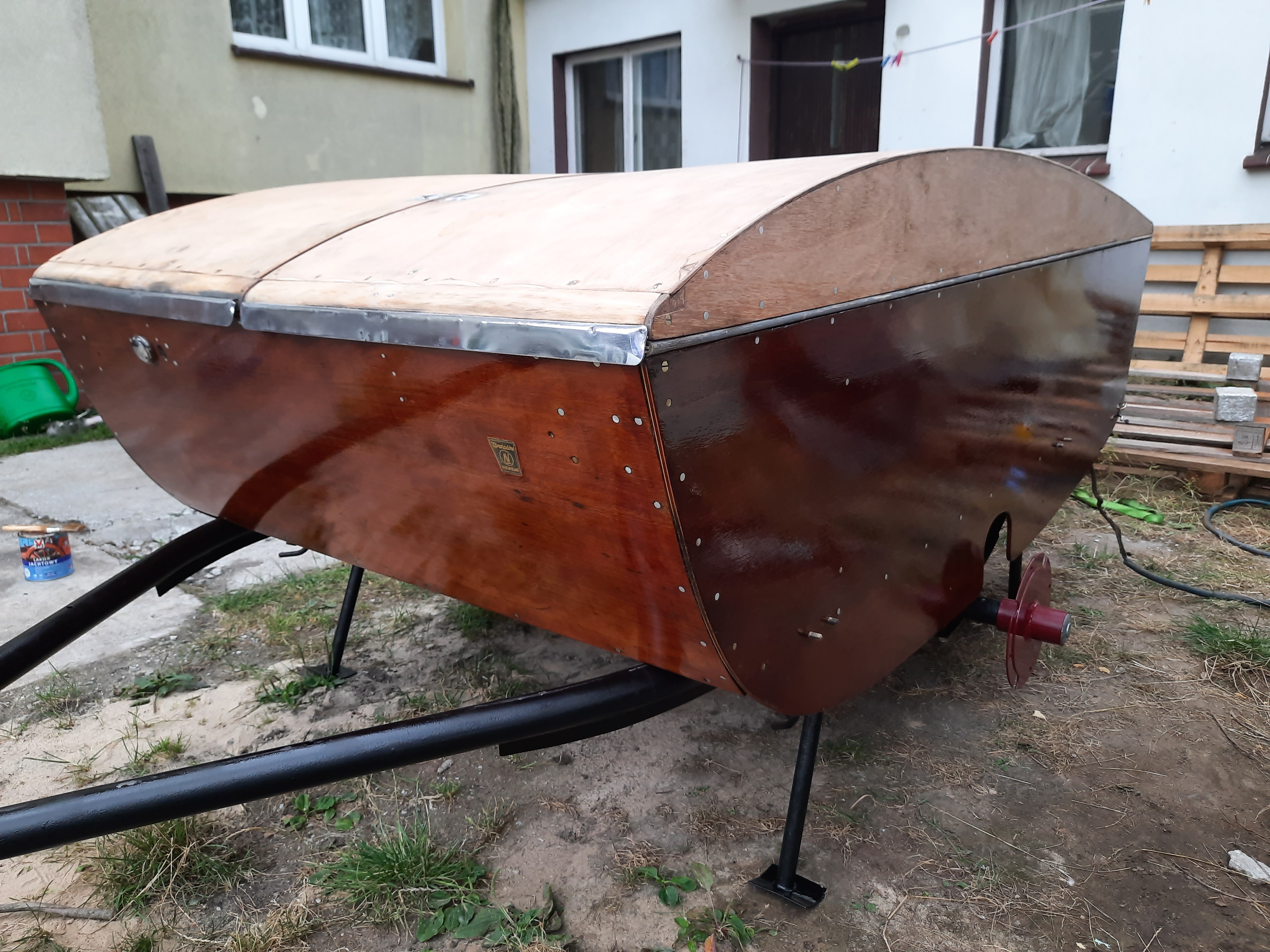Wreszcie buda trafiła na ramę. Dolna część polakierowana jest już na gotowo. Na wszystkie szlifowane drewna kładę trzy warstwy lakieru jachtowego bezbarwnego w połysku. Po pierwszej warstwie jest jeszcze raz przeszlifowane 240.