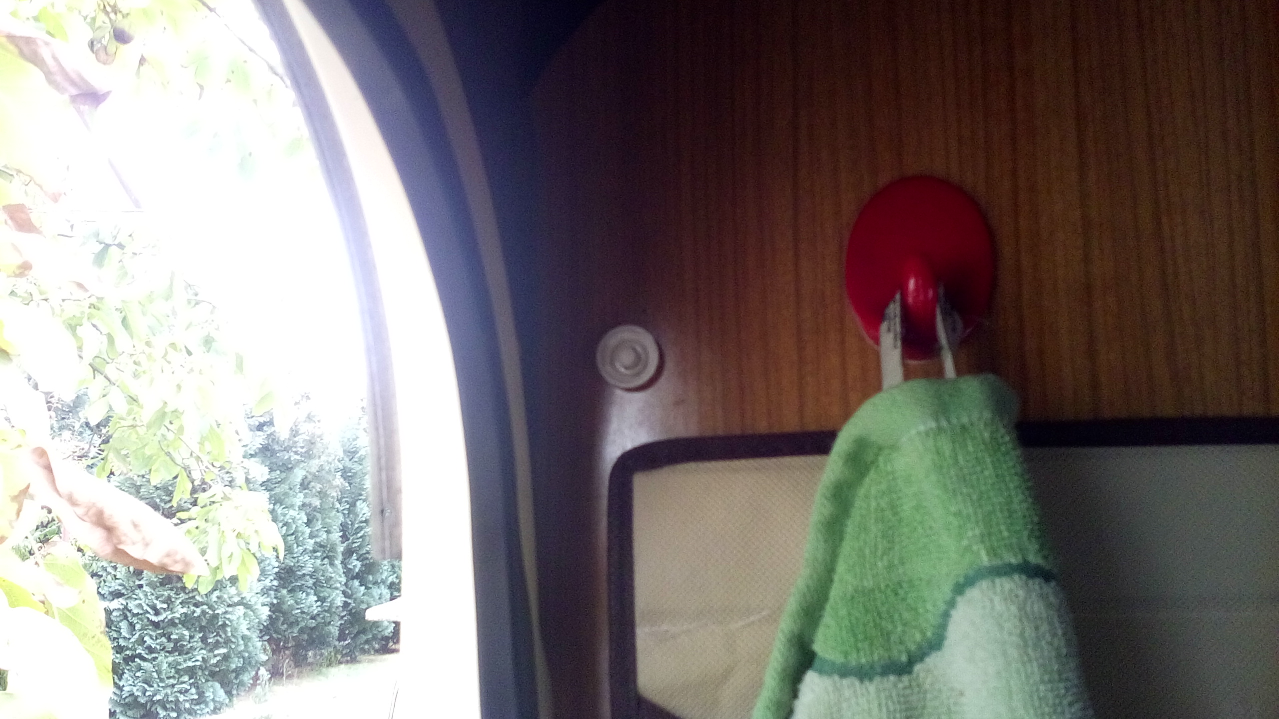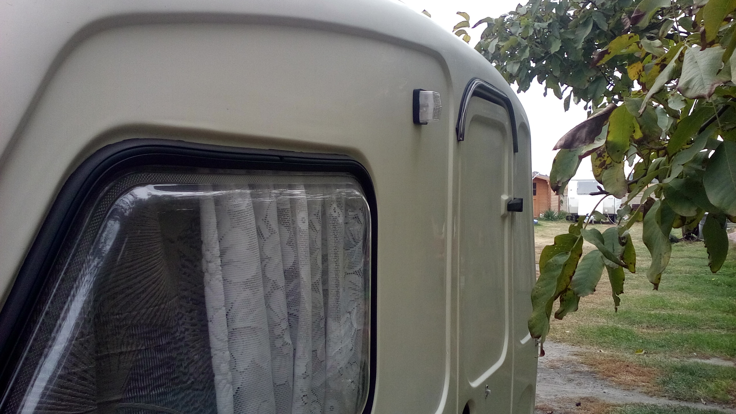 Wszystko ładnie, pięknie ale zaczęło mnie wkurzać ciągłe rozwijanie przewodu i mocowanie lampki by mieć światło w przedsionku lub pod daszkiem. Zacząłem szukać oświetlenia które można by było na stałe przytwierdzić do ściany przyczepy nie kalecząc jej zbytnio. Wszelkie lampy karawaningowe to wydatek minimum 65 PLN więc w związku z czym poszedłem w drugą stronę i zakupiłem za 5,50 PLN podpatrzoną lampę u CornBlumenBlau, dołożyłem do niej lustro odbijające które zostało pozyskane z opakowania po plasterkach na opryszczkę i lampa ma się dobrze i świetnie spełnia swoje zadanie. Przymocowana jest do przyczepy za pomocą jednej śruby w związku z czym w laminacie wymagało to tylko zrobienia dwóch dziurek jednej na śrubę a drugiej na kabel, natomiast wyłącznik do niej został umiejscowiony wewnątrz przyczepy w ścianie szafy.