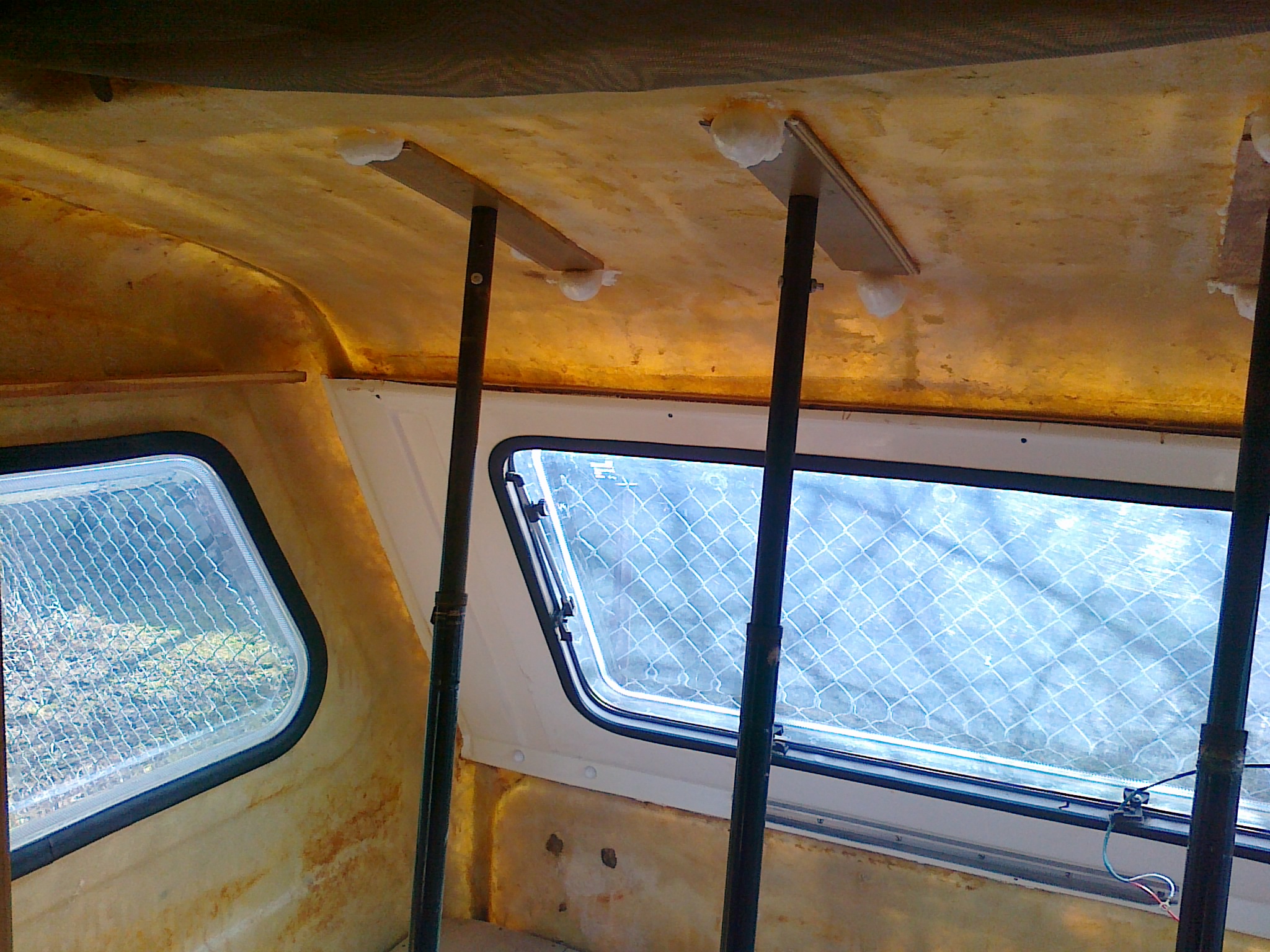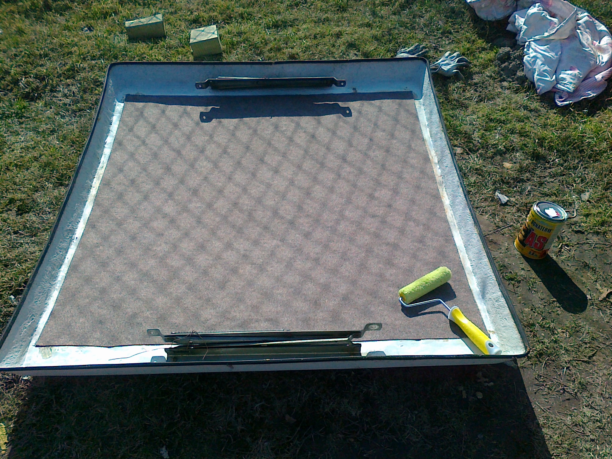 W kolejnym etapie wykroiłem wykładzinę pod duże okna i przykleiłem ją , wykleiłem również tylną ścianę szafy i przystąpiłem do montażu uchwytów i mechanizmów otwierania dachu, dopasowałem szczelniejsze uszczelki dachu. Stare oryginalne poszły na śmieci bo nie były zbyt szczelne, a w to miejsce zamontowałem używane uszczelki drzwiowe z malucha, są o wiele szczelniejsze.