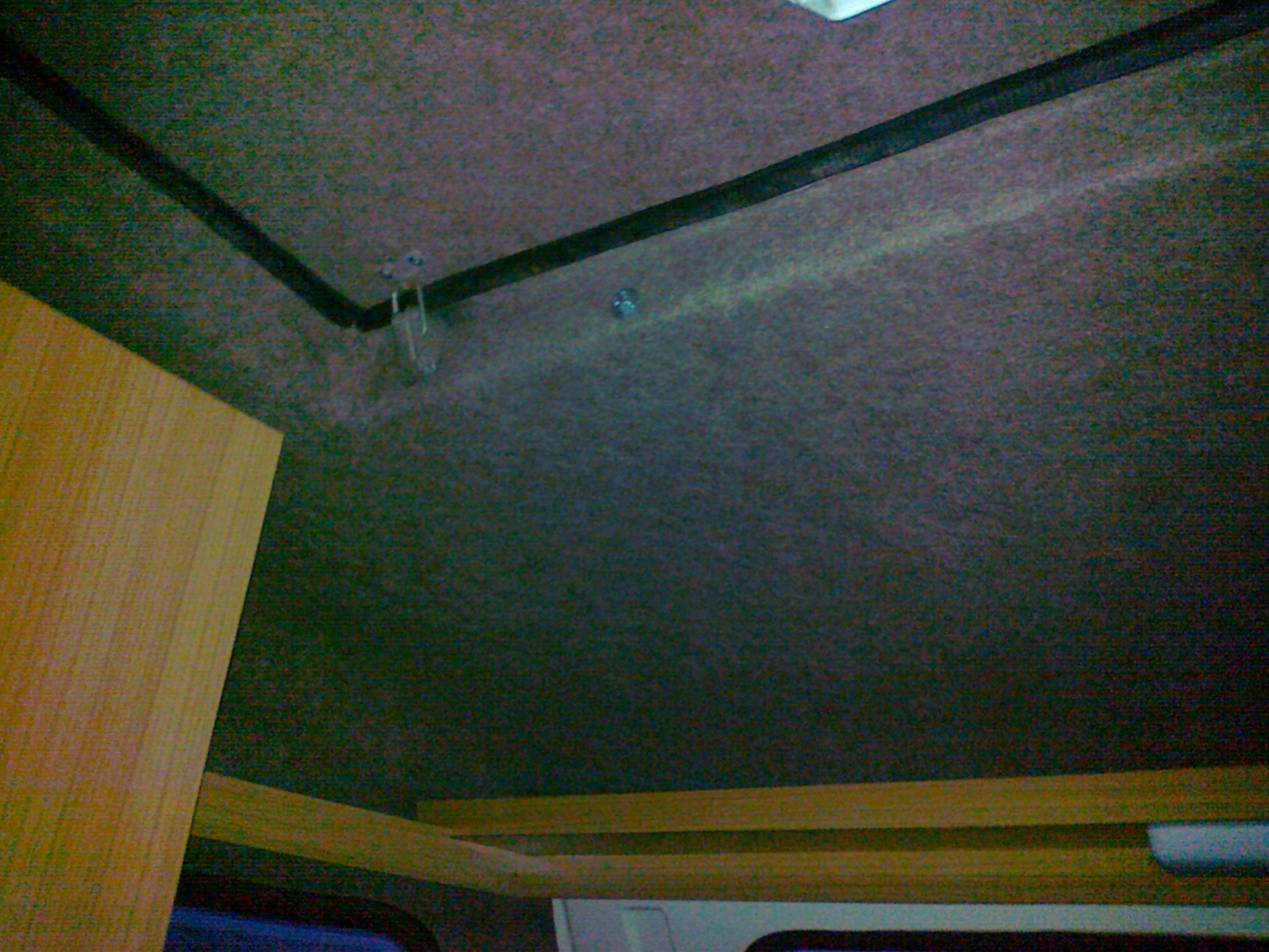 Na początek zerwałem starą tapicerkę, i wymontowałem górne półki, poluzowałem śruby od szafy by można było podłożyć pod nią tapicerkę nie demontując jej, podobnie jak z resztą pozostałych mebli. Oczyściłem z resztek kleju całą powierzchnię laminatu do tego celu używałem najpierw szpachelki później drucianki na wiertarce. Zakleiłem żywicą (zapobiegawczo) wszystkie miejsca montażu listew aluminiowych i miejsca gdzie laminat jest lekko uszkodzony od zewnątrz (w późniejszym etapie w planach jest szpachlowanie tych miejsc z zewnątrz). Przy okazji skleiłem zdemontowane półki bo wszystkie te wzdłuż przyczepy były częściowo porozklejane. Sprawdziłem jak wygląda podłoga pod gumoleum, na szczęście okazało się że wszędzie jest sucho i bez zapachów, więc nie ruszałem jej. Ogólnie spodziewałem się o wiele gorszego stanu pod tapicerką i gumoleum.