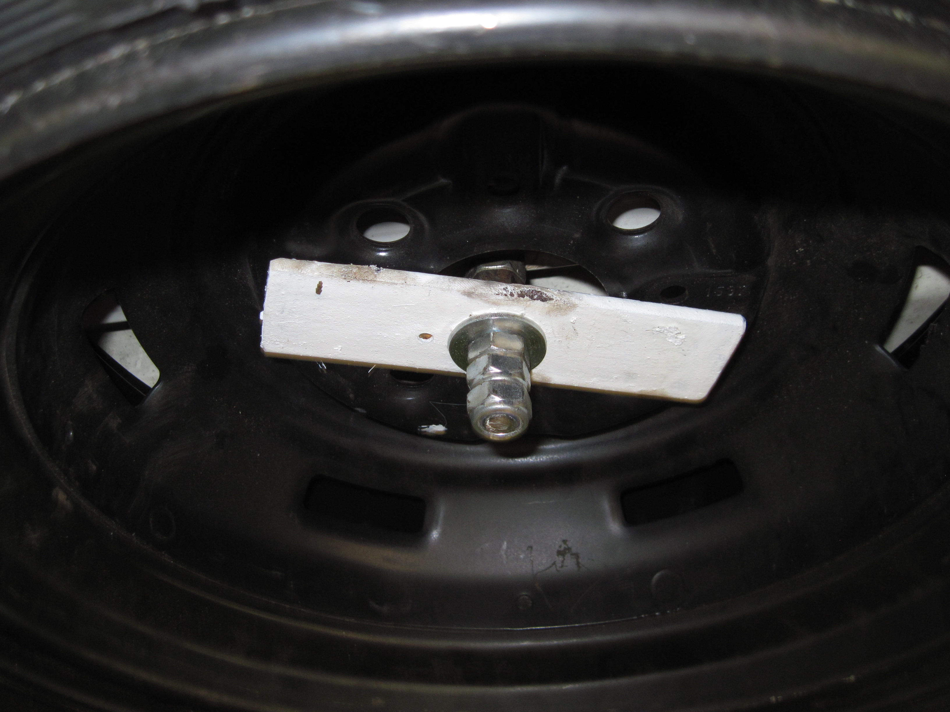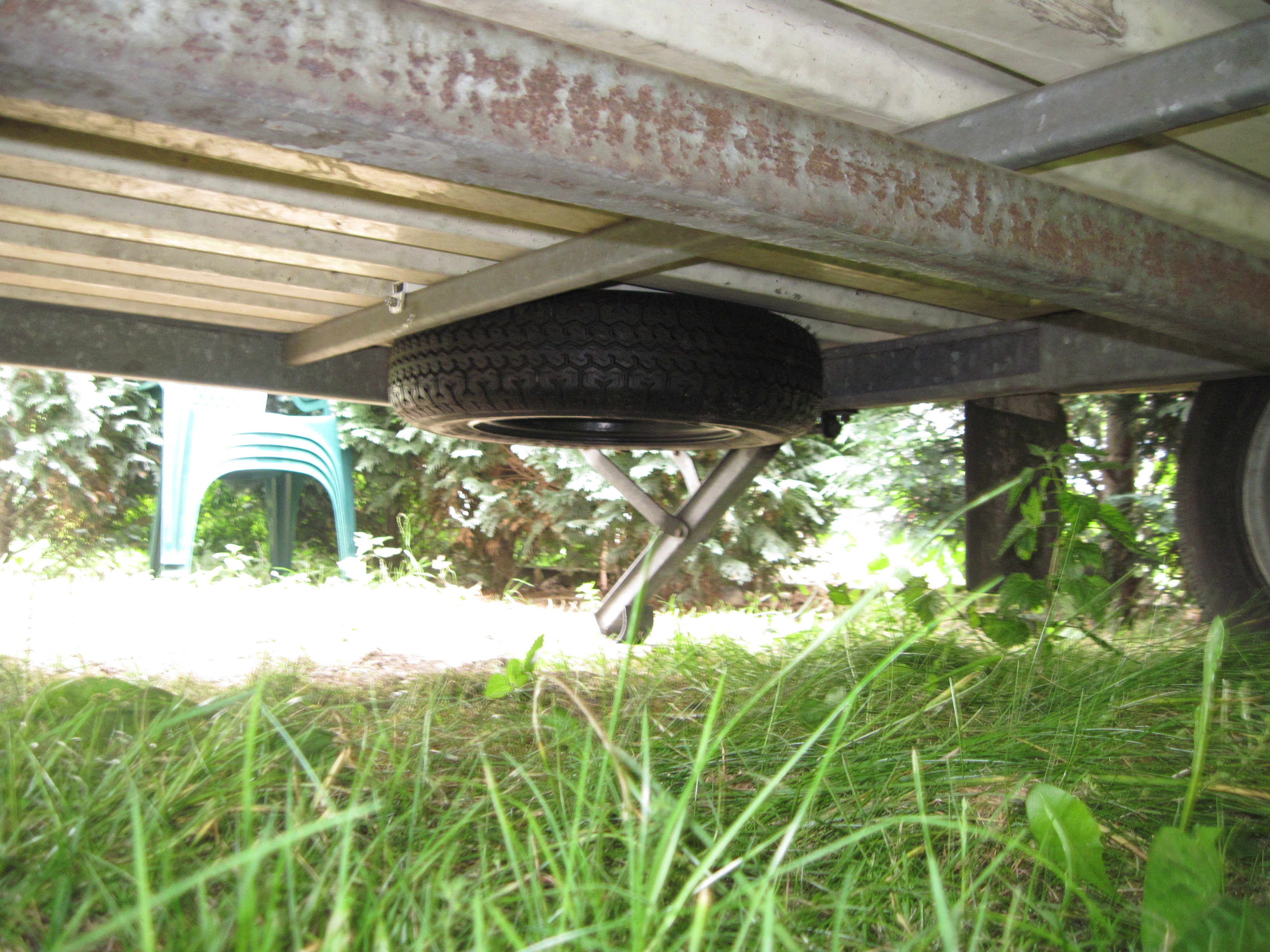 Do zrobienia wieszaka koła wykorzystałem pomysł z mojej bagażówki (gdzie taki sprawdza się od kilku lat z tą różnicą że jest w przedniej części przyczepy w miejscu łączenia paki ładunkowej i dyszla), a co do miejsca montażu częściowo podpatrzyłem pomysł Janka (vvarrior-a) na Zlocie w Sielpii.