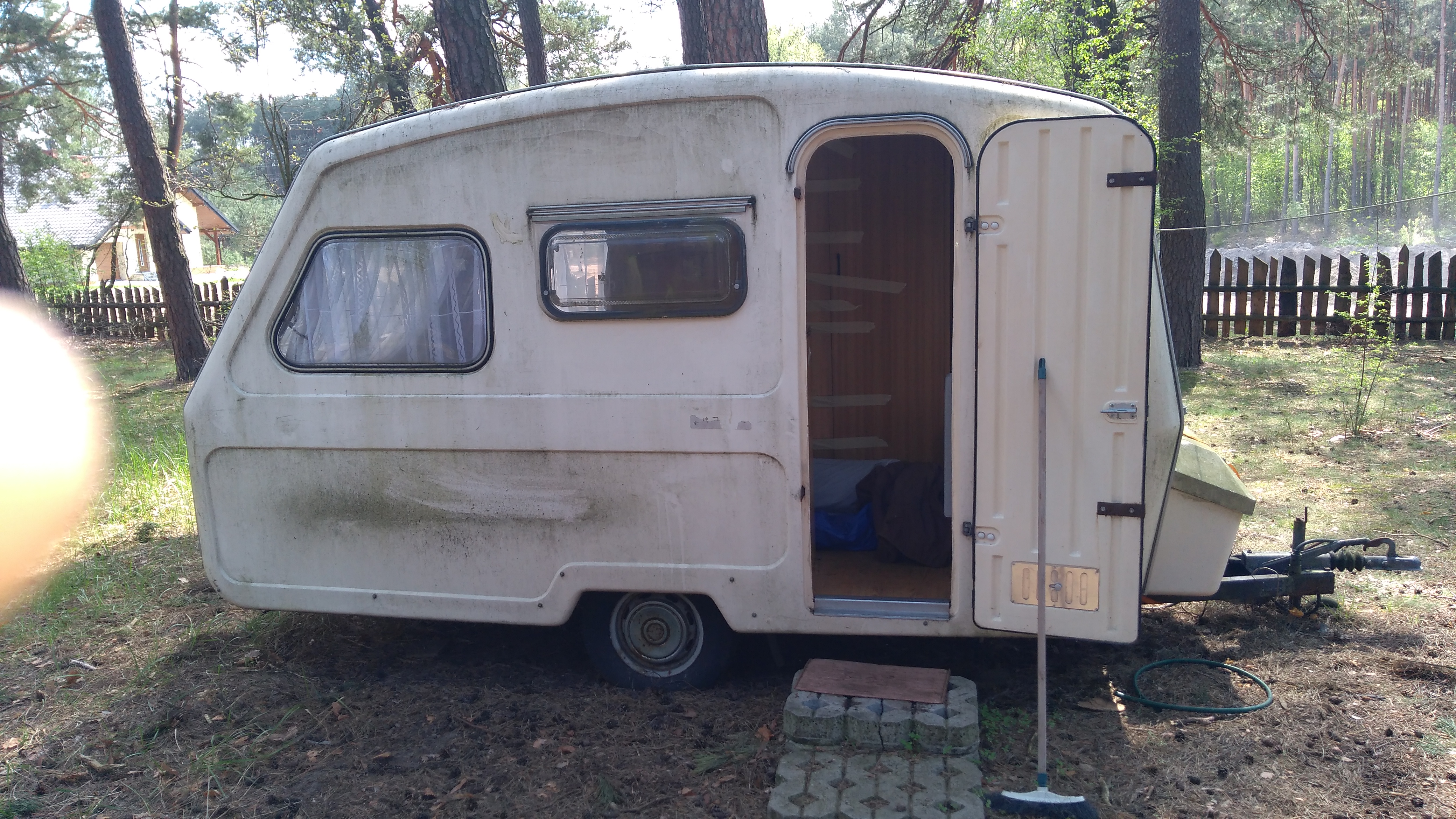 Przyczepa ma hamulec najazdowy który o dziwo działa nawet ręczy jest sprawny,wszystkie okna w całości, podwójne zamykane na trzy zamknięcia,oryginalna książka fabryczna,oryginalny przedłużacz na drewnianej rolce,nowa lodówka TA60,nowy przedsionek ,wszystkie mebelki całe, jedynie brakuje umywalki w toalecie i tej klamki z drzwiczek.