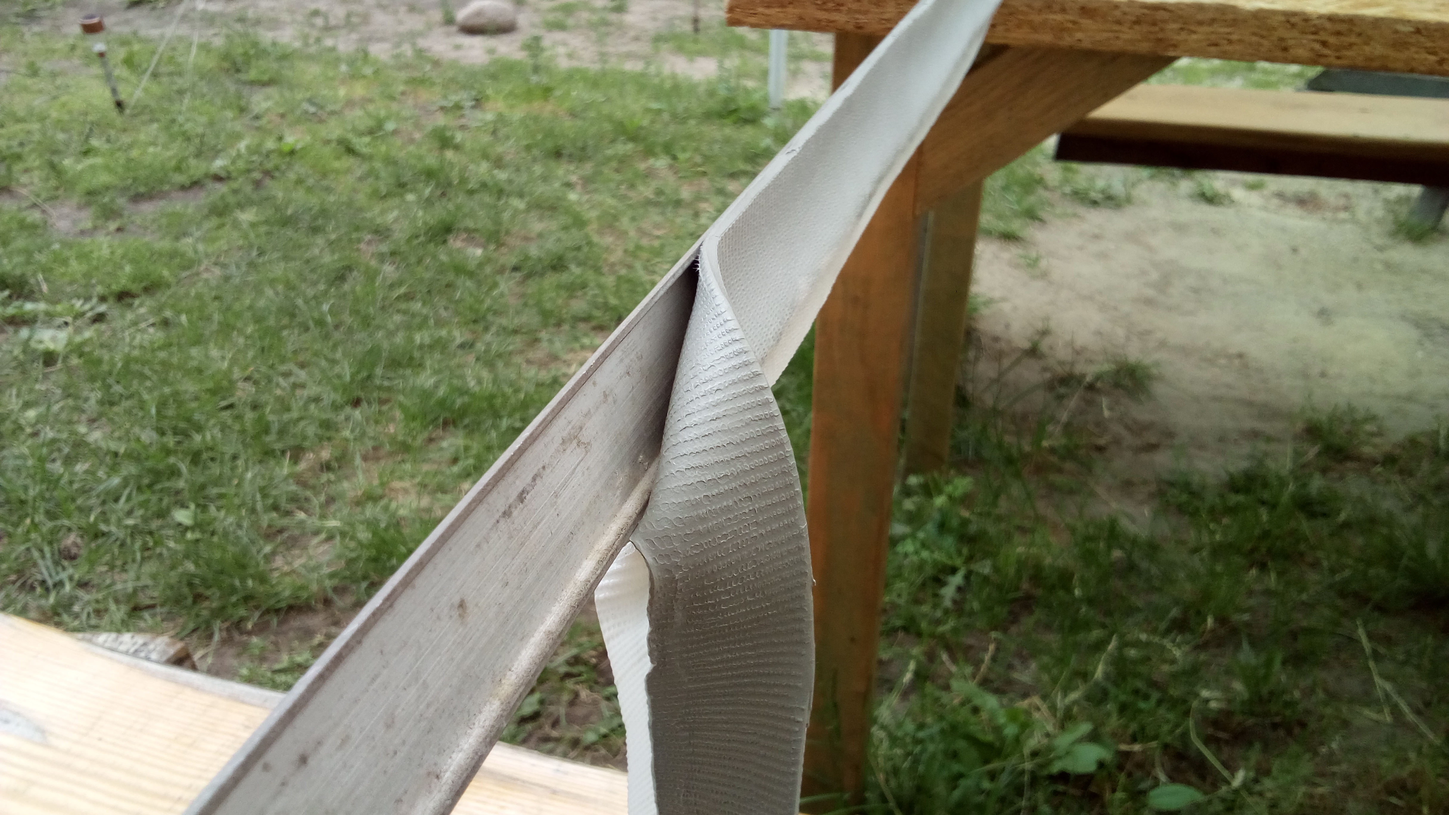 Rada dla potomnych - jak bym robił jeszcze raz, też bym kupił 50, ale już nie ciął bym jej na pół. Z tego co kojarzę, listwy nie są równej szerokości, ale nie o to chodzi. Chodzi o to, że po przecięciu mamy te taśmy za szerokie! Uciął bym tyle, aby nie wystawało poza listwę, szczególnie listwa, gdzie wpychamy przedsionek. Podczas skręcania listew nadmiar taśmy wychodzi i to dużo. Na chwilę obecną nie wiem jeszcze jak usunąć ten nadmiar z listwy do przedsionka - nie pozwoli mi wepchnąć sznura, będzie się czepiać i klinować. Bez usunięcia na równo z krawędzią przy budzie nie ma co podchodzić z przedsionkiem. Podejścia nie ma za bardzo, bo jest ten rant co siedzi w nim przedsionek. Musze jakieś zmyślne urządzenie tnąco - zbierające zaprojektować i zebrać tą taśmę. Kopa normalnie :-(.