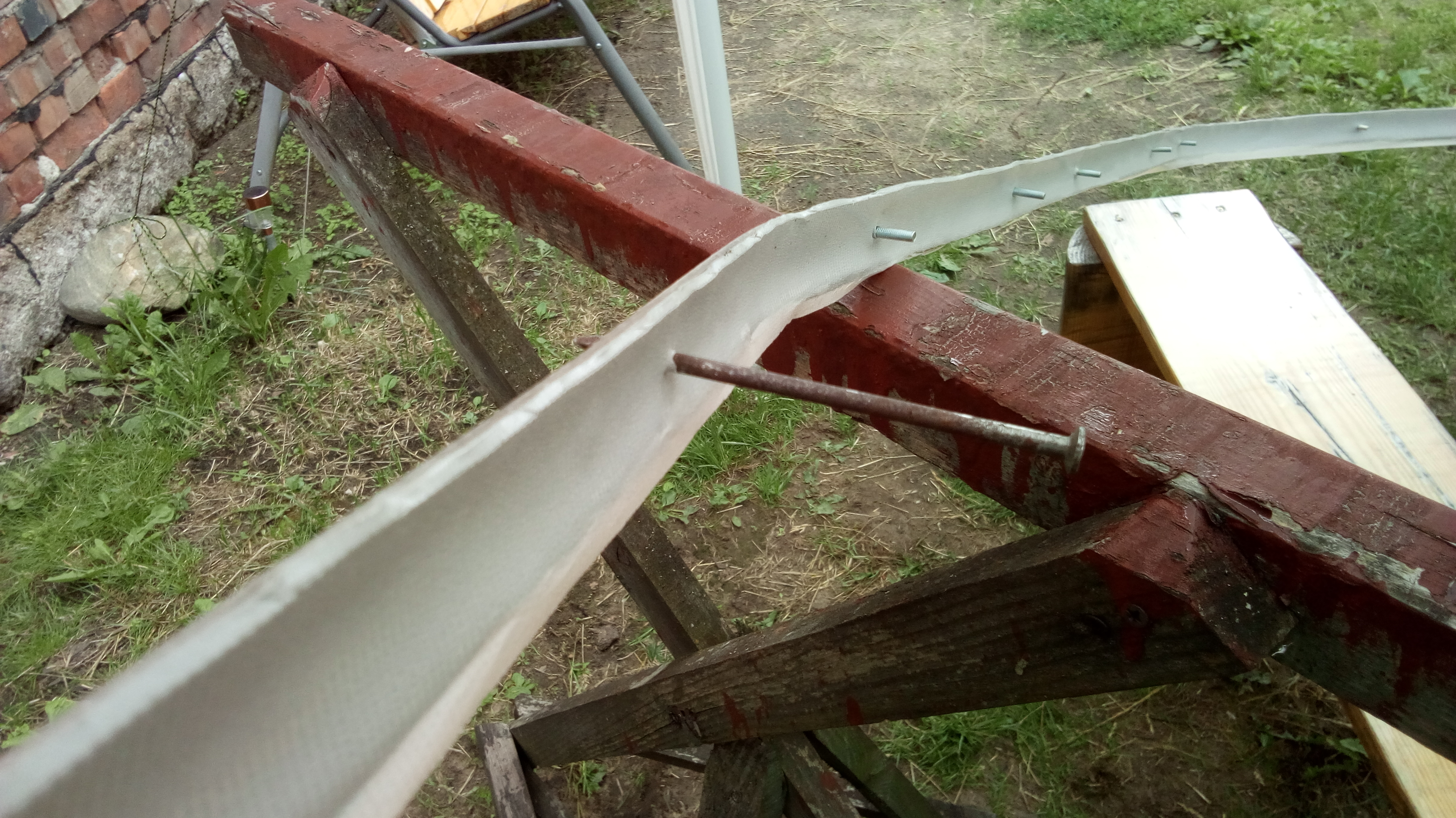 Kolejna rzecz to zrobienie nowych otworów w listwach ozdobnych i budzie. Chciałem aby nie przesunęły się względem starego położenia, coby na nowo nie formować jej na rogach i nawet się udało. Kilkoma śrubkami ją złapałem i dzień mi się skończył. Aby pierwszą dobrze zrobić, to potem tylko przyciskać po kolei i wiercimy. Potem i tak jeszcze będzie do zdjęcia, bo taśmę butylową jeszcze trza zapodać. Ale to później.