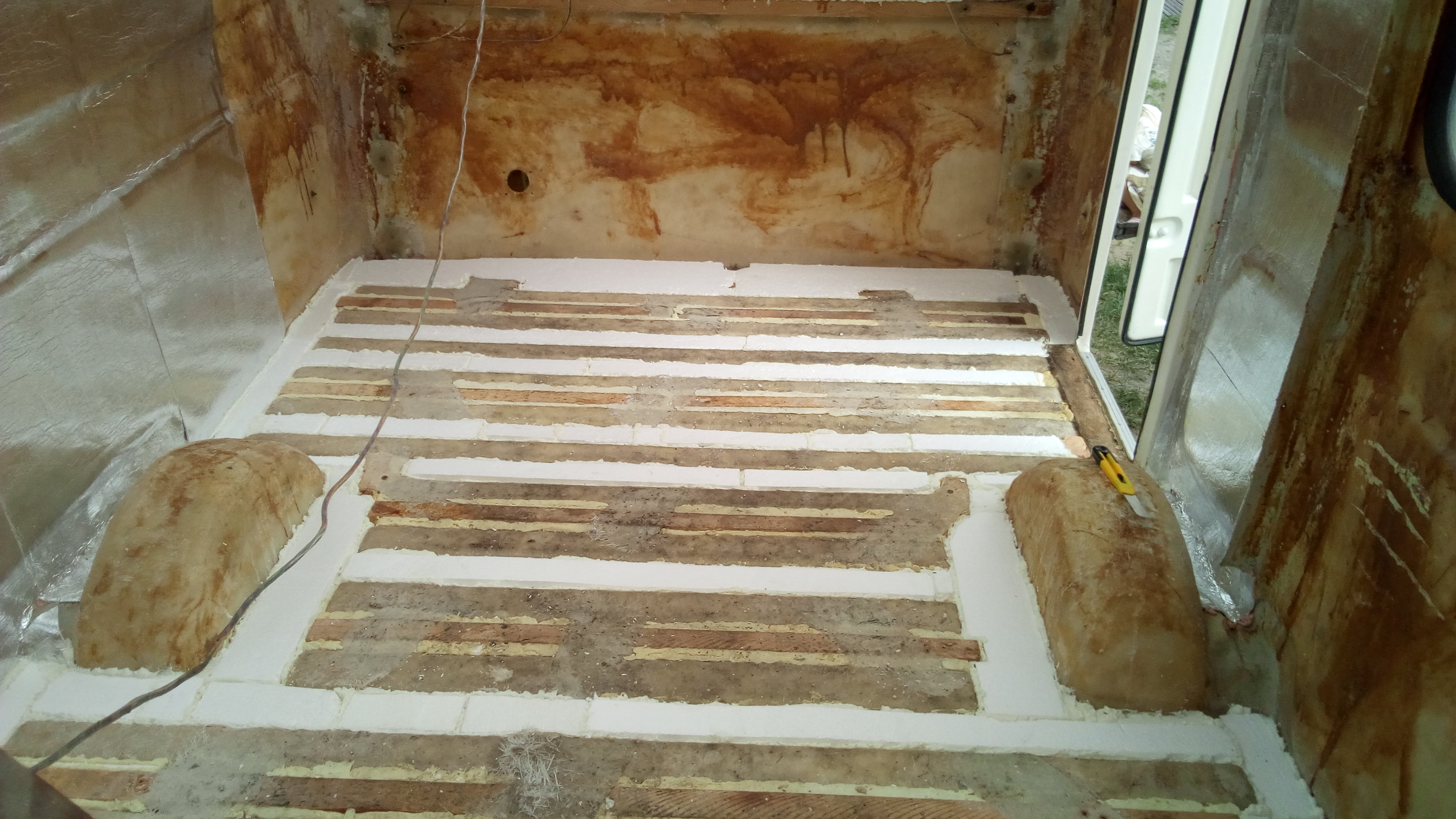 Następnym etapem była podłoga. Co się dało oczyściłem, odkurzyłem. We wręgi powklejałem styropian na pianę: