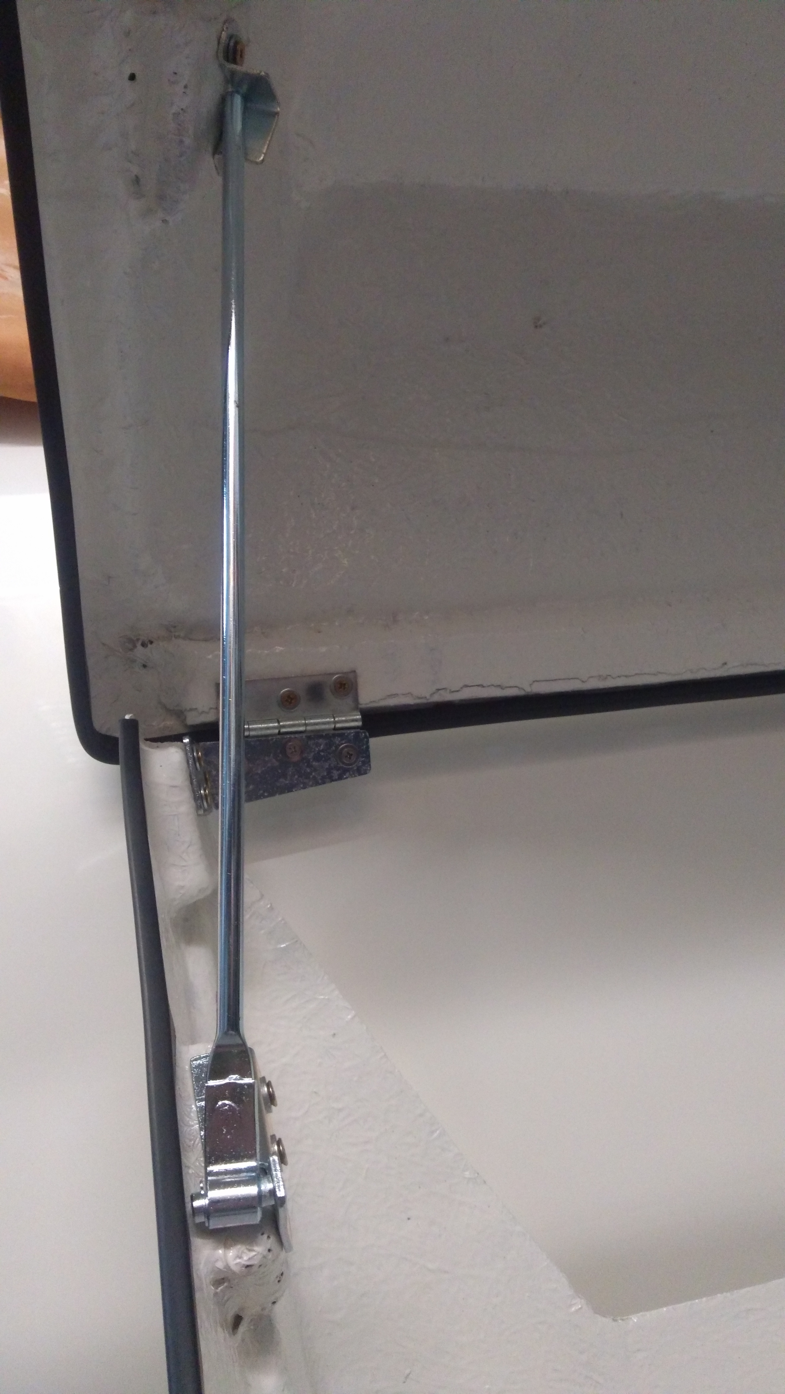 To jeszcze trzeba zacząć od tego, że zawias jest przykręcony do kątownika, a ten przykręcony jest do drewnianych klocków wlaminowanych na górze boku kufra.
