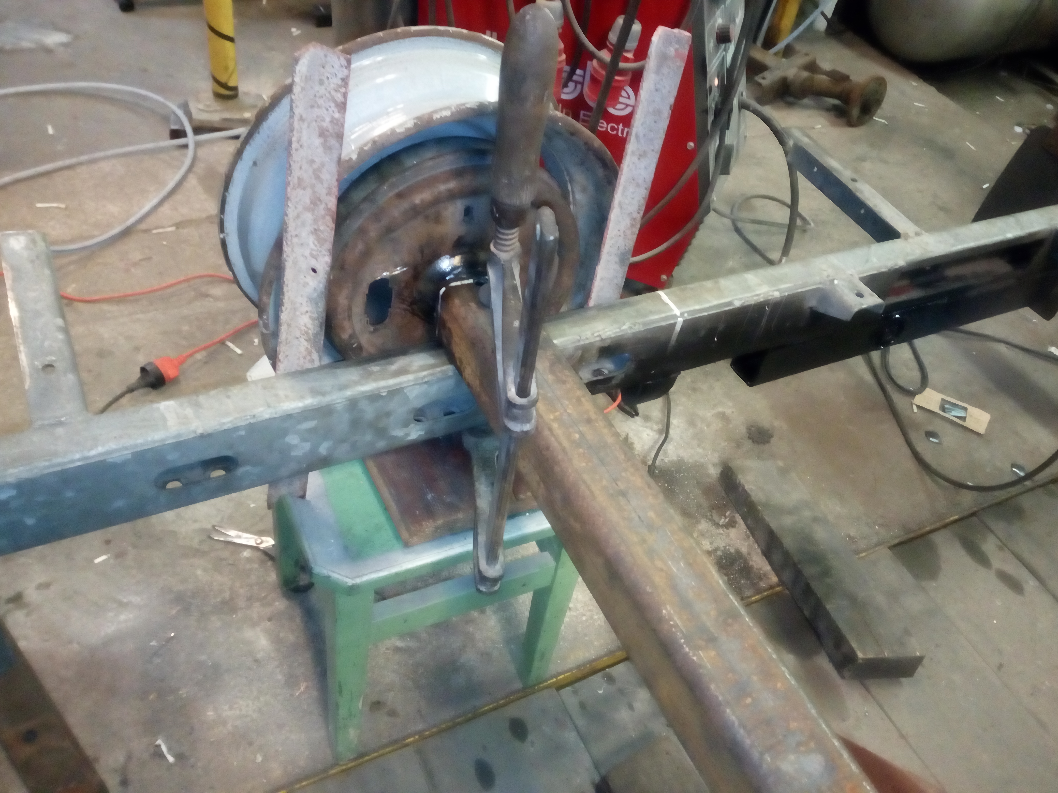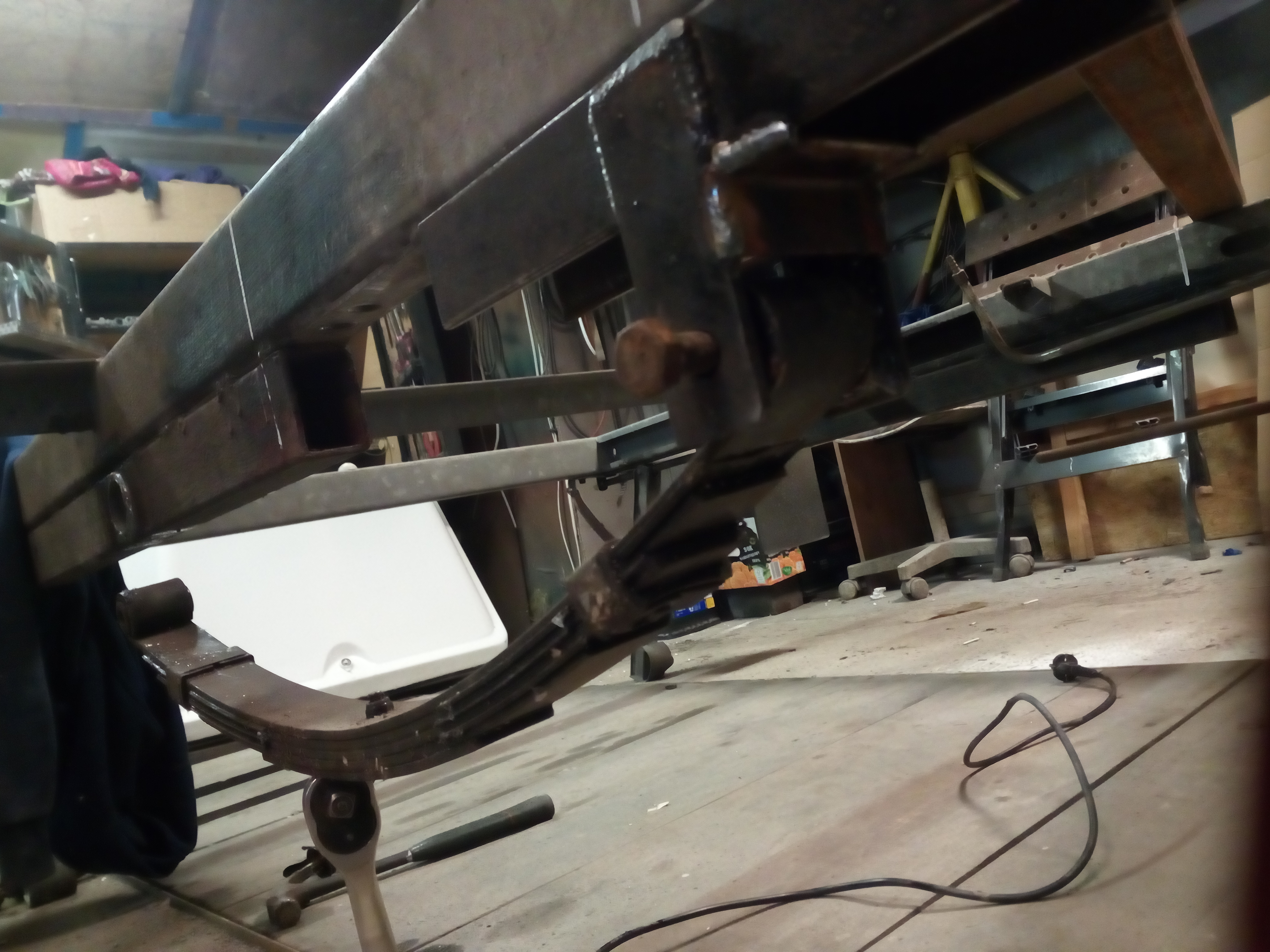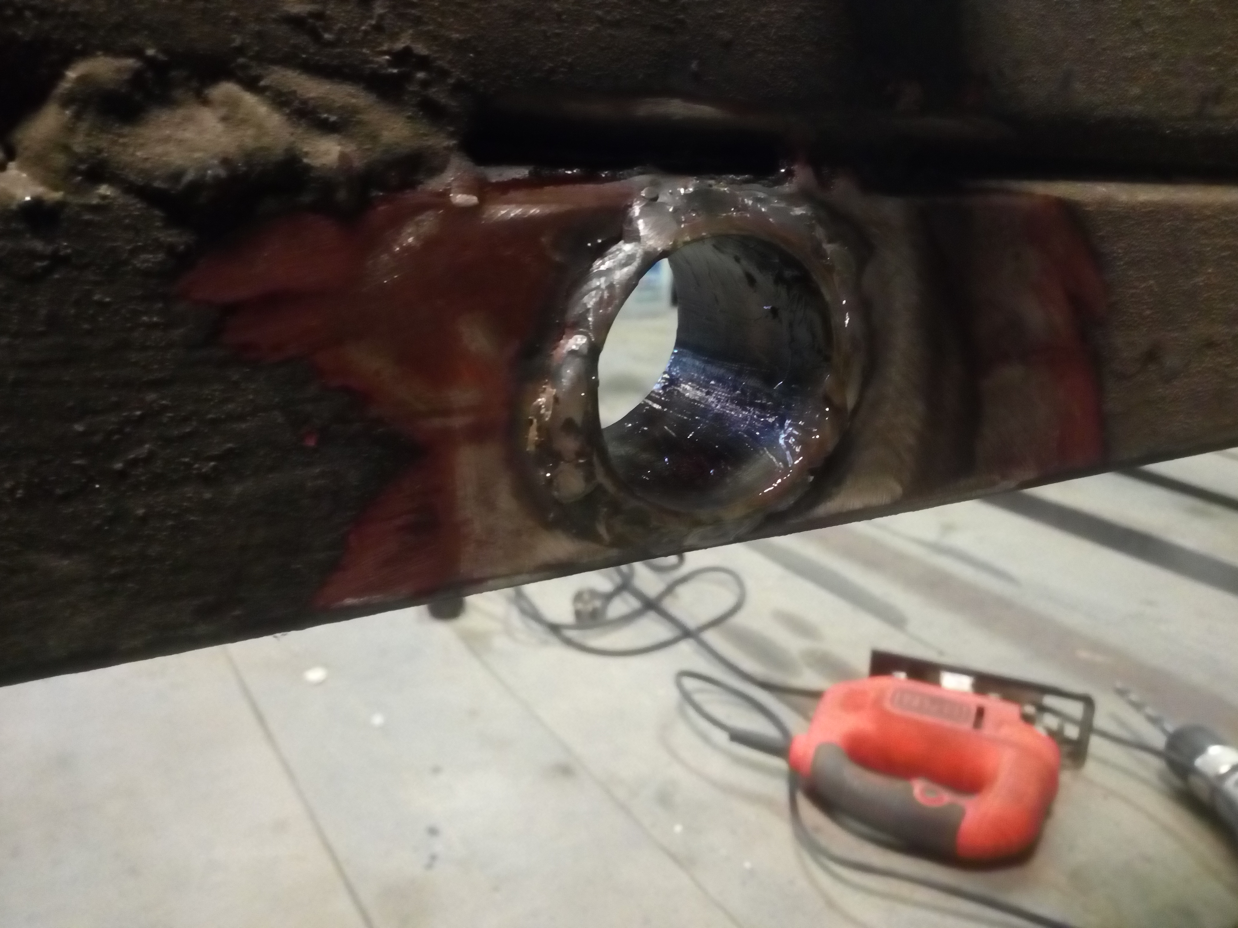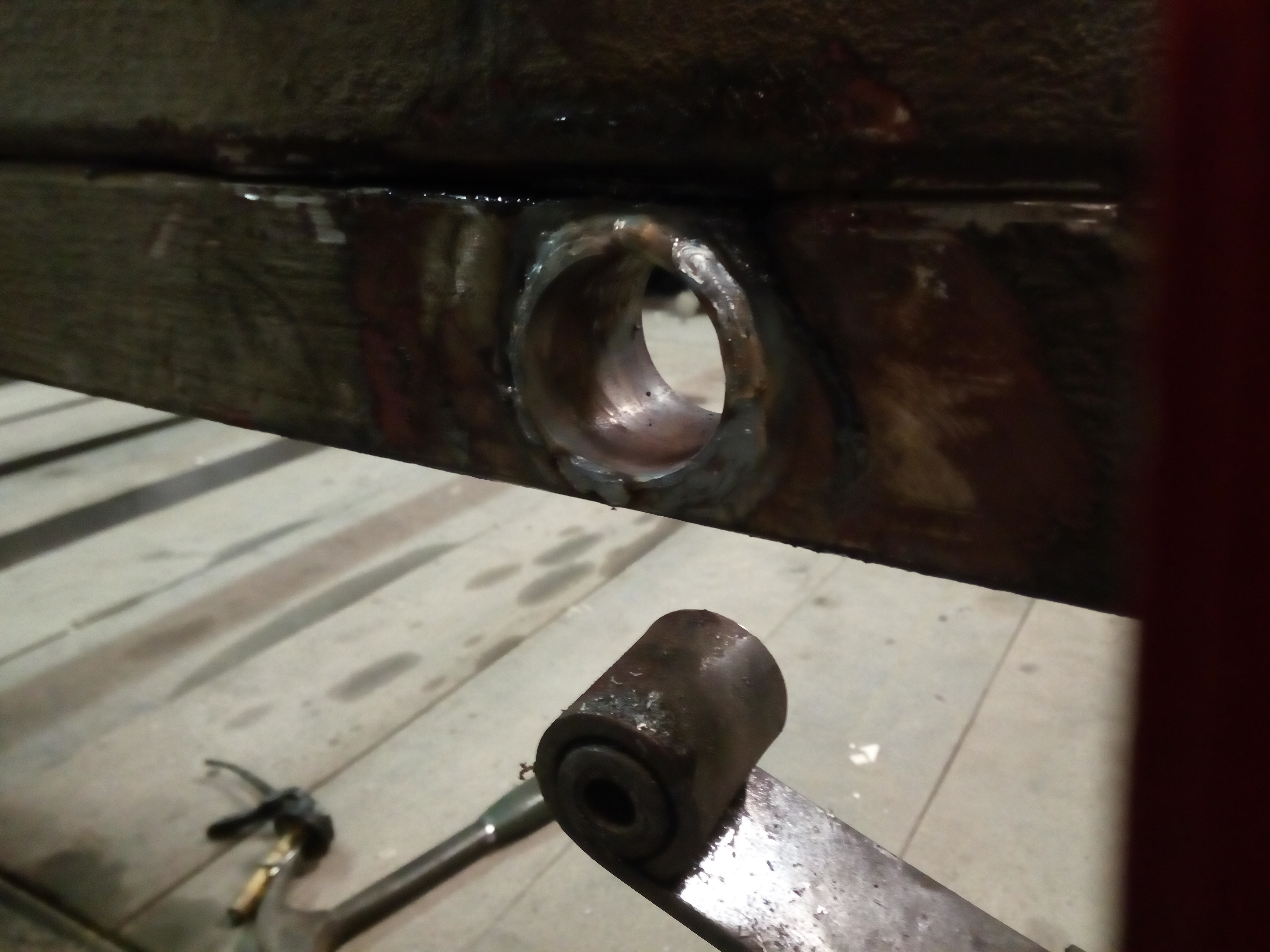 Miałem kupować nową oś Al-ko, ale od ręki nie było termin realizacji !!2!!miesiące to szybciej na resor przerobię. I tak jak na zdjęciach jakiś ktoś wspawał te kształtowniki nie wiem po co rama prosta nie pogięta nie spawana a tu coś takiego... Próbowałem to odciąć, ale daj spokój postanowiłem to wykorzystać otworem i w to wcisnę tuleje, a z przodu takie cos co w razie można będzie odkręcić i dać oś skrętną. Pozostaje tylko powtórzyć czynność z drugiej strony zrobić wieszki i wsadzć to ogrągłe w kwadratowe.