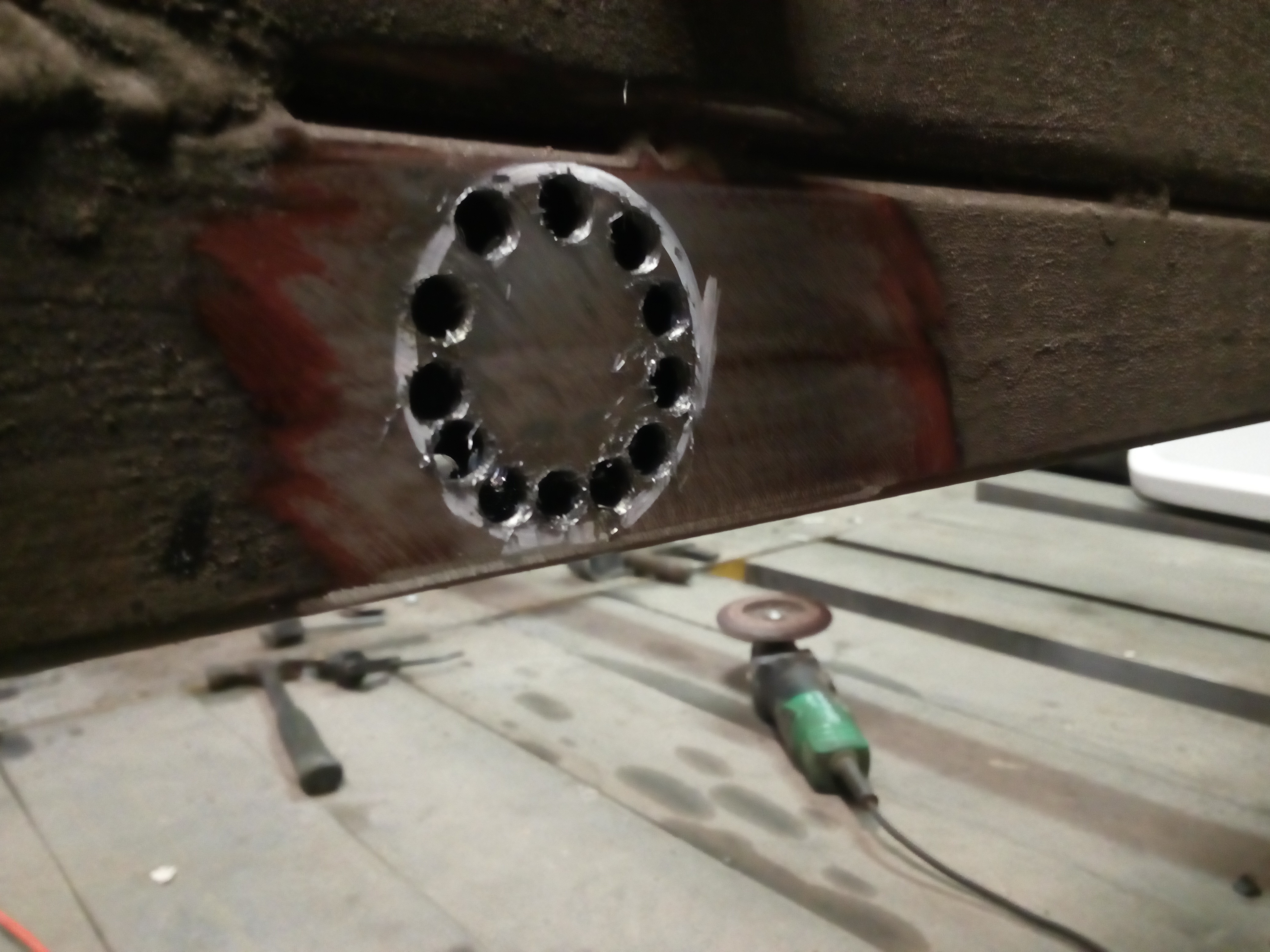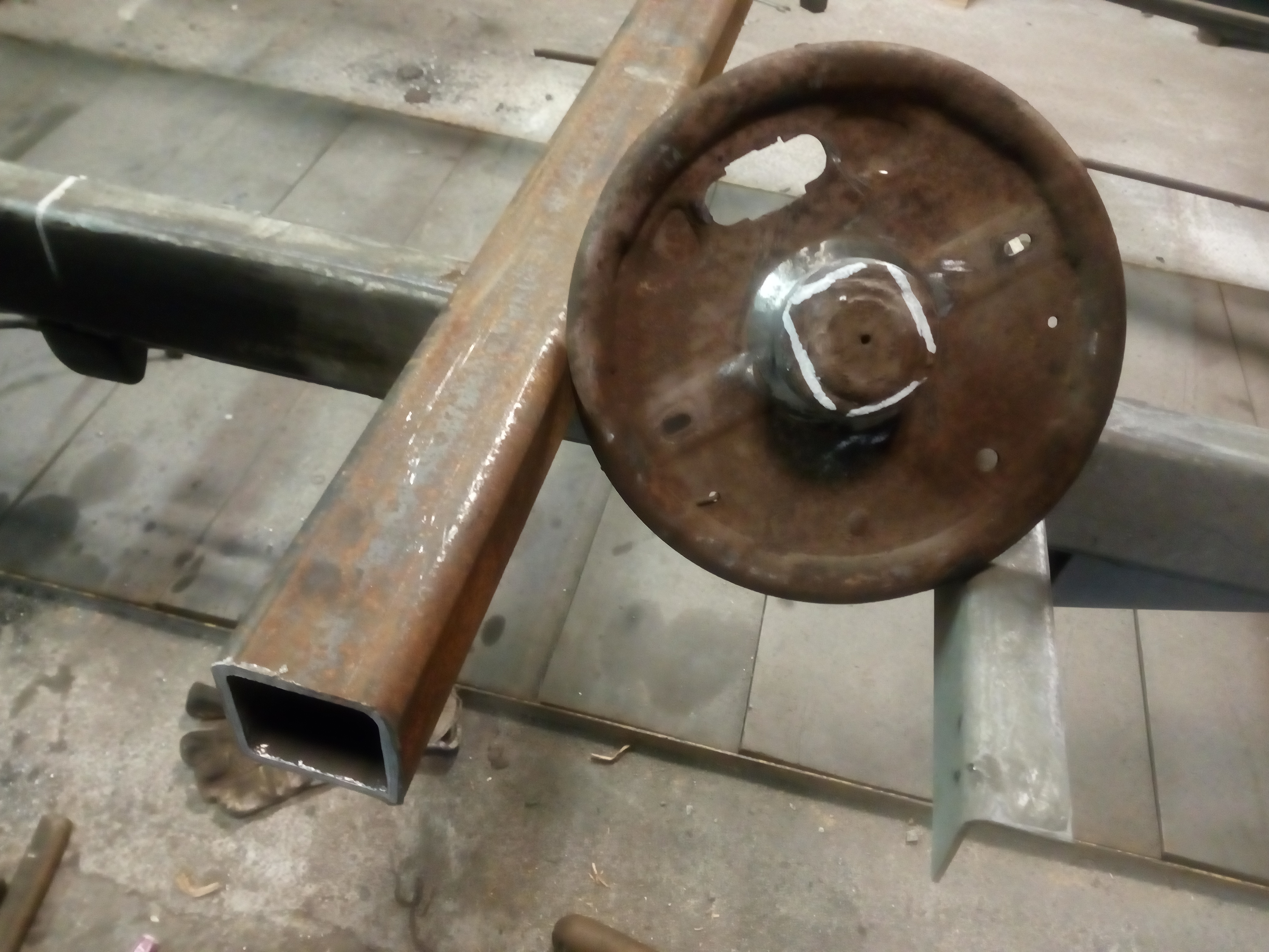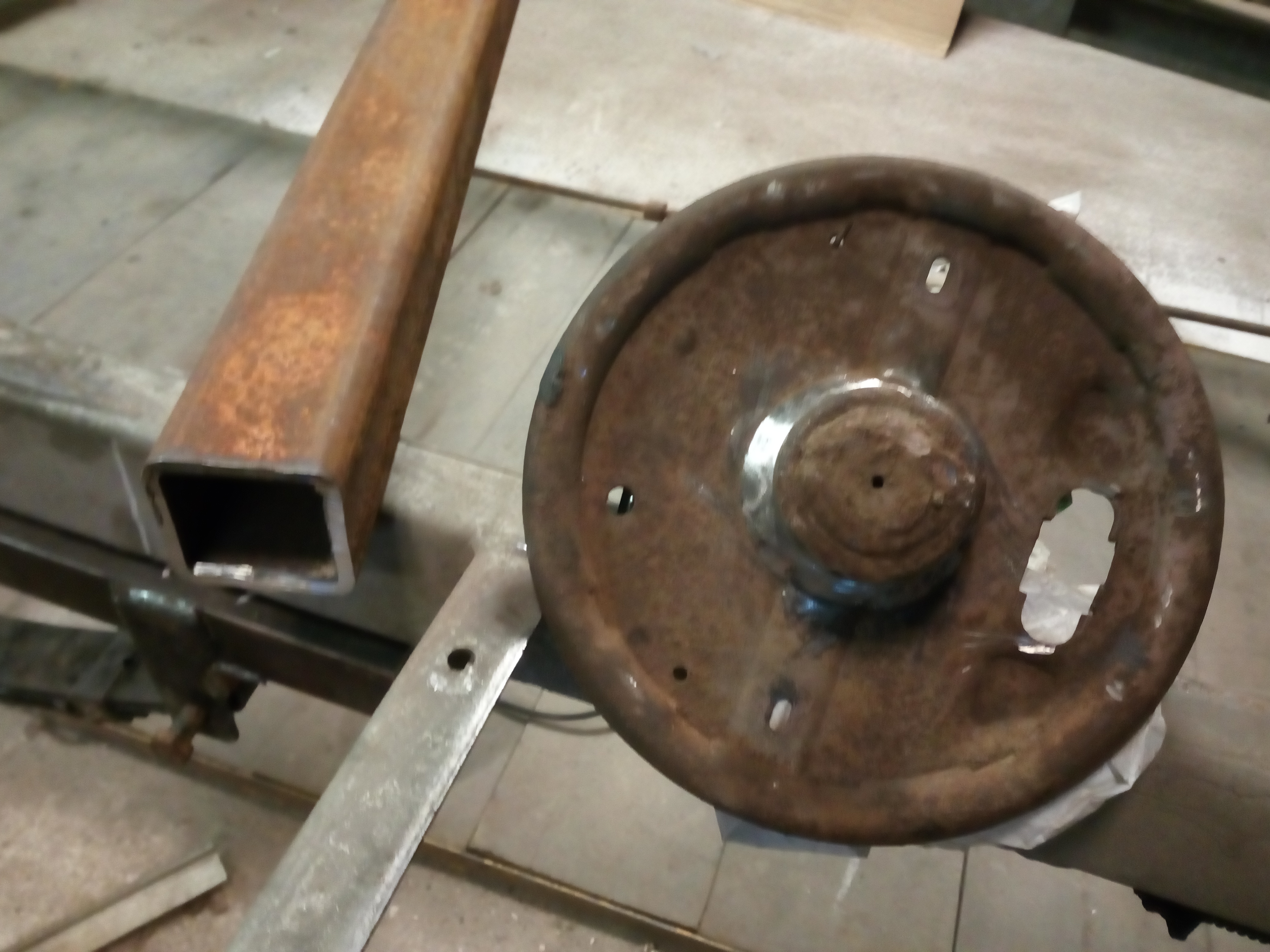 Miałem kupować nową oś Al-ko, ale od ręki nie było termin realizacji !!2!!miesiące to szybciej na resor przerobię. I tak jak na zdjęciach jakiś ktoś wspawał te kształtowniki nie wiem po co rama prosta nie pogięta nie spawana a tu coś takiego... Próbowałem to odciąć, ale daj spokój postanowiłem to wykorzystać otworem i w to wcisnę tuleje, a z przodu takie cos co w razie można będzie odkręcić i dać oś skrętną. Pozostaje tylko powtórzyć czynność z drugiej strony zrobić wieszki i wsadzć to ogrągłe w kwadratowe.