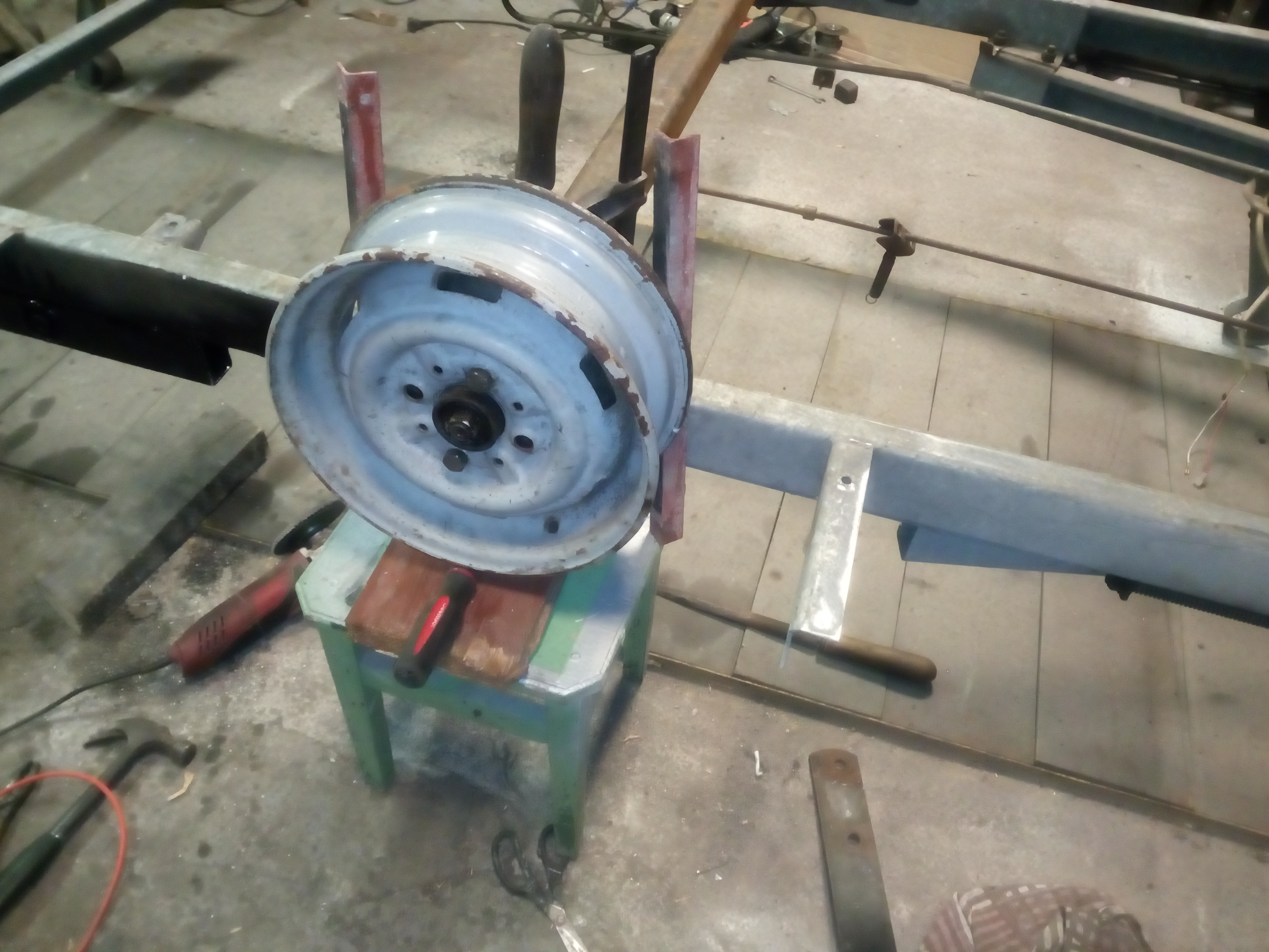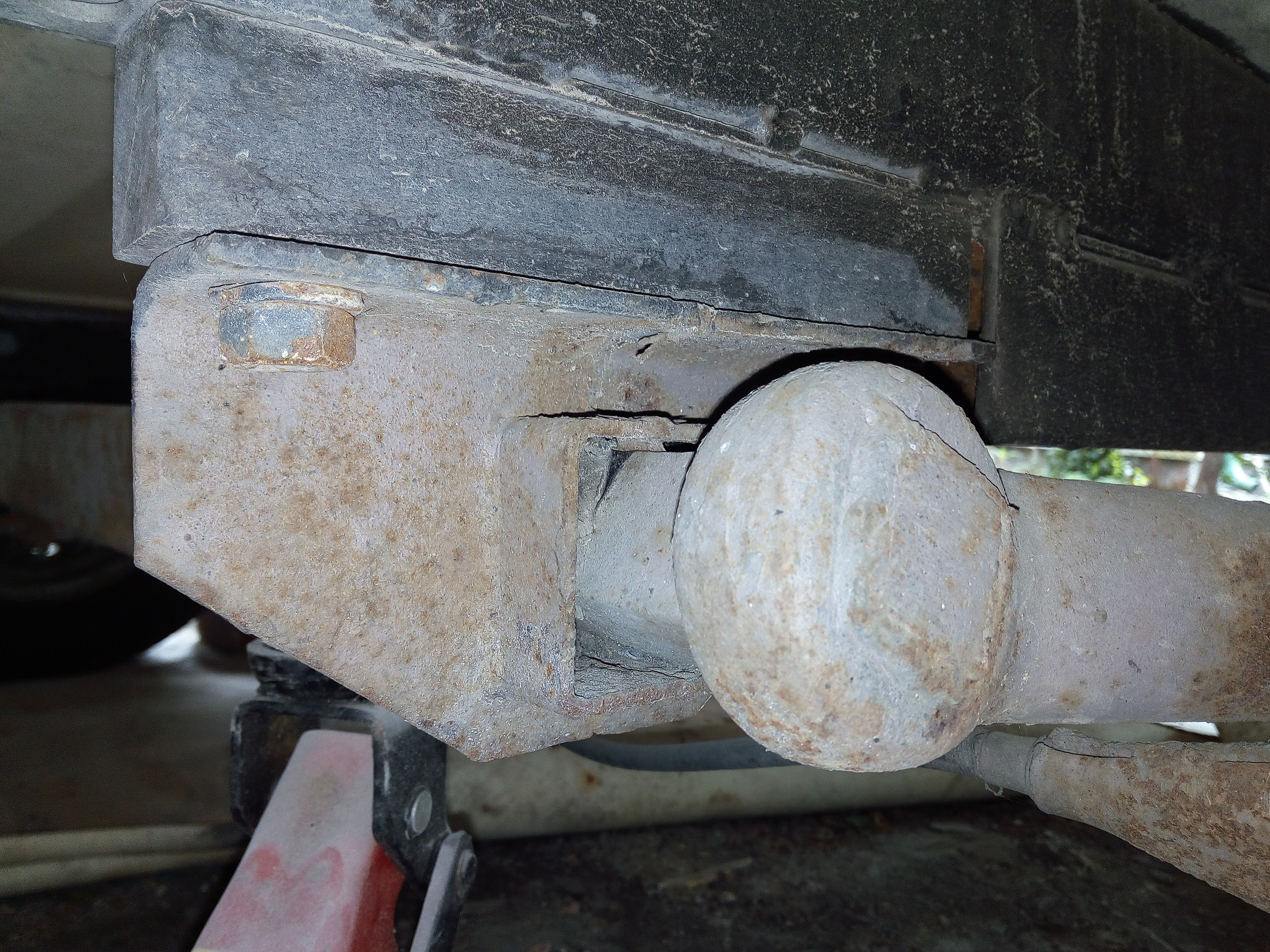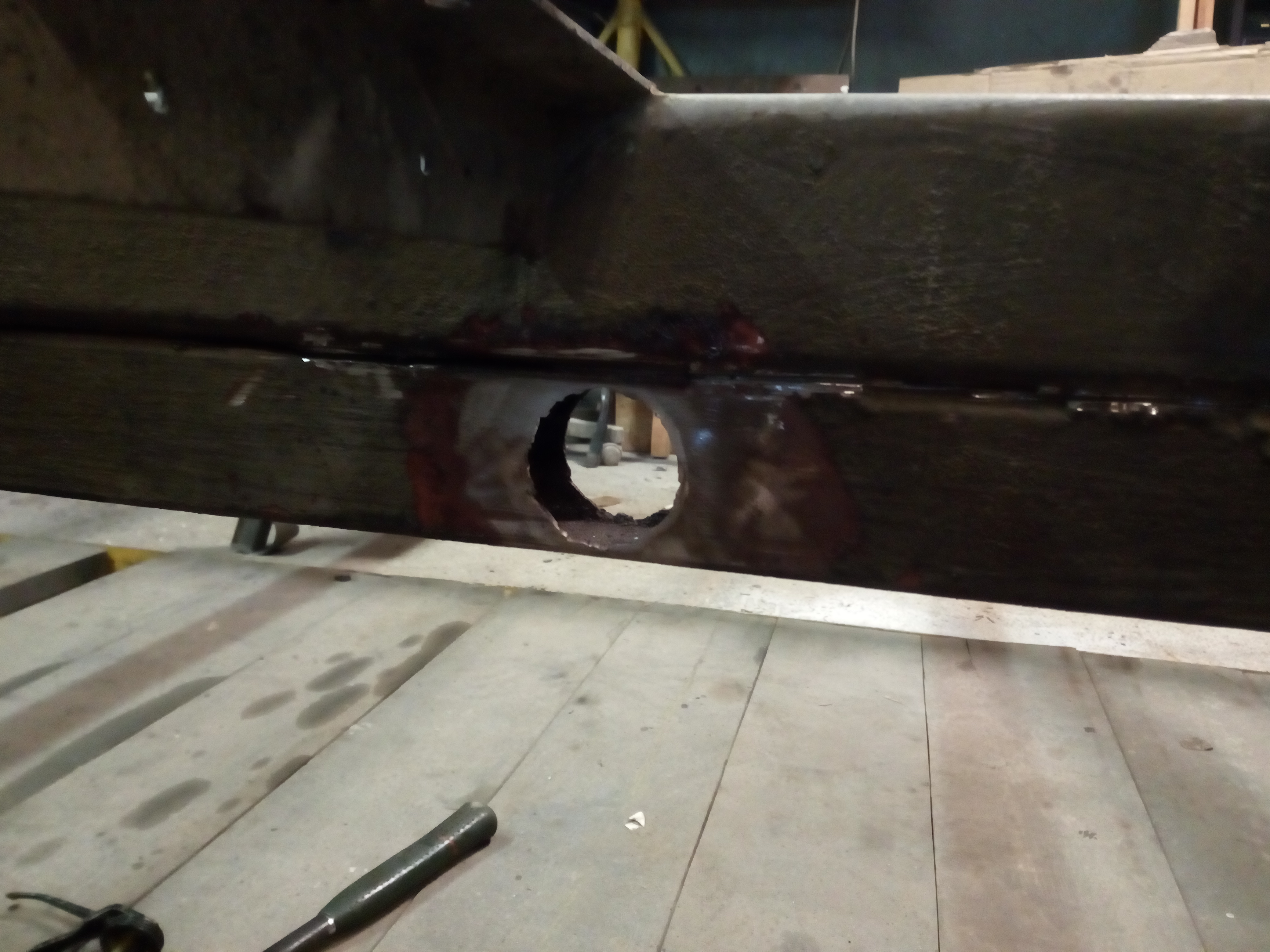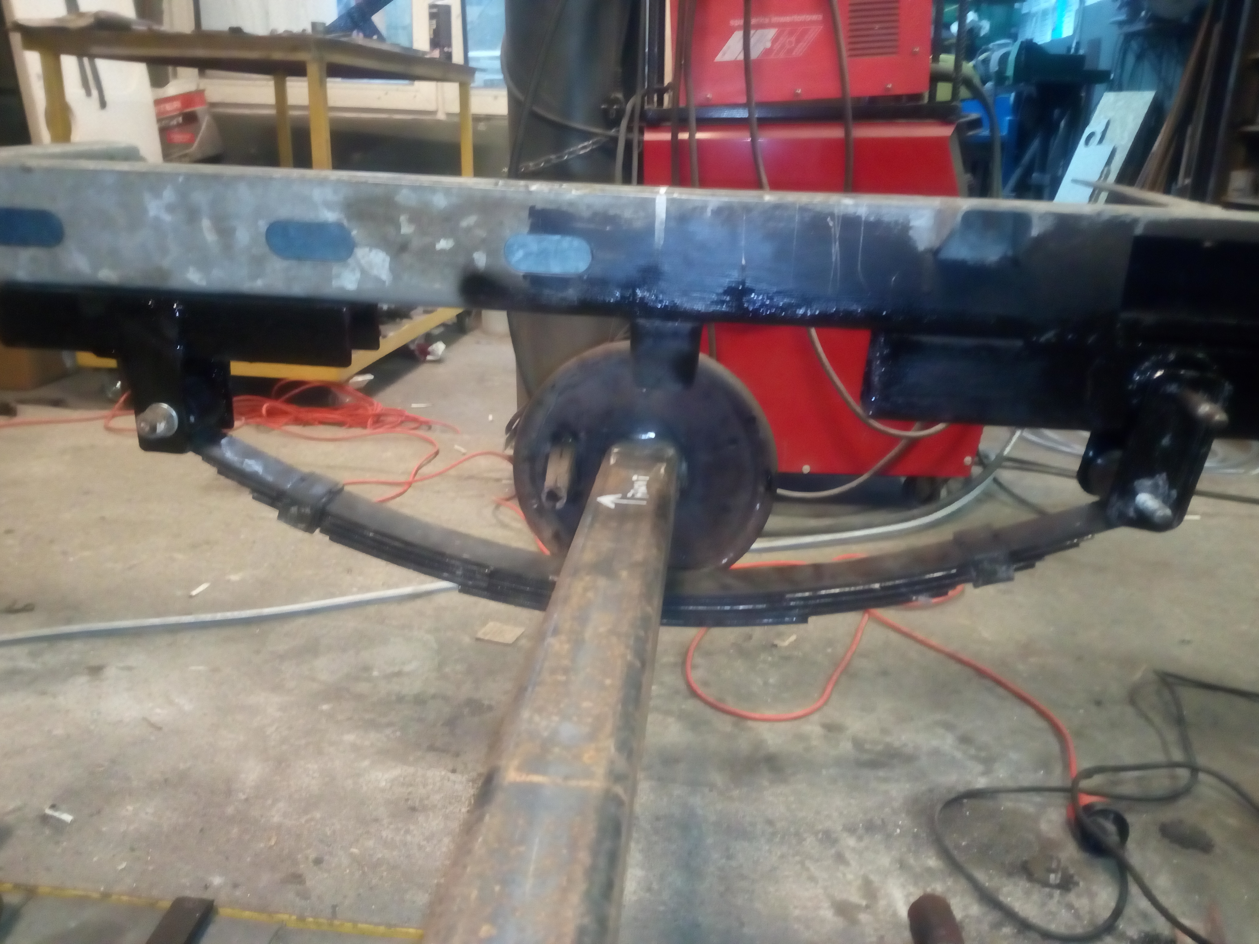 Miałem kupować nową oś Al-ko, ale od ręki nie było termin realizacji !!2!!miesiące to szybciej na resor przerobię. I tak jak na zdjęciach jakiś ktoś wspawał te kształtowniki nie wiem po co rama prosta nie pogięta nie spawana a tu coś takiego... Próbowałem to odciąć, ale daj spokój postanowiłem to wykorzystać otworem i w to wcisnę tuleje, a z przodu takie cos co w razie można będzie odkręcić i dać oś skrętną. Pozostaje tylko powtórzyć czynność z drugiej strony zrobić wieszki i wsadzć to ogrągłe w kwadratowe.