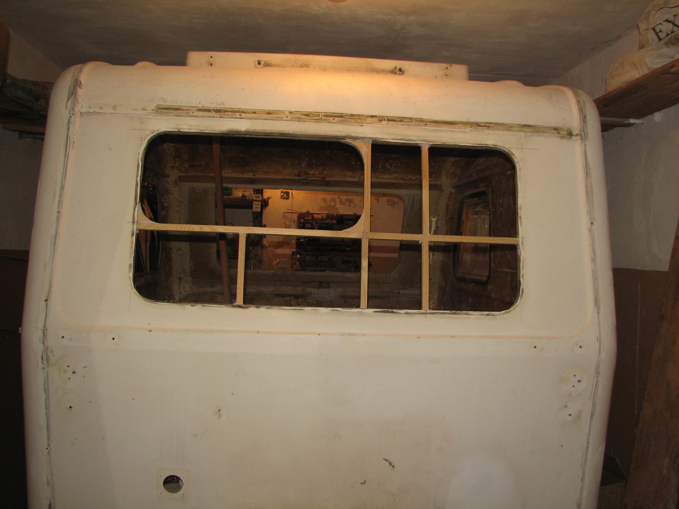 Powoli robota posuwa się do przodu. Zalaminowałem od wewnątrz wszystkie otwory po śrubach mocujących listwy, po przednich lampach pozycyjnych i bocznych odblaskach. Zalaminowałem też wreszcie okno przednie. Poszły 2 warstwy maty szklanej 150 g/m.kw.