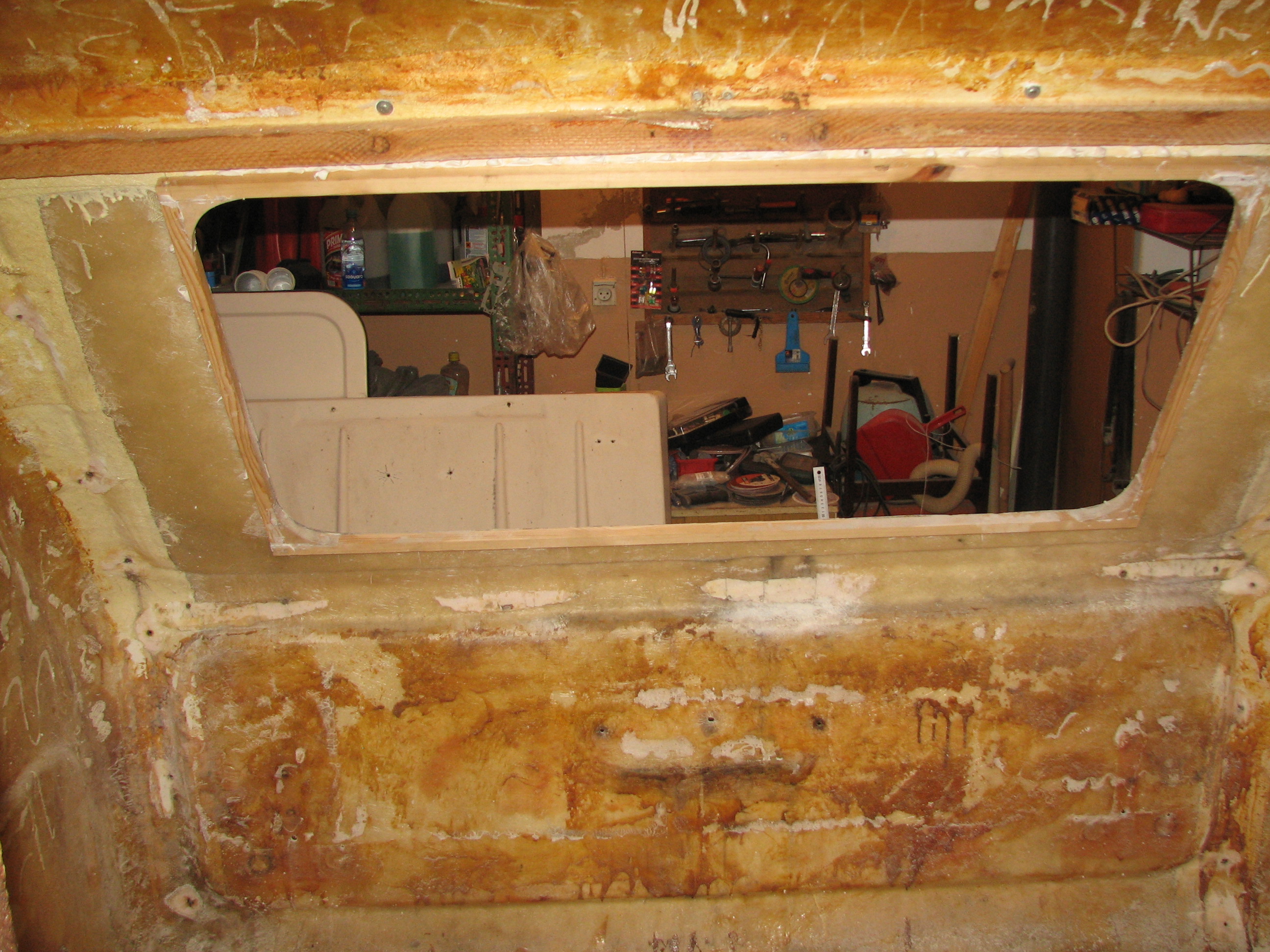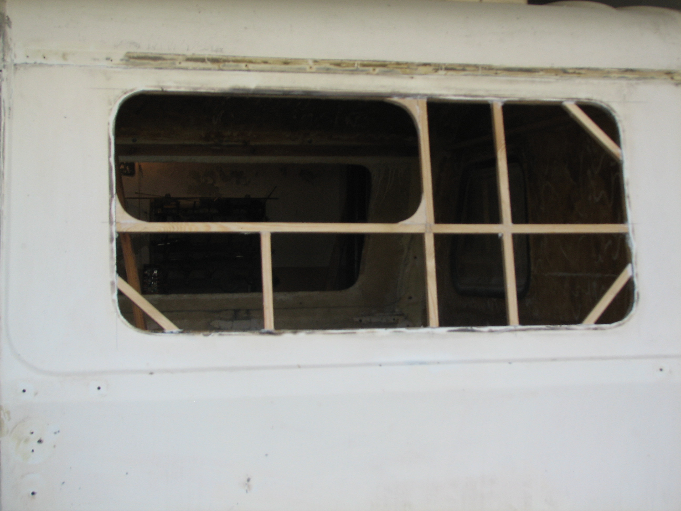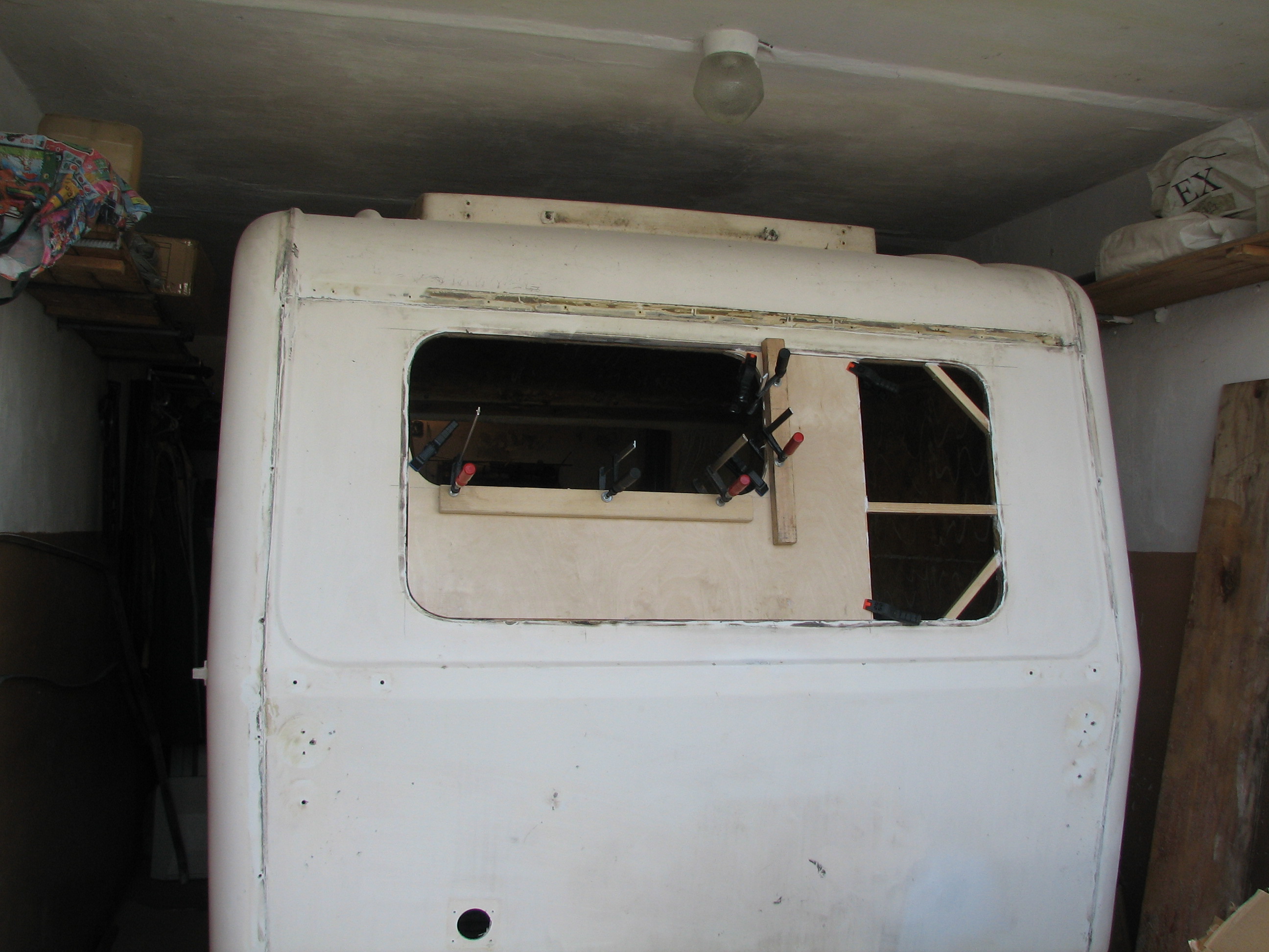 Teraz nadszedł wreszcie czas na tworzenie czegoś nowego. Już kilka lat temu wyposażyłem moją przyczepę w toaletę. Ponieważ wtedy nie robiłem aż tak kapitalnego remontu, nie rozwiązałem problemu przedniego okna. Żeby nie stwarzać na campingu dodatkowych atrakcji, część szyby zachodzącą na kabinę toaletową wyłożyłem matową folią, ale pozostał problem otwierania okna, bo dwa z czterech zaczepów zamykających okno były dostępne z toalety. W związku z tym postanowiłem wymienić przednie okno. Zastanawiałem się nad zastosowaniem oryginalnej szyby od N126et, ale była ona trochę za szeroka i zmusiłoby to do powiększenia otworu okiennego w kierunku prawej ściany przyczepy. I wtedy trafiłem na szybę nadkuchenną od starszej wersji N126n. Wymaga ona otworu okiennego o wymiarach 700x300 mm, co umożliwia pozostawienie prawej krawędzi otworu okiennego na swoim miejscu. Wydaje mi się też, że wyżej położone, węższe okno ułatwi korzystanie z kuchni przy otwartym oknie. Dotychczas zdarzało się nie raz, że przy otwartych drzwiach i oknie przeciąg zdmuchiwał płomień na kuchence. Trzeba więc było przerobić otwór okienny. Wykonałem z listew szkielet i wstawiłem w otwór okna. Do montażu i wklejenia szkieletu użyłem niezawodnego Mamuta Potem jeszcze dołożyłem skośne listewki w rogach, aby lepiej podeprzeć płytę wypełniającą otwór. Nie udało mi się, niestety, zdobyć kawałka laminatu na wypełnienie otworu, więc zdecydowałem się na sklejkę wodoodporną 3 mm. Będzie ona po obu stronach pokryta w całości warstwą tkaniny szklanej i żywicy, więc mam nadzieję, że nie będzie z tym kłopotów. Podczas prac destrukcyjnych usunąłem też laminatowe ekrany wokół okien. Przy demontażu tylnego ekranu zrobiło się drobne kuku i popękały listwy ramy okna. Zmusiło mnie to do wykonania nowej ramy i wklejenia jej na miejsce uszkodzonej. Mam jeszcze zamiar wzmocnić mocowanie tylnej ramy paskami tkaniny szklanej przylaminowanymi do ścian.