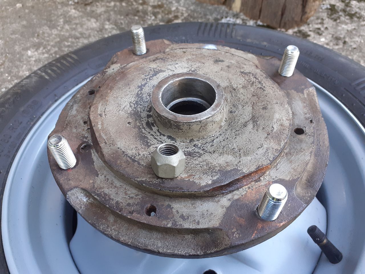 Dodatkowo zrobiłem znaczniki na nakrętkach, żeby od razu widzieć jak się któraś poruszy (zacznie odkręcać). Tak przejechałem ze 400 km, wszystko się trzyma, nakrętki nie drgnęły, więc zdecydowanie polecam taką przeróbkę, żeby uratować piastę. Można oczywiście przetulejować otwory, zrobić nowe gwinty, etc, ale metoda ze szpilkami zamiast śrub jest do zrobienia samodzielnie w średnio wyposażonym garażu i działa.