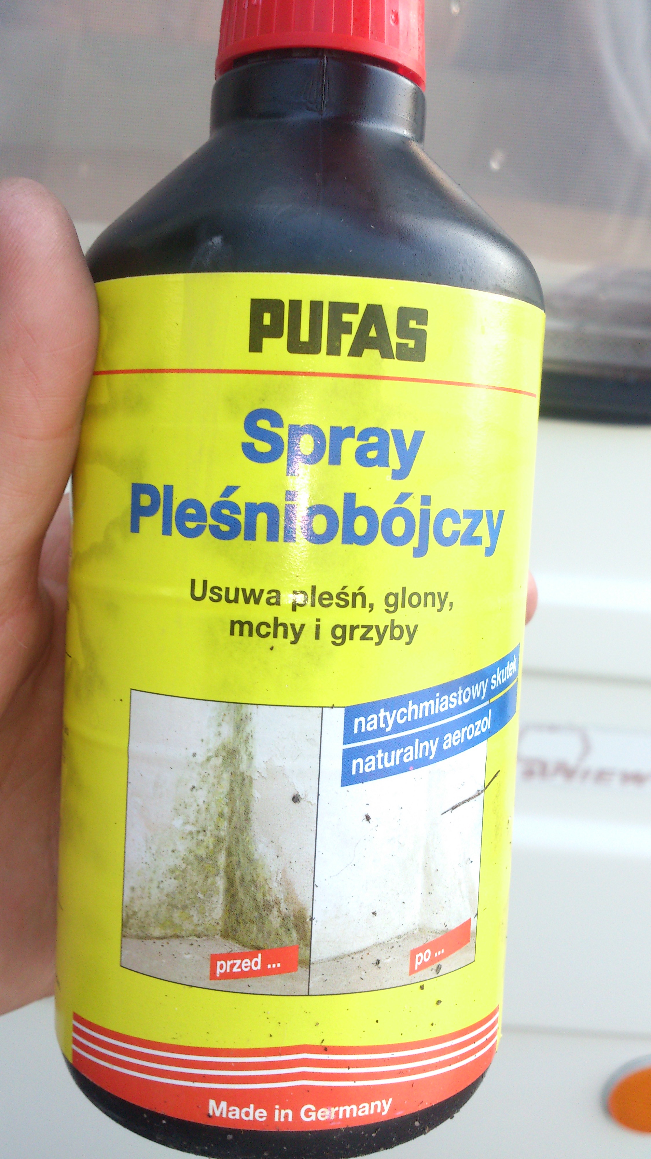 Na lewą stronę przyczepki zastosowałem środek Pufas sprzedawany w sklepach malarskich "Śnieżka". Jest to płyn gotowy do użycia jako spraj pleśniobójczy, nadaje się też do usuwania mchu , glonów i grzybów. Płyn nakładamy spryskując powierzchnię. Po 5-10 minutach osady można zmyć wilgotną szmatką. Efekt jest rewelacyjny, laminat bez dużego wysiłku zostaje oczyszczony i do tego jego powierzchnia uzyskuje lekki połysk.